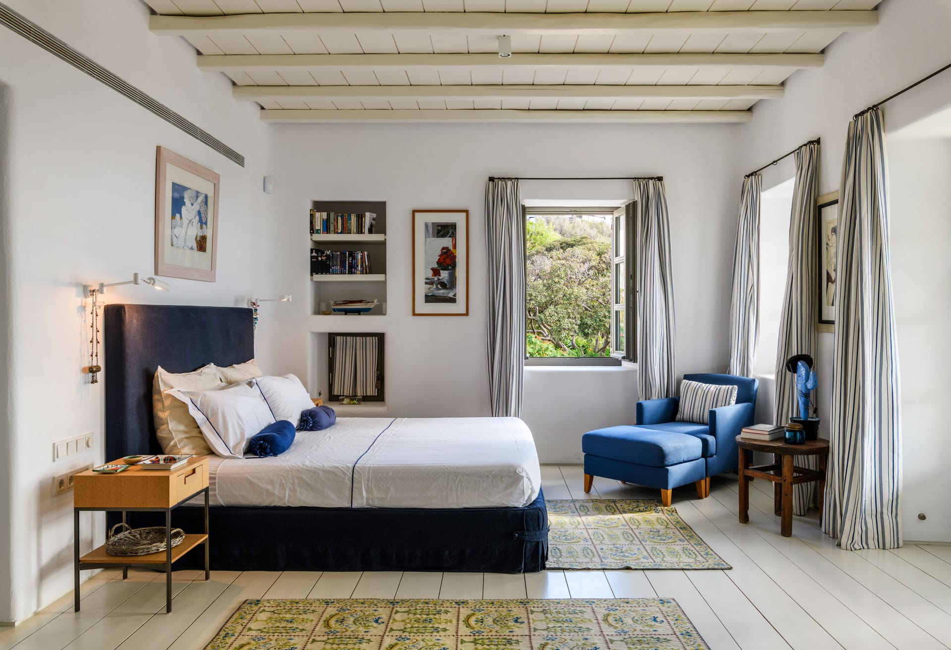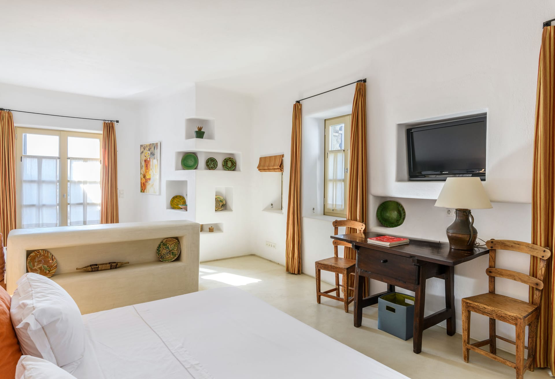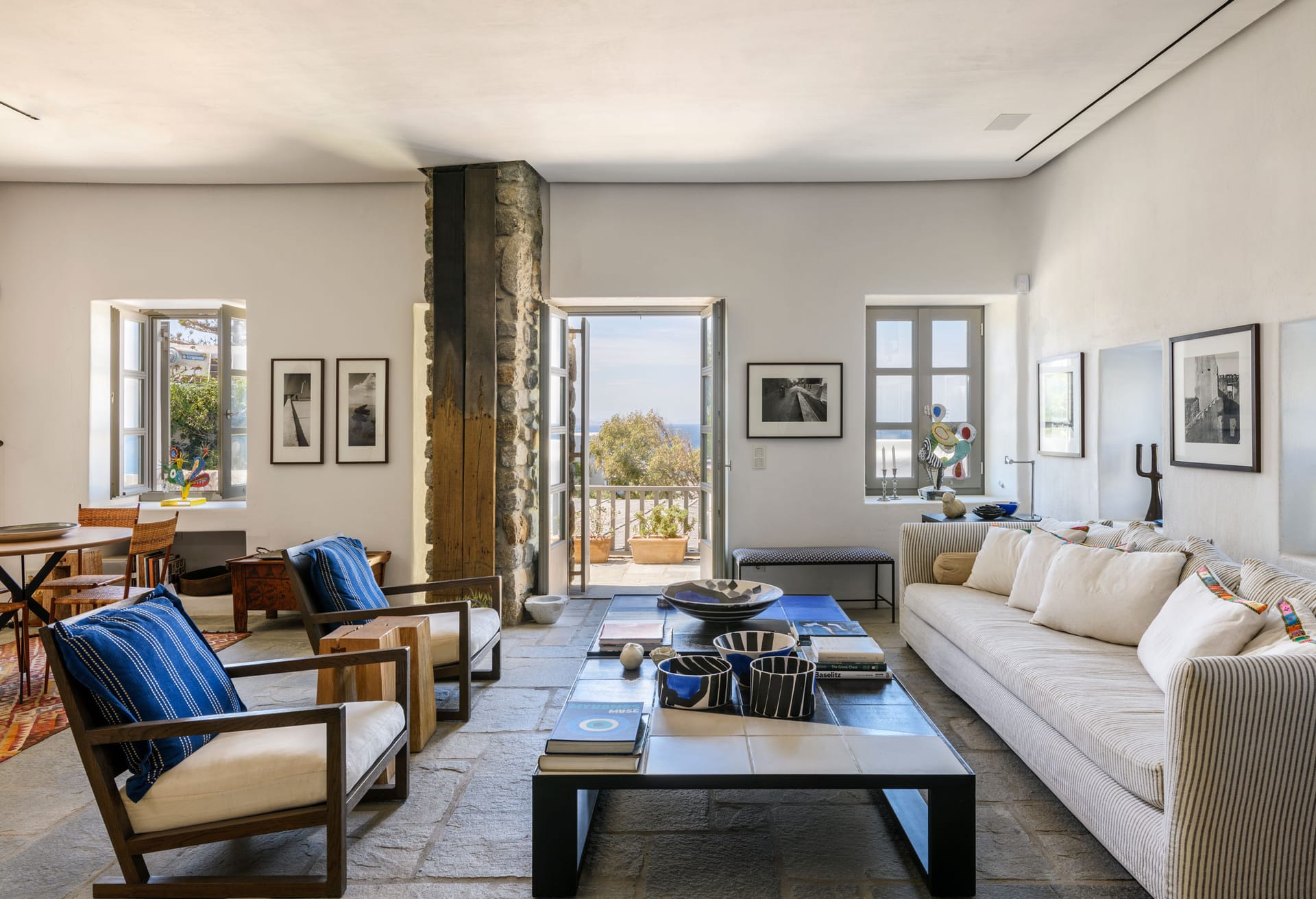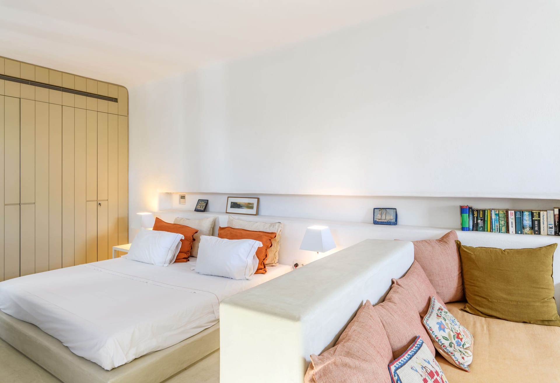 In walking distance to the night life of Mykonos Town, pure beach of Mykonos town, the villa boasts panoramic sea and sunset views. The architectural style is a modern take on traditional whitewashed Mykonian that boasts inspiring and tasteful interior design - featuring a minimalistic style with pops of color, patterns, thoughtful details, and earthy contrasts.