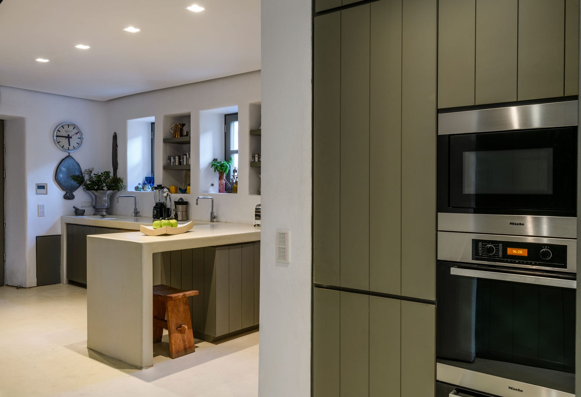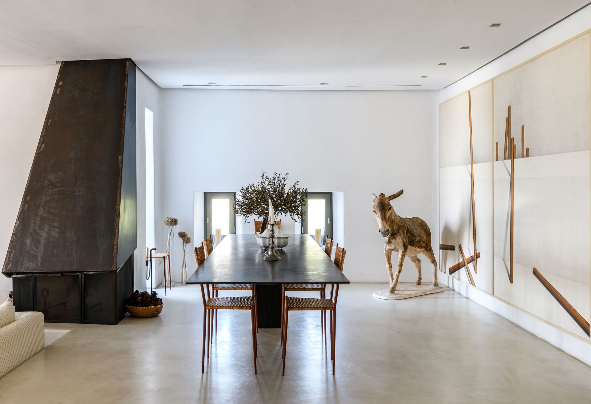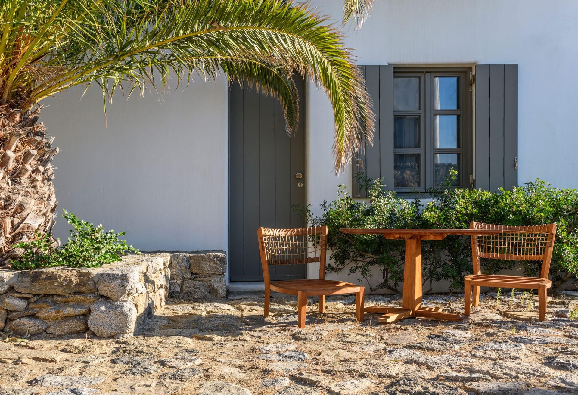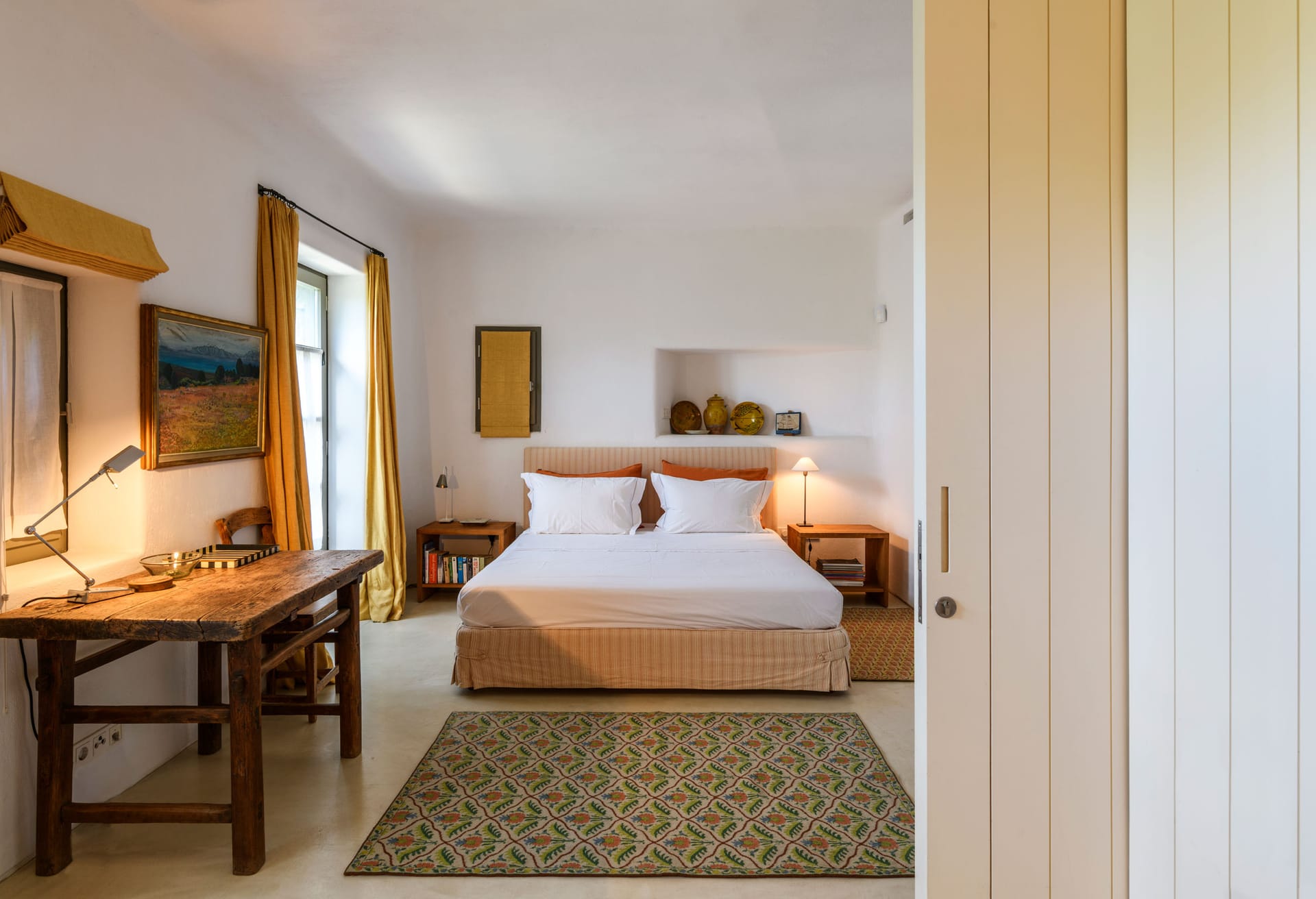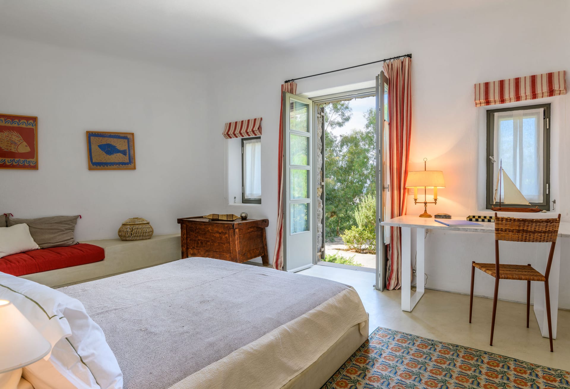 In walking distance to the night life of Mykonos Town, pure beach of Mykonos town, the villa boasts panoramic sea and sunset views. The architectural style is a modern take on traditional whitewashed Mykonian that boasts inspiring and tasteful interior design - featuring a minimalistic style with pops of color, patterns, thoughtful details, and earthy contrasts.
