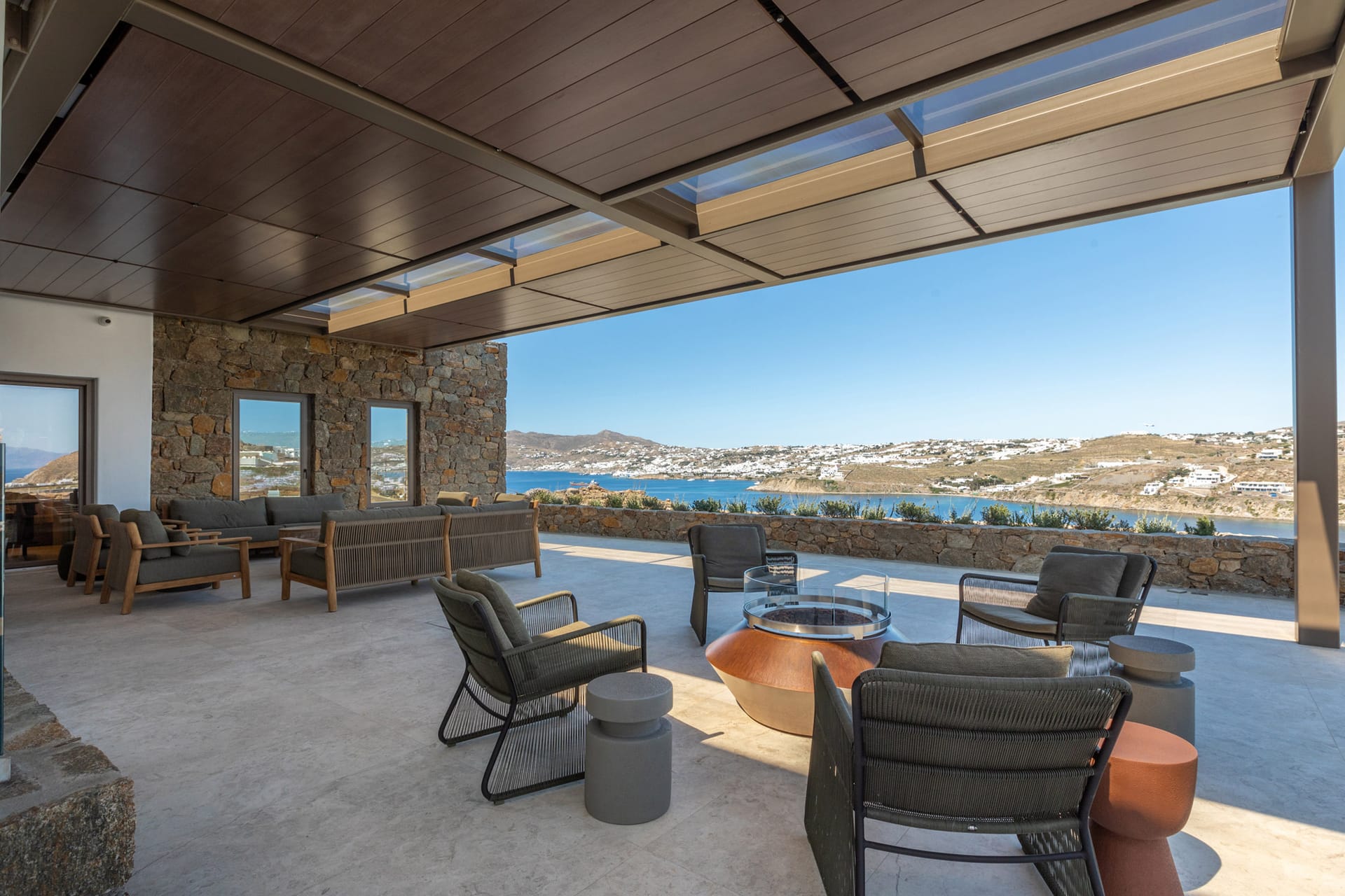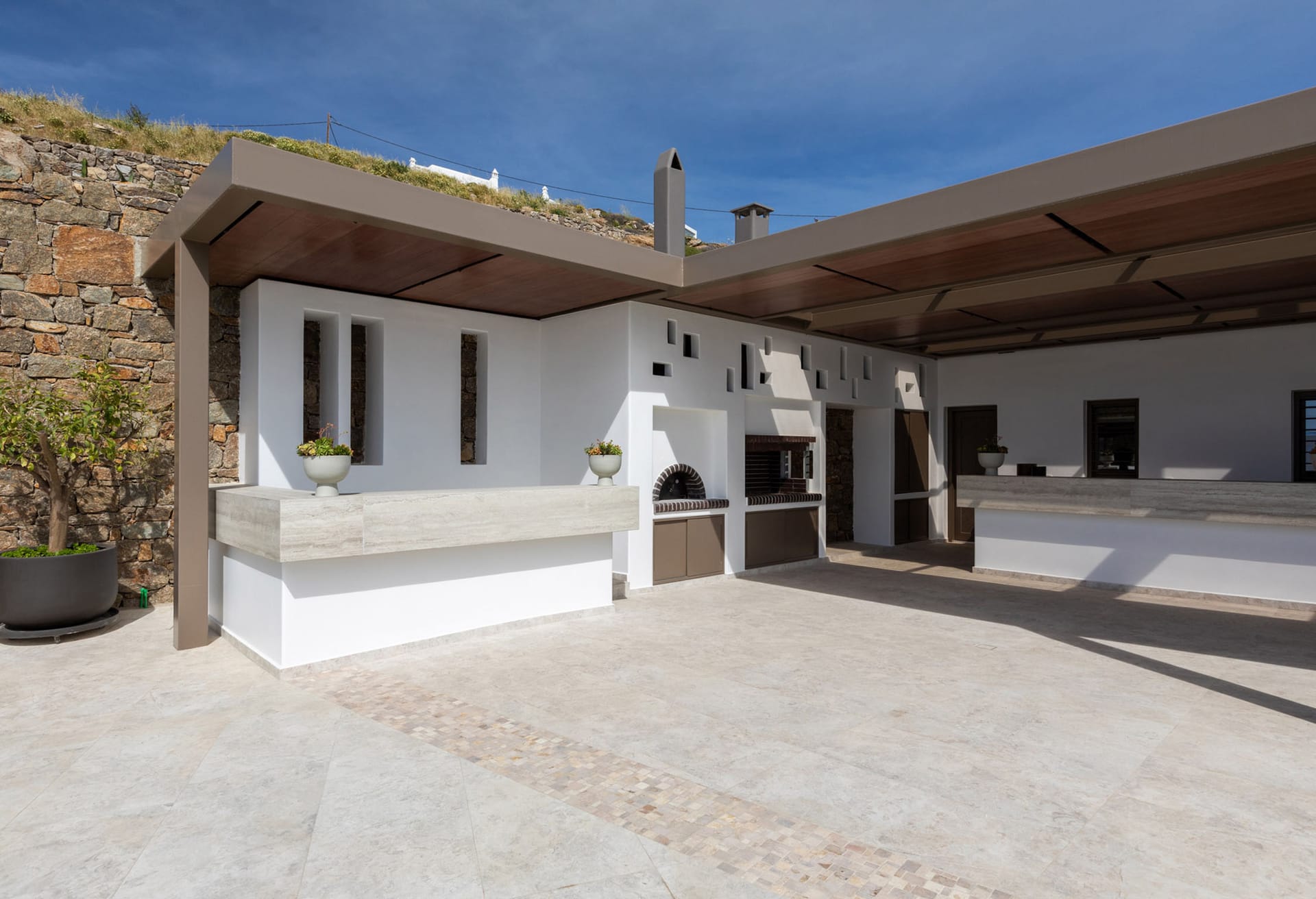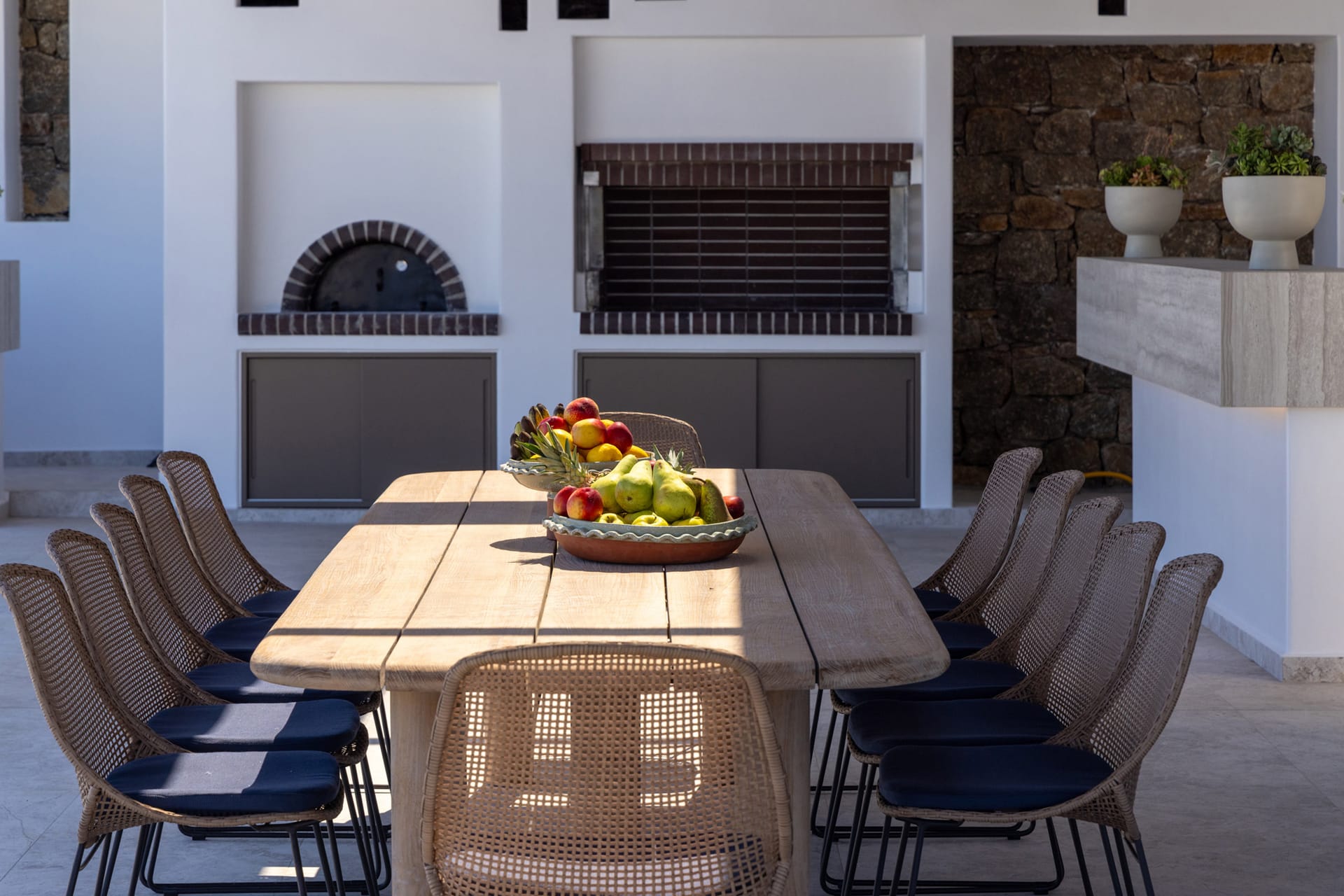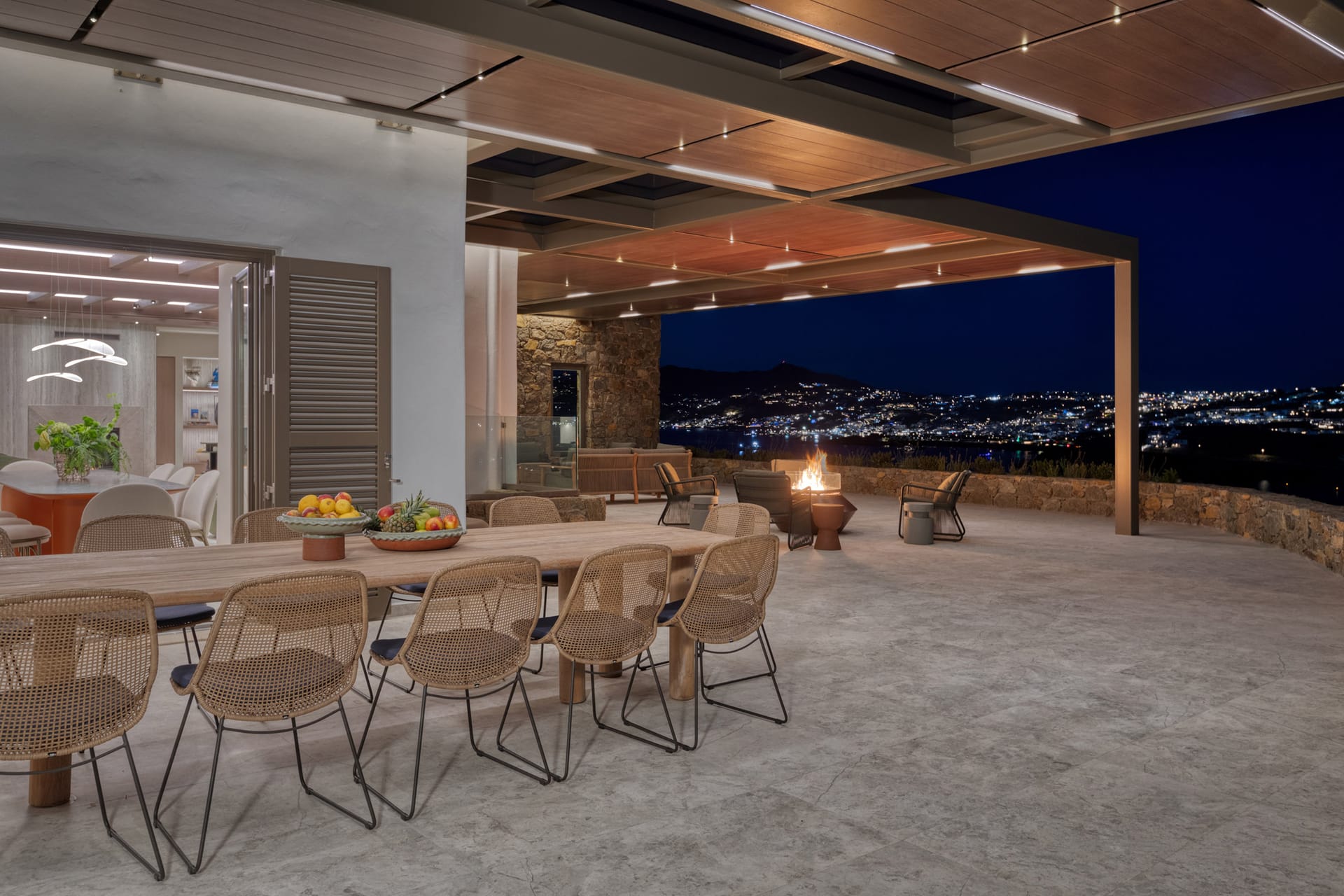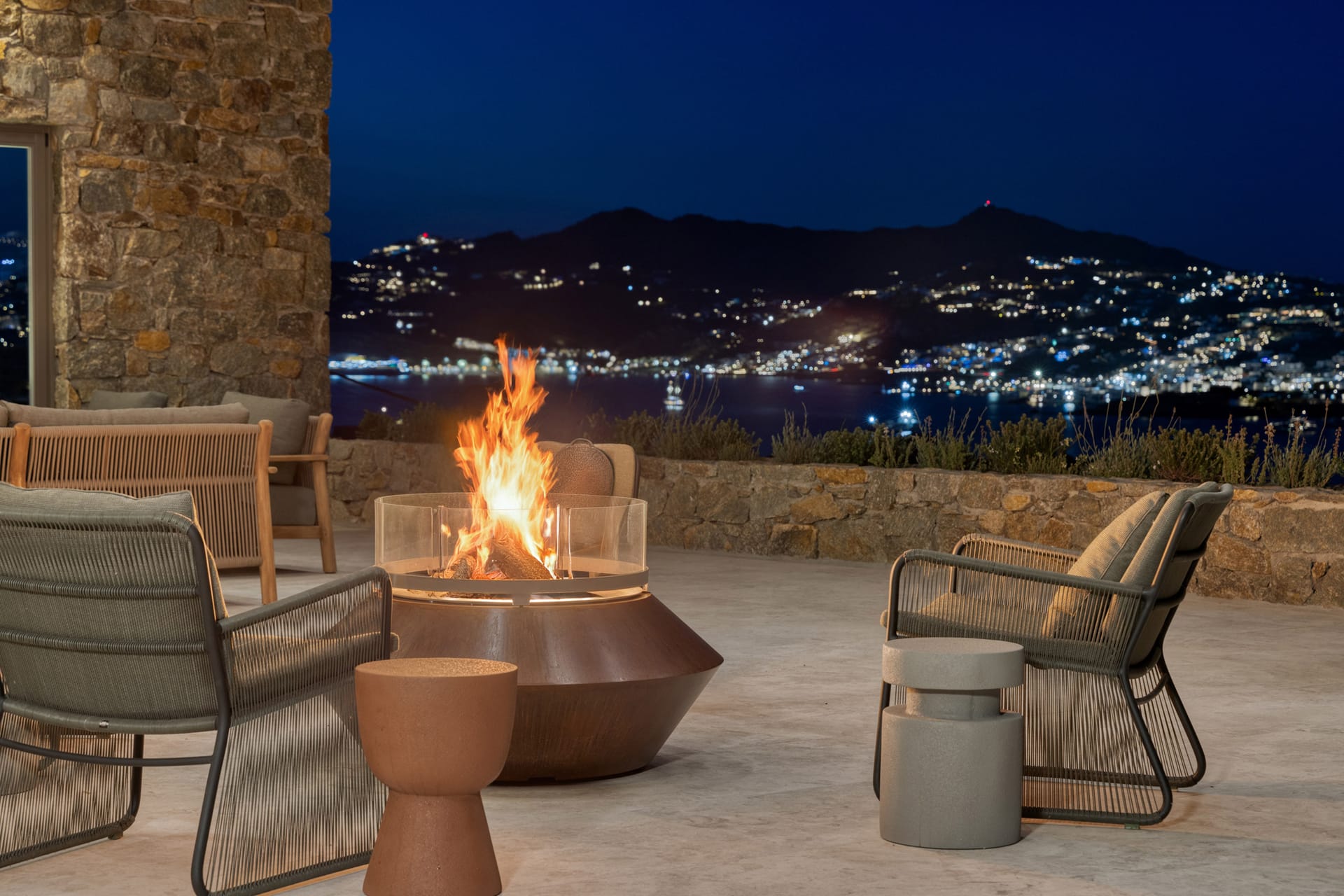 Outdoors, Mykonos Villa Amelia unfolds into welcoming spaces for gathering, unwinding, and enjoying the island’s beauty at your own pace: A heated infinity pool that gazes out over the sea, a spacious hot tub, pool deck, and shaded lounging areas, a fire pit corner offering memorable moments with views of Mykonos Town, a laid-back outdoor bar and covered dining area for up to 16 guests, complete with BBQ and wood-fired oven.