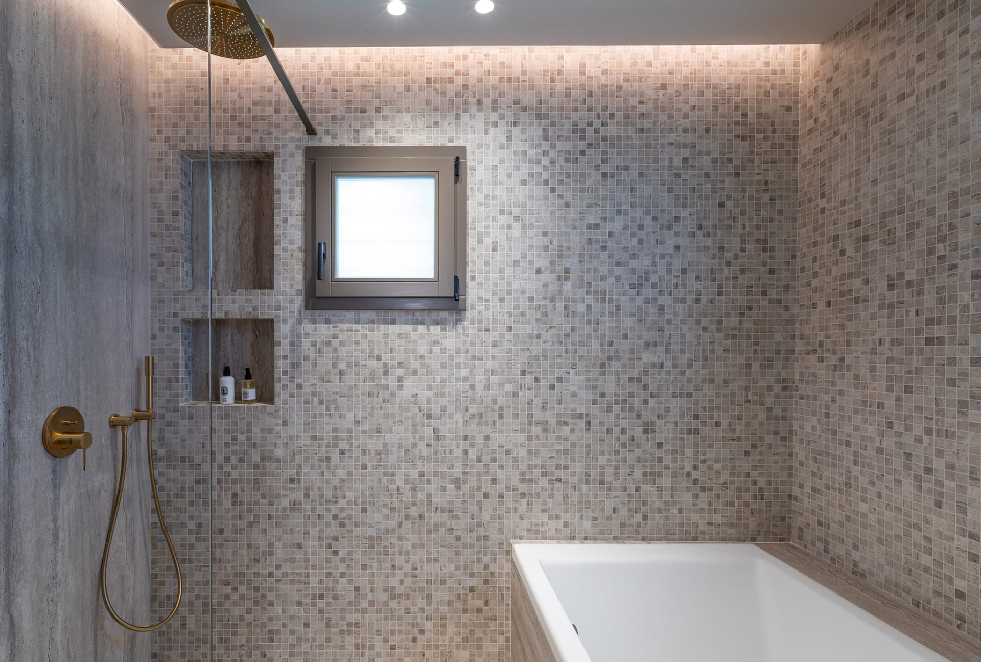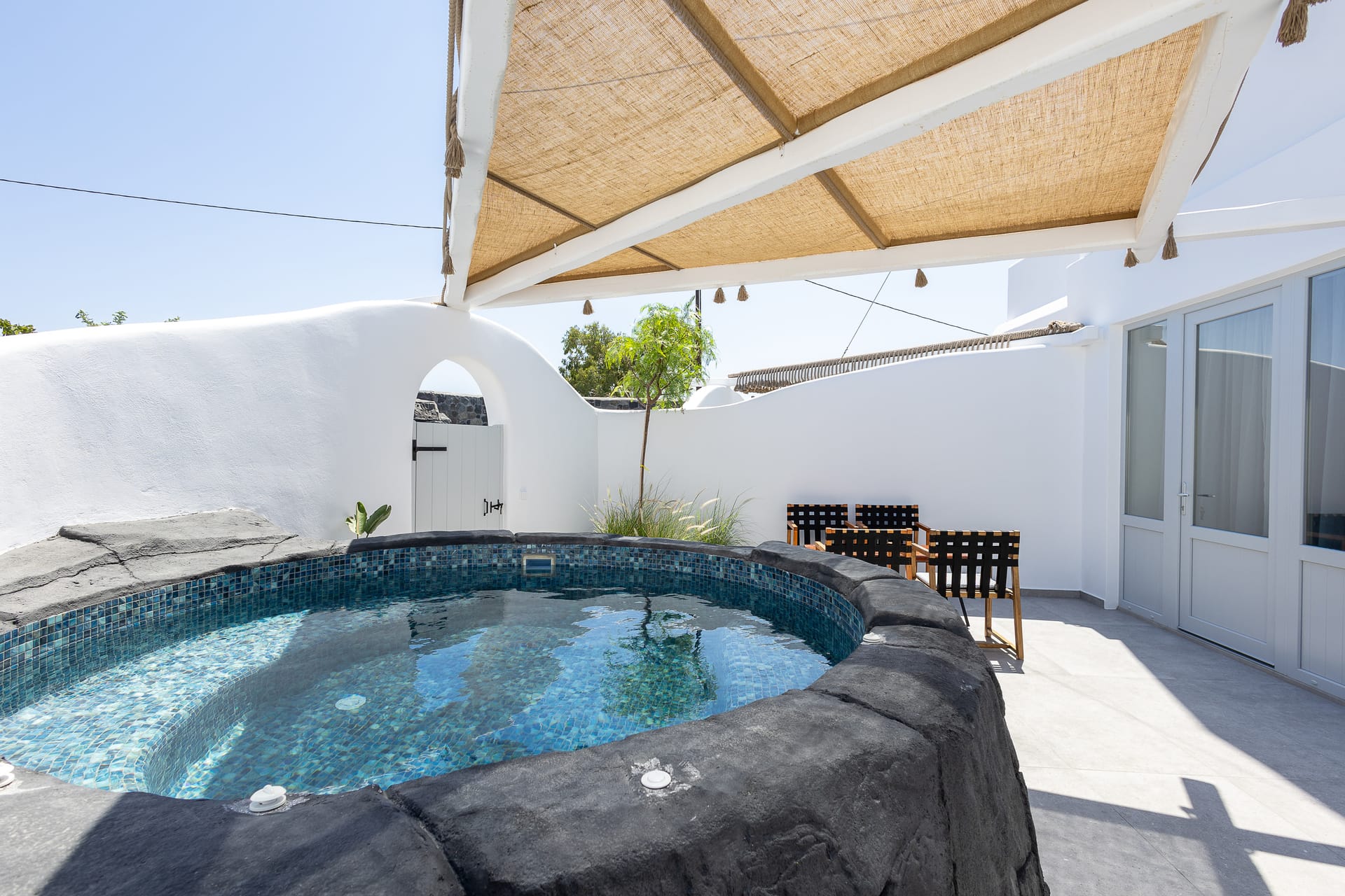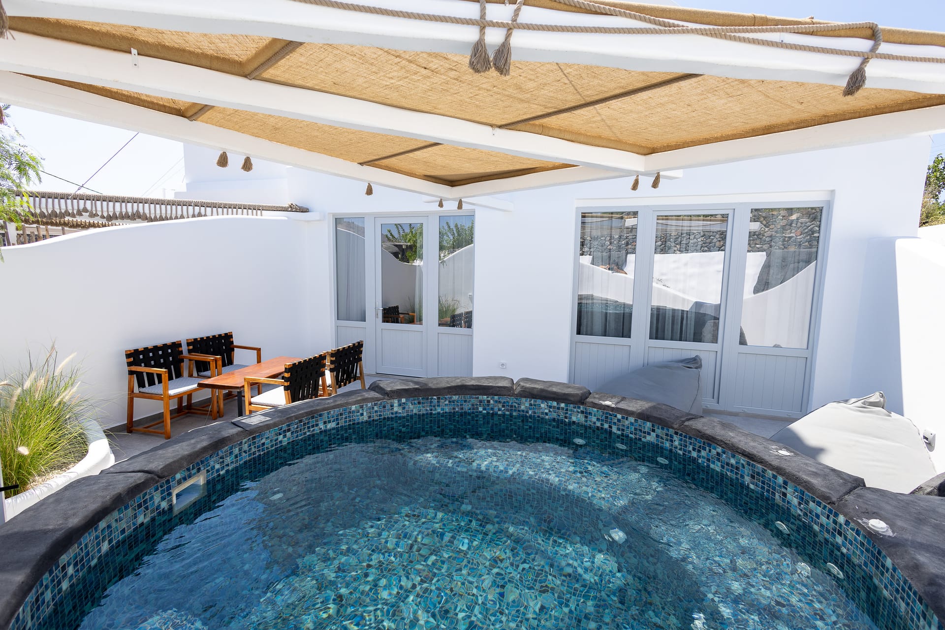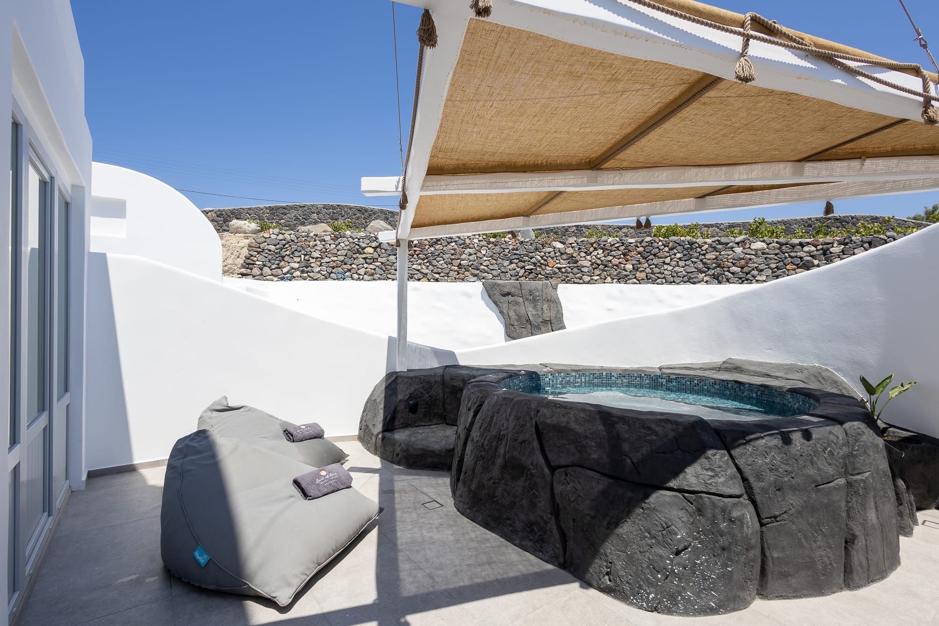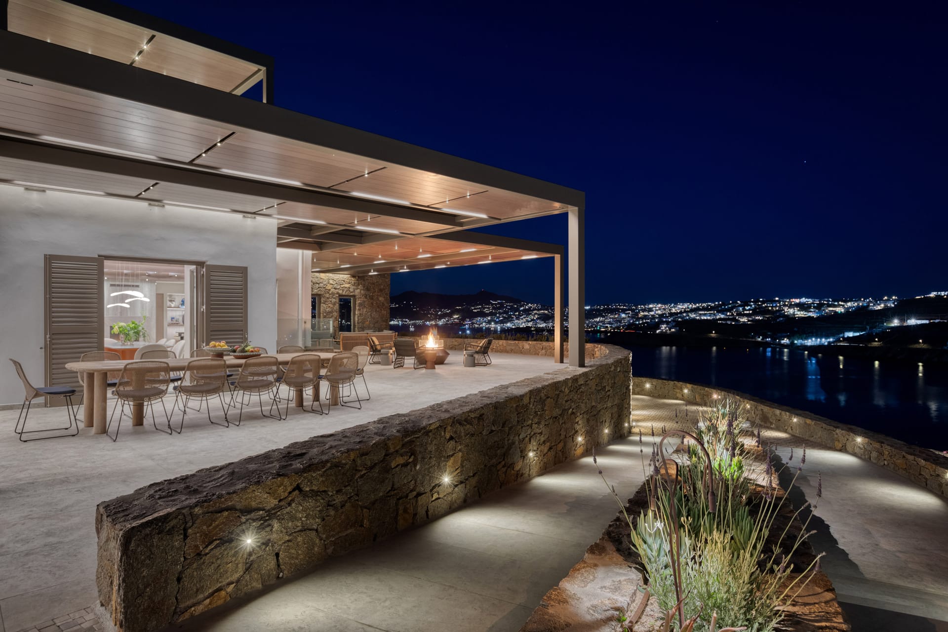 Outdoors, Mykonos Villa Amelia unfolds into welcoming spaces for gathering, unwinding, and enjoying the island’s beauty at your own pace: A heated infinity pool that gazes out over the sea, a spacious hot tub, pool deck, and shaded lounging areas, a fire pit corner offering memorable moments with views of Mykonos Town, a laid-back outdoor bar and covered dining area for up to 16 guests, complete with BBQ and wood-fired oven.