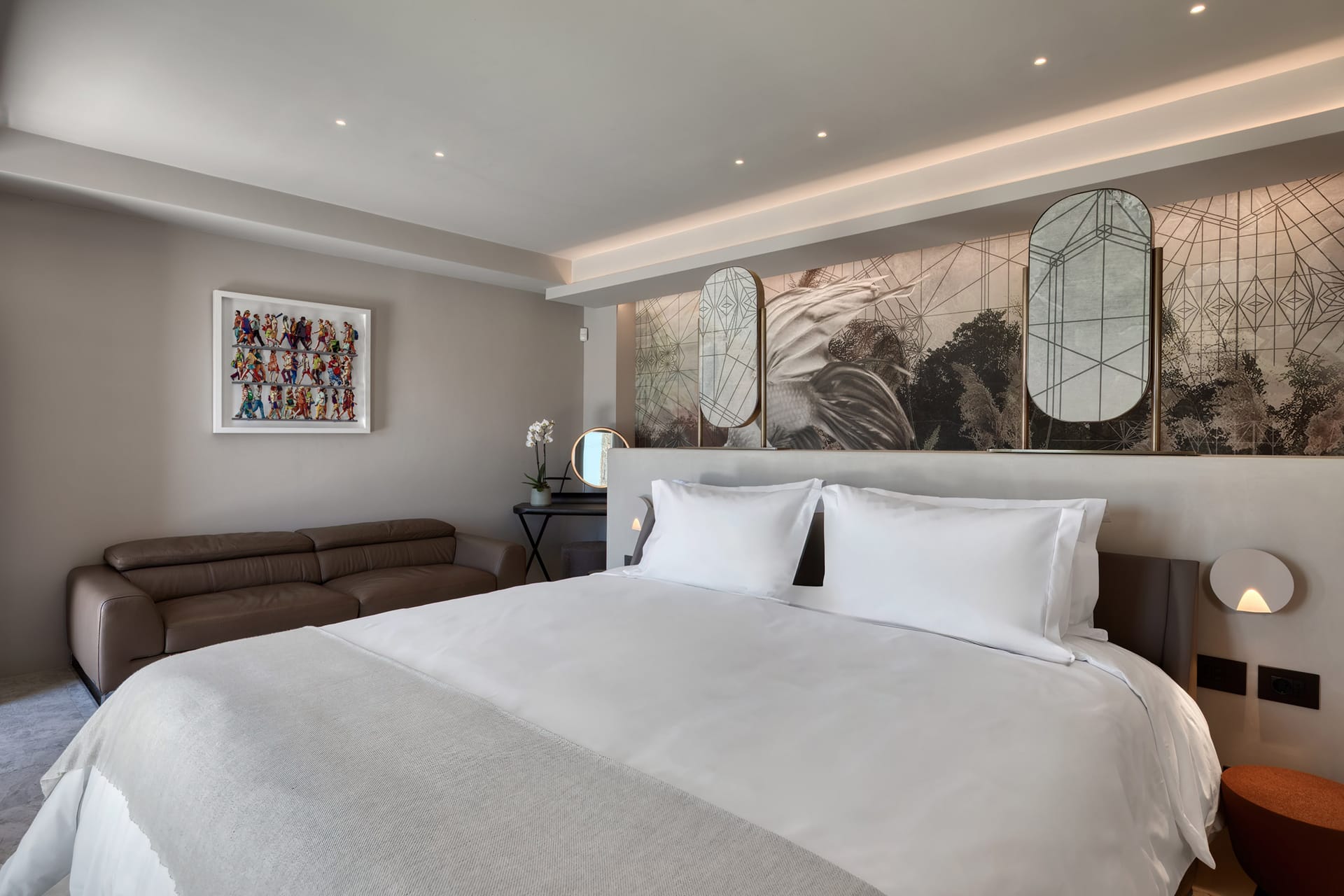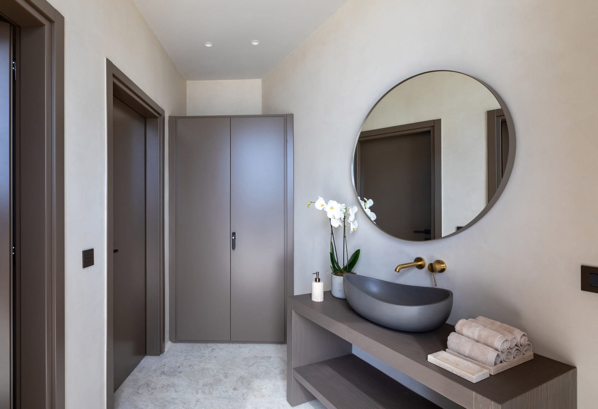 Two master bedrooms crown the upper level with sweeping sea views, expansive closets, private balconies, and en-suite bathrooms. A spacious suite with its living room adds further comfort and flexibility, while four additional deluxe bedrooms —each with private exterior access— ensure maximum privacy for all guests.