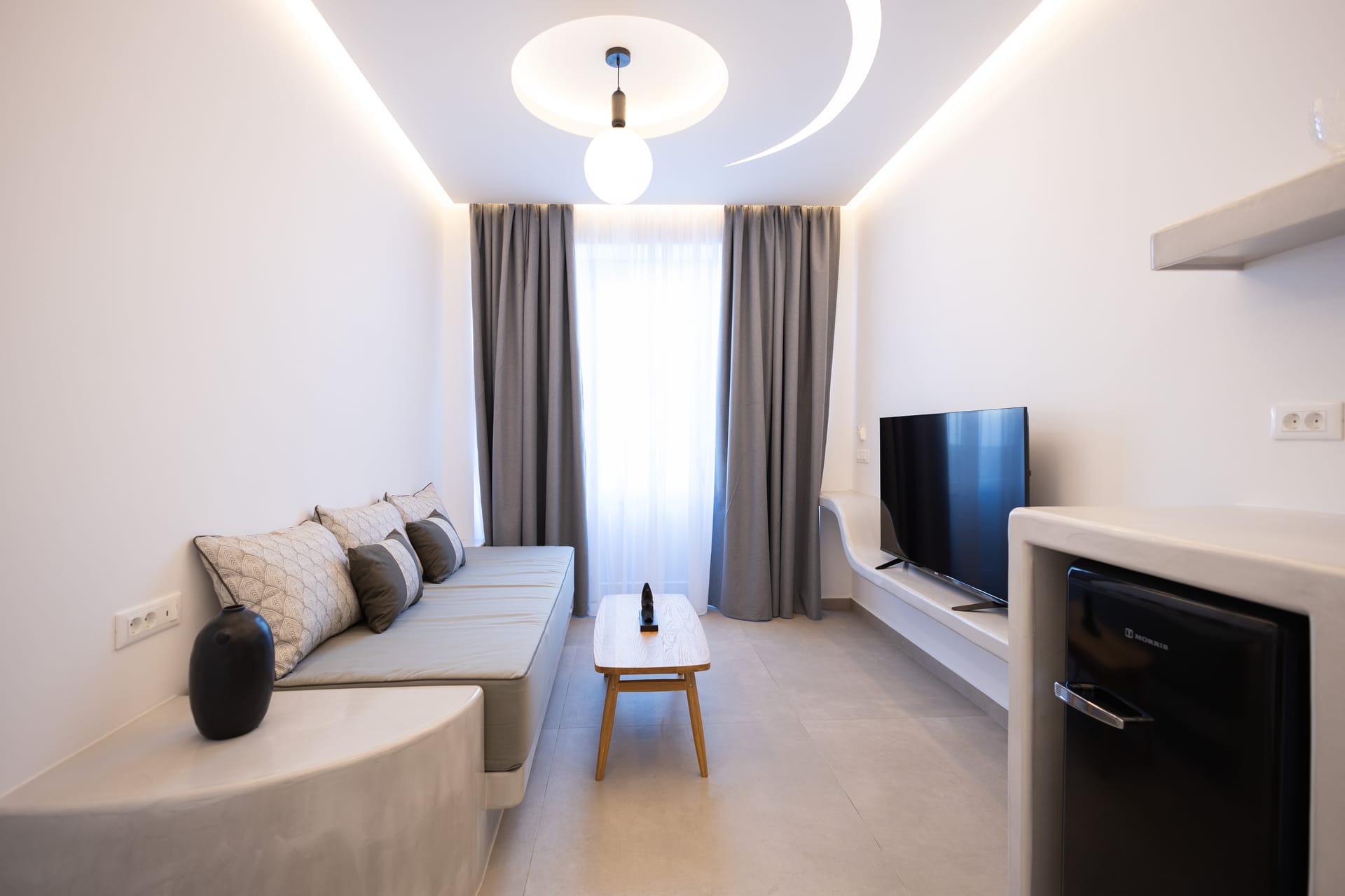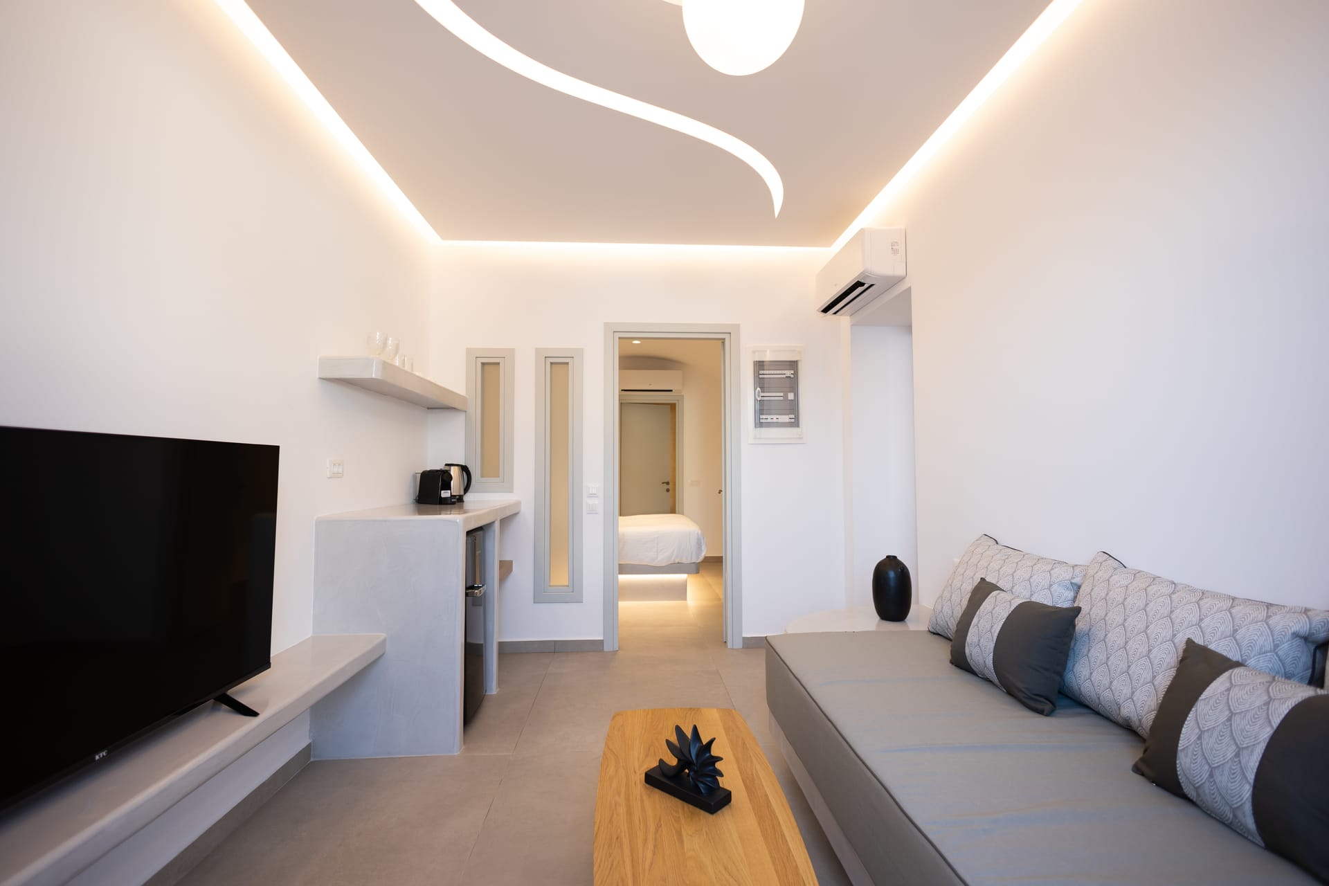 Mykonos Villa Amelia balances comfort with character. The spaces feel open yet cozy, with handpicked decor, pieces of art, and gentle lighting that create a calming atmosphere throughout.