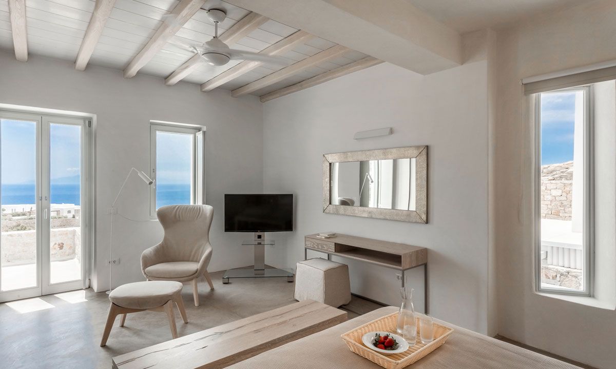 The area of Elia is one of the most cosmopolitan areas in Mykonos, as it has many restaurants, bars and shops. The spacious outdoor areas, are ideal for sunbathing, outdoor dining and lounging during the whole day.