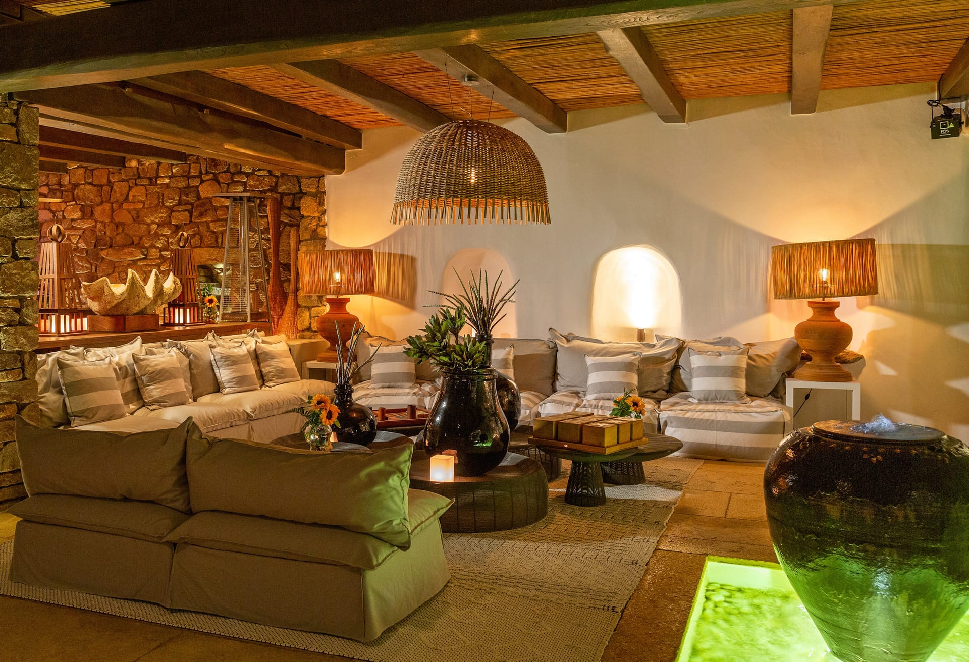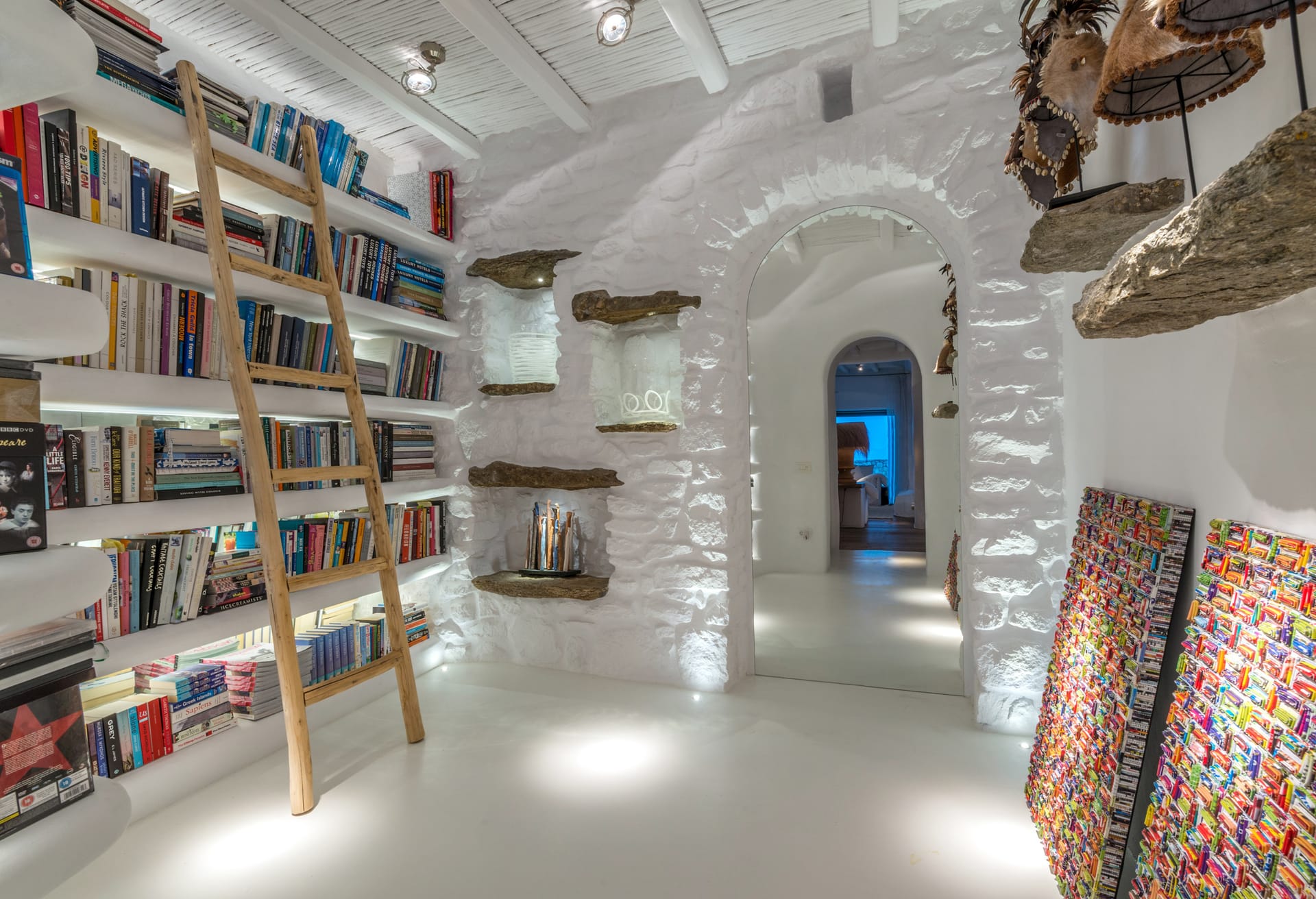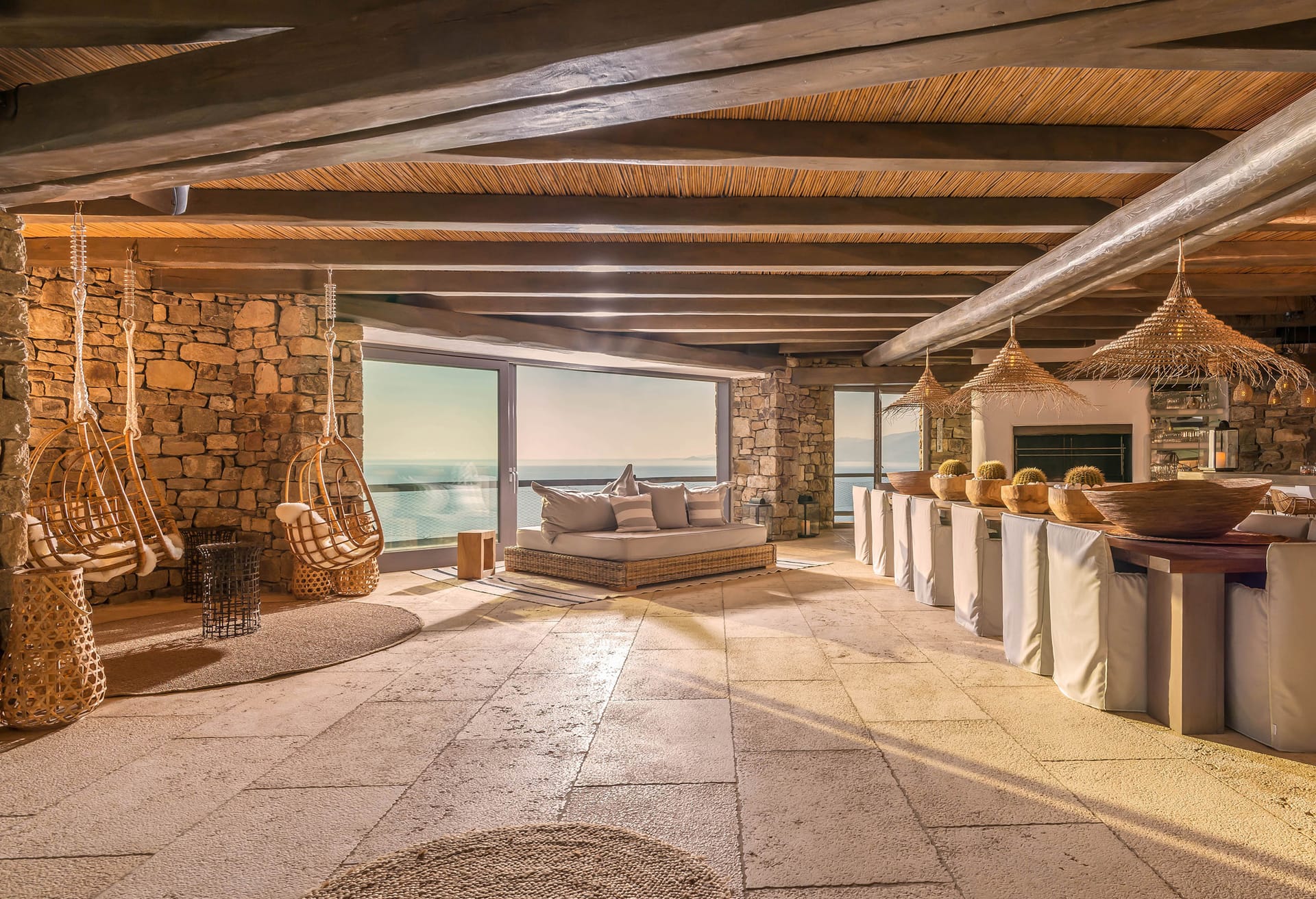 Mykonos Villa Atlas architecture blends harmoniously with the rugged landscape, featuring a timeless stone and whitewashed exterior that embodies the quintessential Mykonian aesthetic. Thoughtful design, both inside and out, respects the natural topography, creating a perfect balance of drama and tranquility.