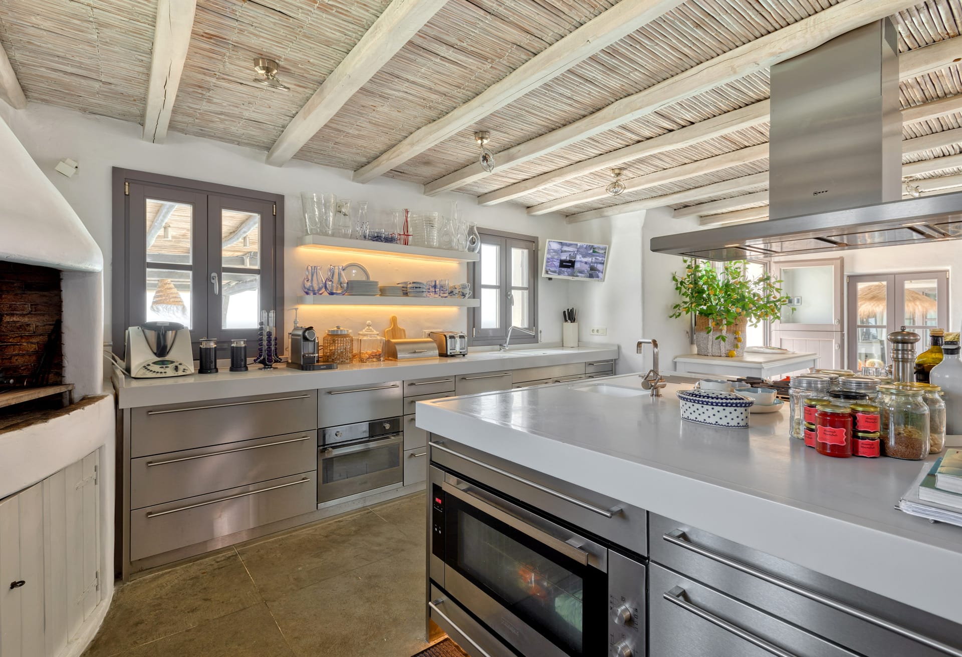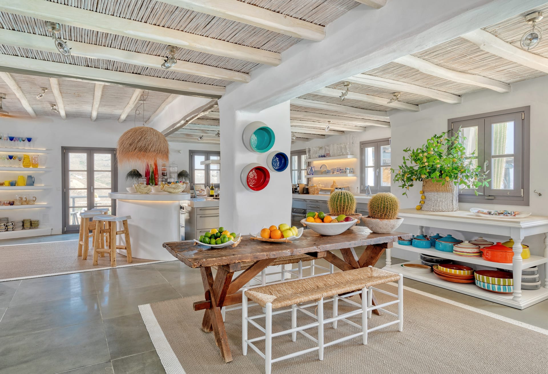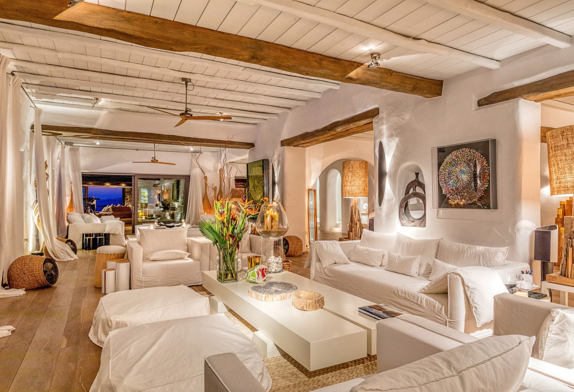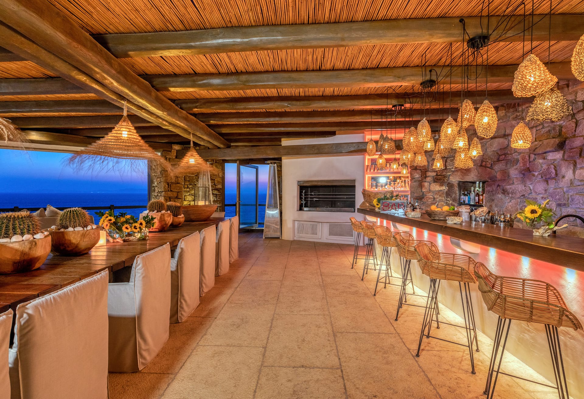 Enter through a charming courtyard into a fully equipped chef's kitchen, featuring an inviting breakfast alcove and island seating. The grand open-plan reception area serves as the heart of the villa, offering various seating areas, a cozy fireplace, and multiple doors that open onto the expansive pool terrace. This space provides unobstructed views of the sea and Delos Island, while the formal internal dining area sets the stage for sophisticated dinners.