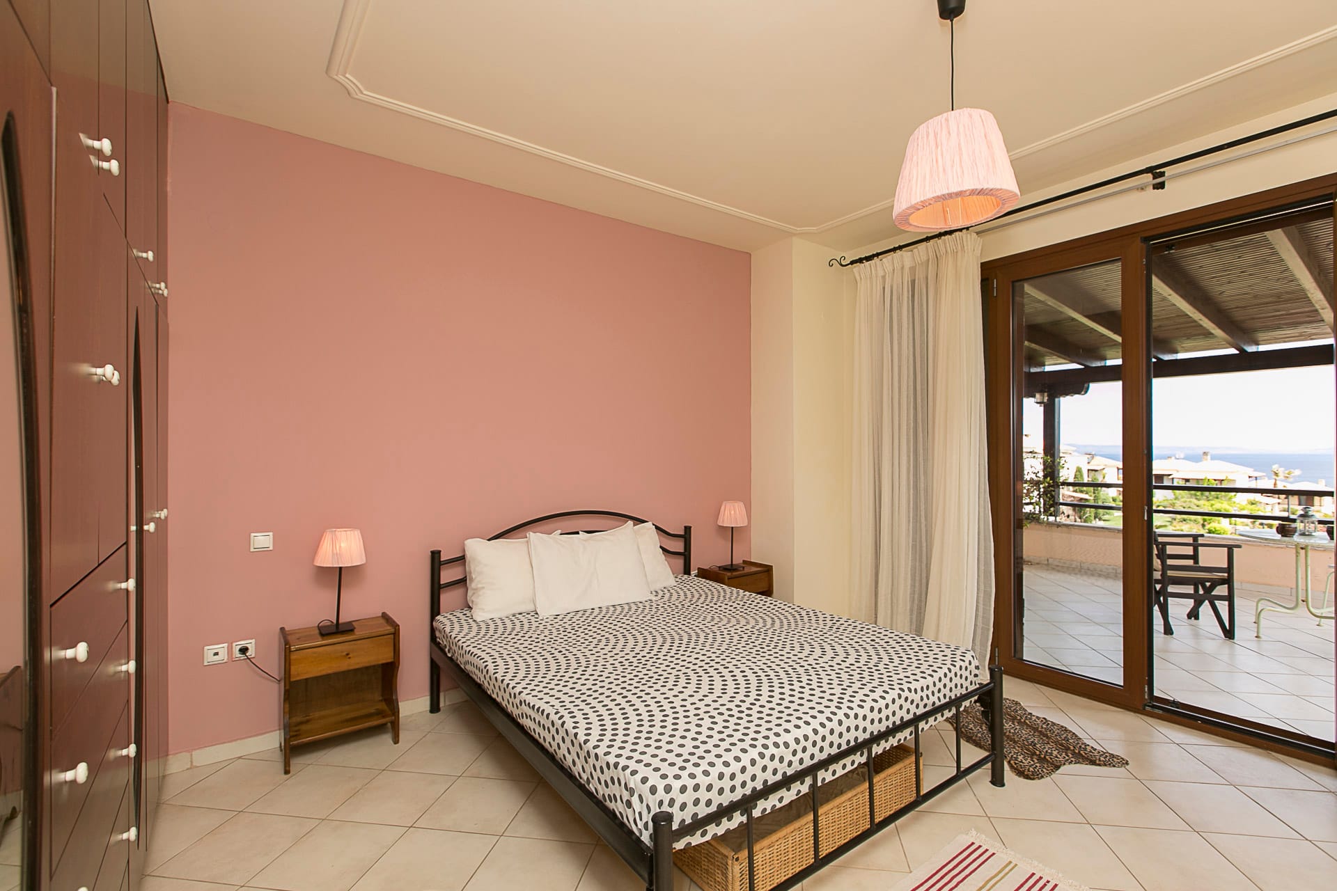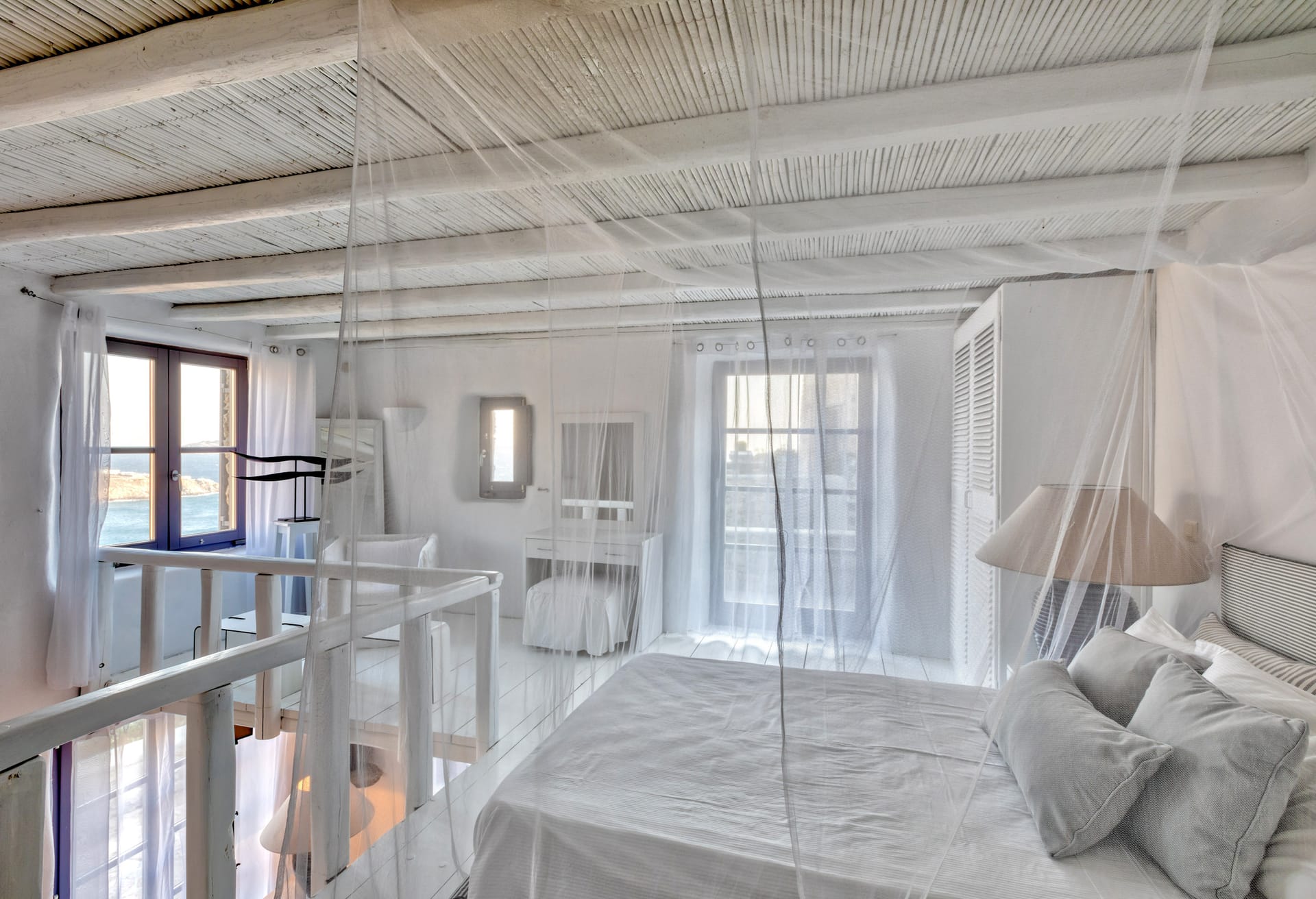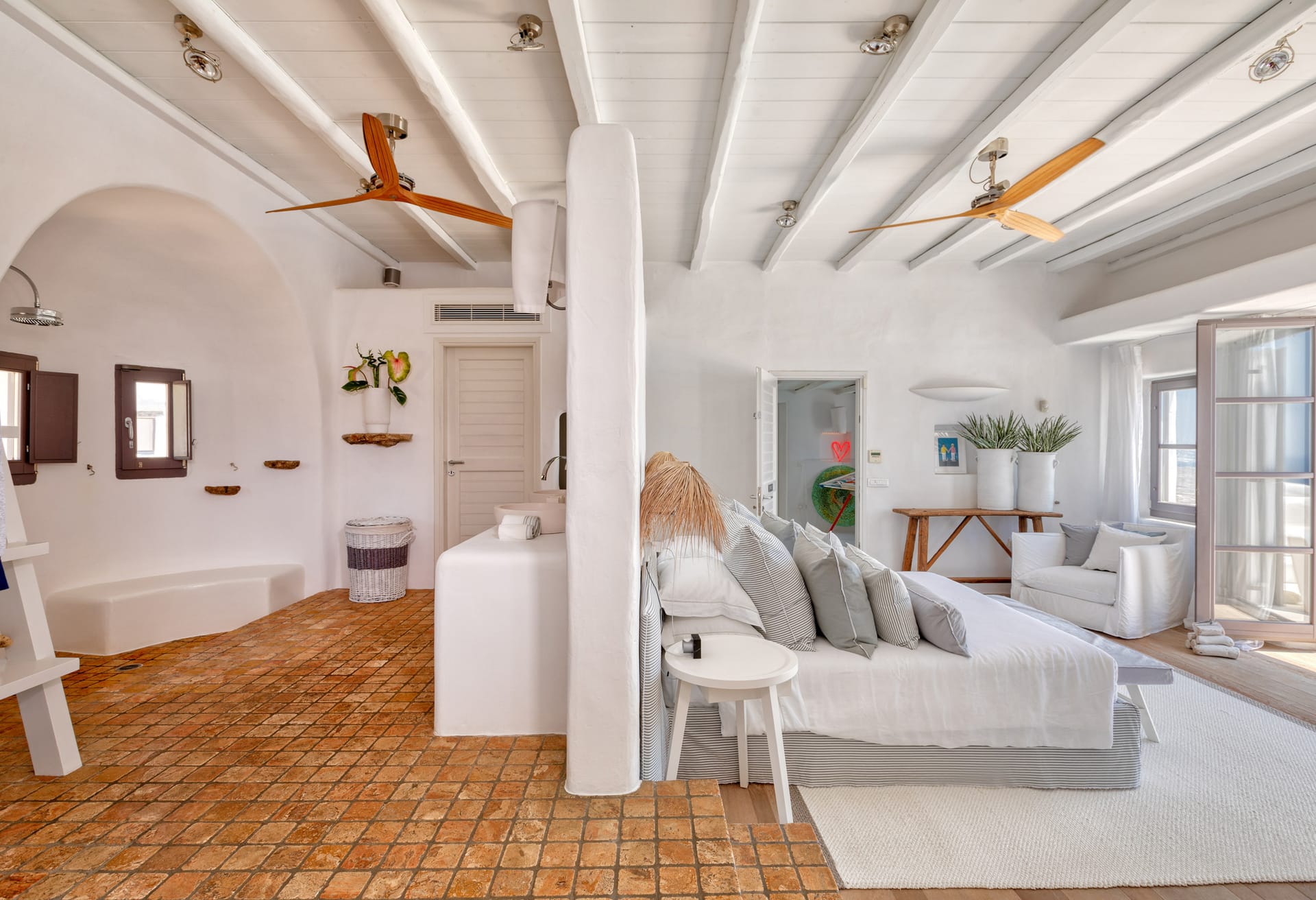 Each of the seven guest bedrooms features ensuite facilities, private terraces, and stunning sea views. The layout ensures privacy and comfort, making Mykonos Villa Atlas an ideal retreat for families and groups. The master suite is a spacious and elegantly decorated bedroom with plush bedding and high-end furnishings, offering a serene atmosphere perfect for relaxation. Large windows flood the room with natural light, highlighting the stunning sea views. The ensuite bathroom is equipped with a walk-in rain shower, dual vanities, and premium toiletries, blending modern luxury with island charm for a spa-like experience. A generous dressing area with ample closet space and a full-length mirror provides the perfect space for preparation. Adjacent to the suite, a cozy reading lounge offers an ideal corner for unwinding with a good book. Step onto a private yoga terrace with breathtaking views of the pool and Aegean Sea, creating the perfect setting for morning yoga or evening meditation.