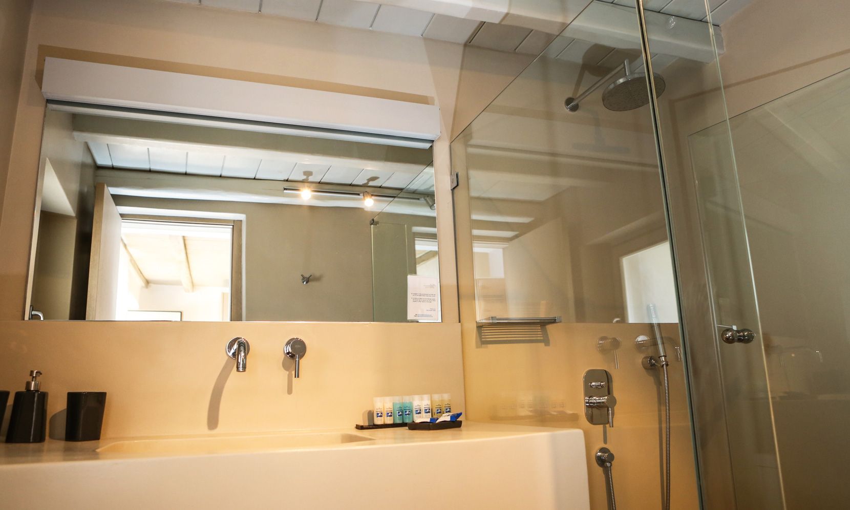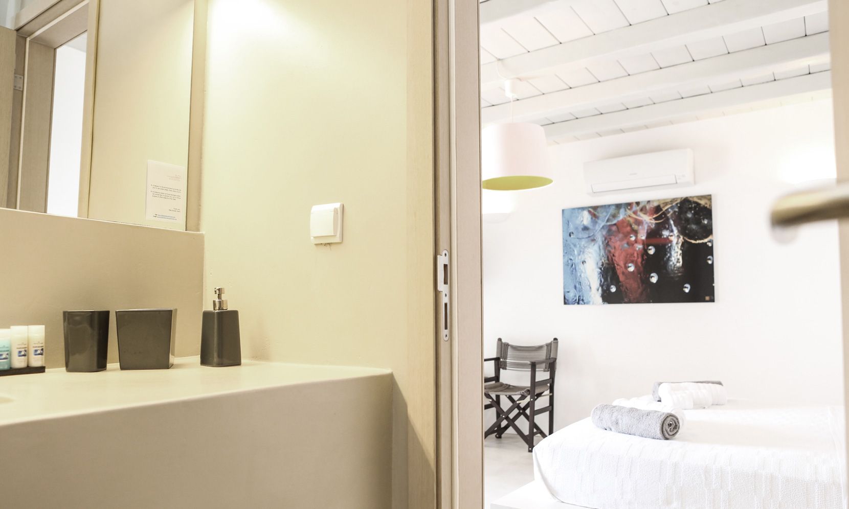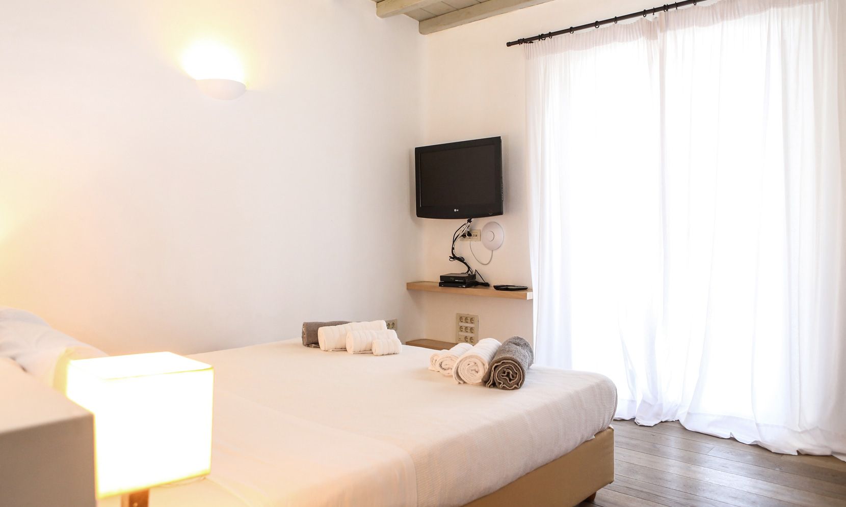 A bedroom with 1 double bed (plus a double bed on the attic), A/C, en-suite bathroom with shower, courtyard access.