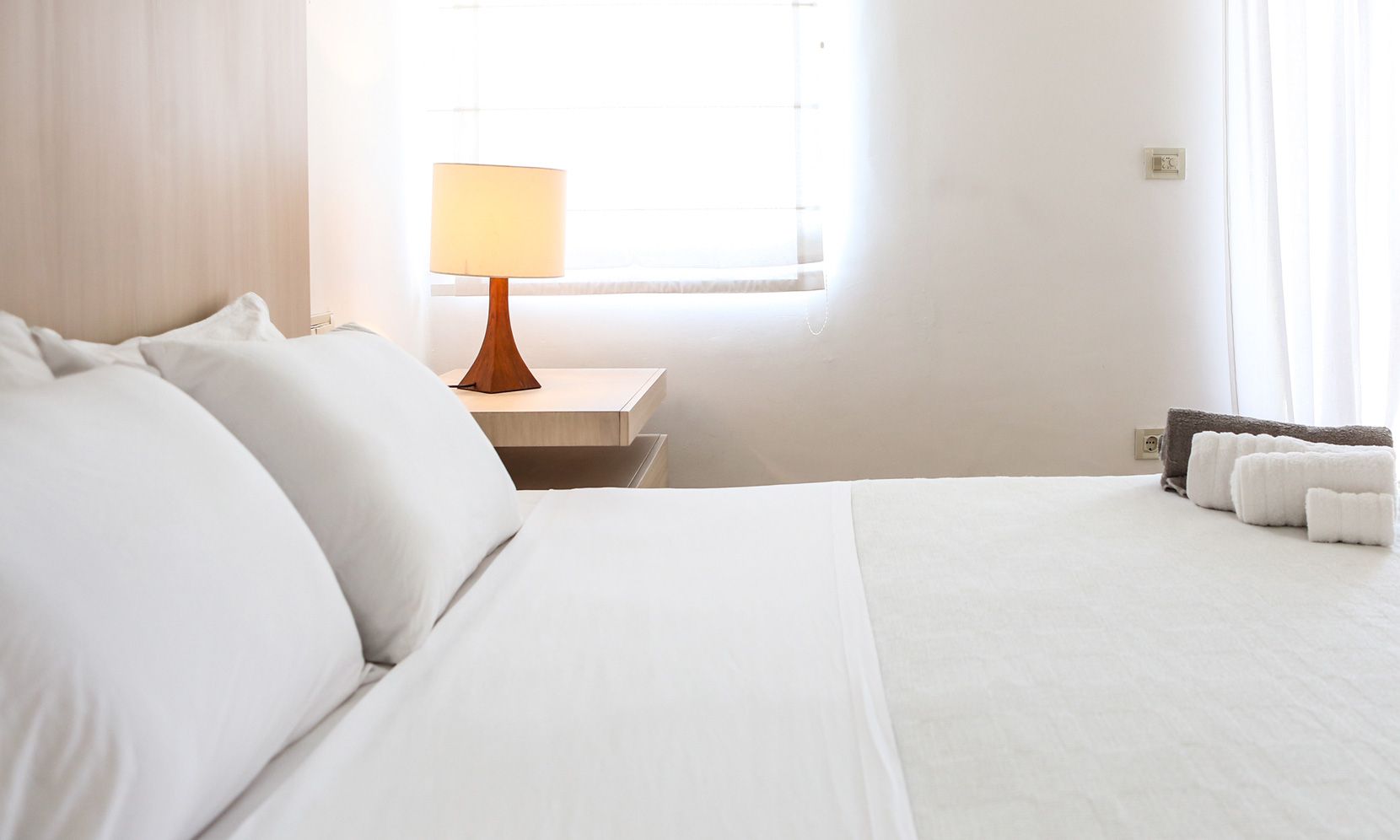 A Master bedroom with double bed, A/C, en-suite bathroom with shower, access through the balcony door to the garden and pool, sea view.