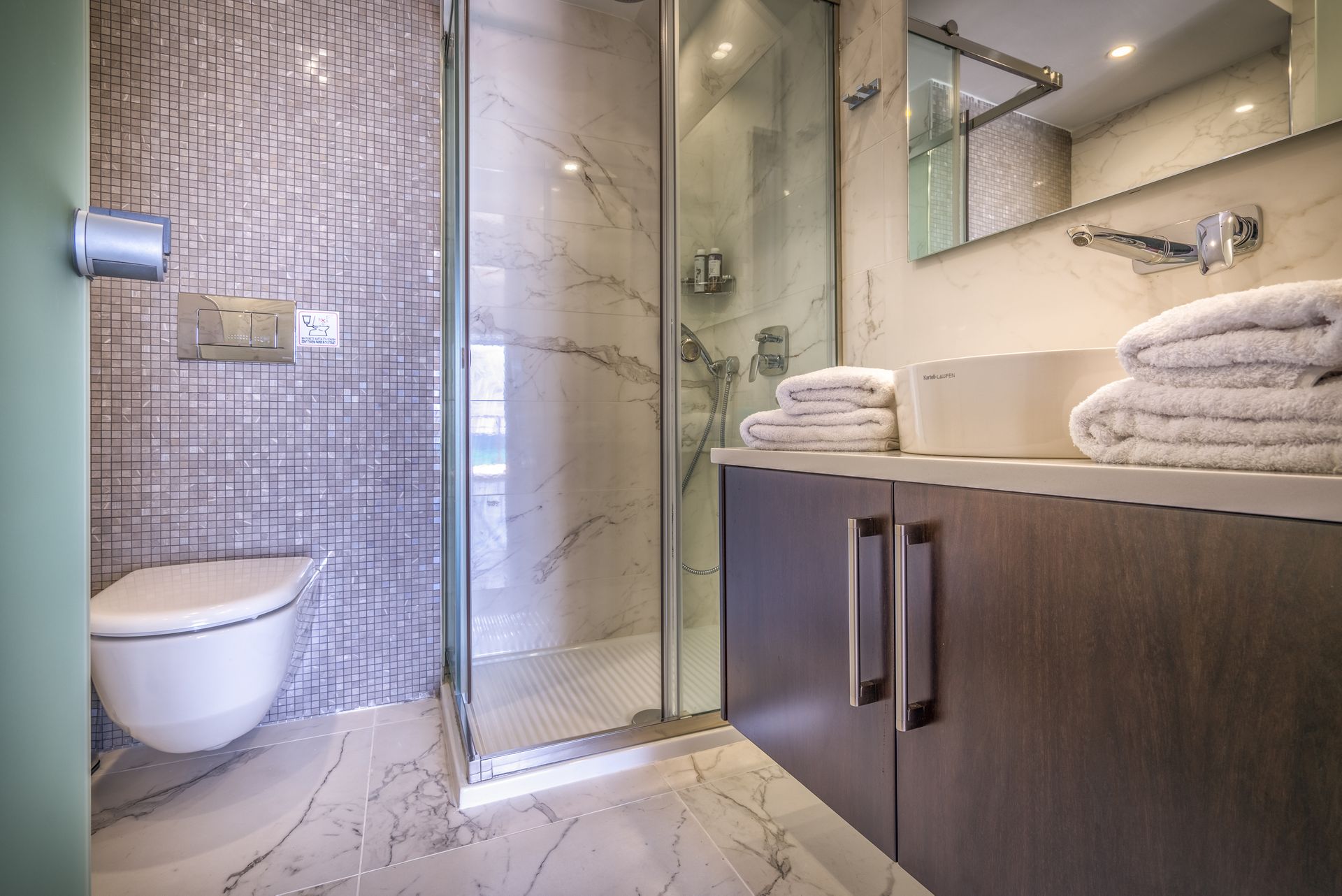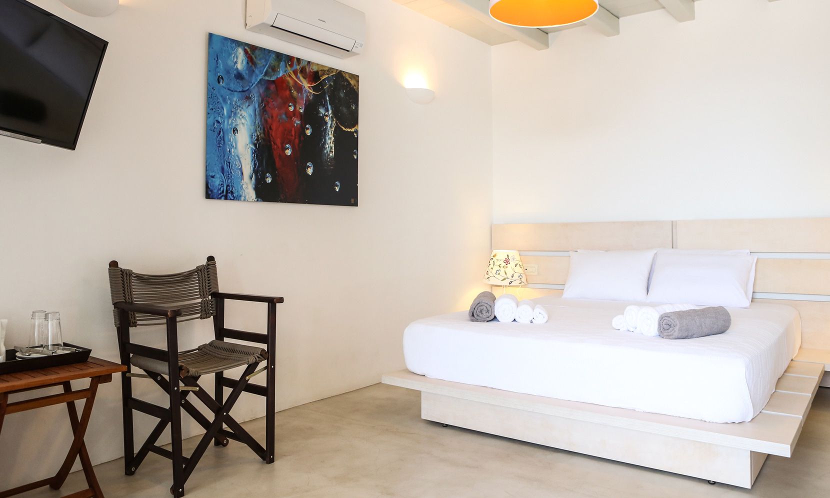 A bedroom with double bed, A/C, en-suite bathroom with shower.