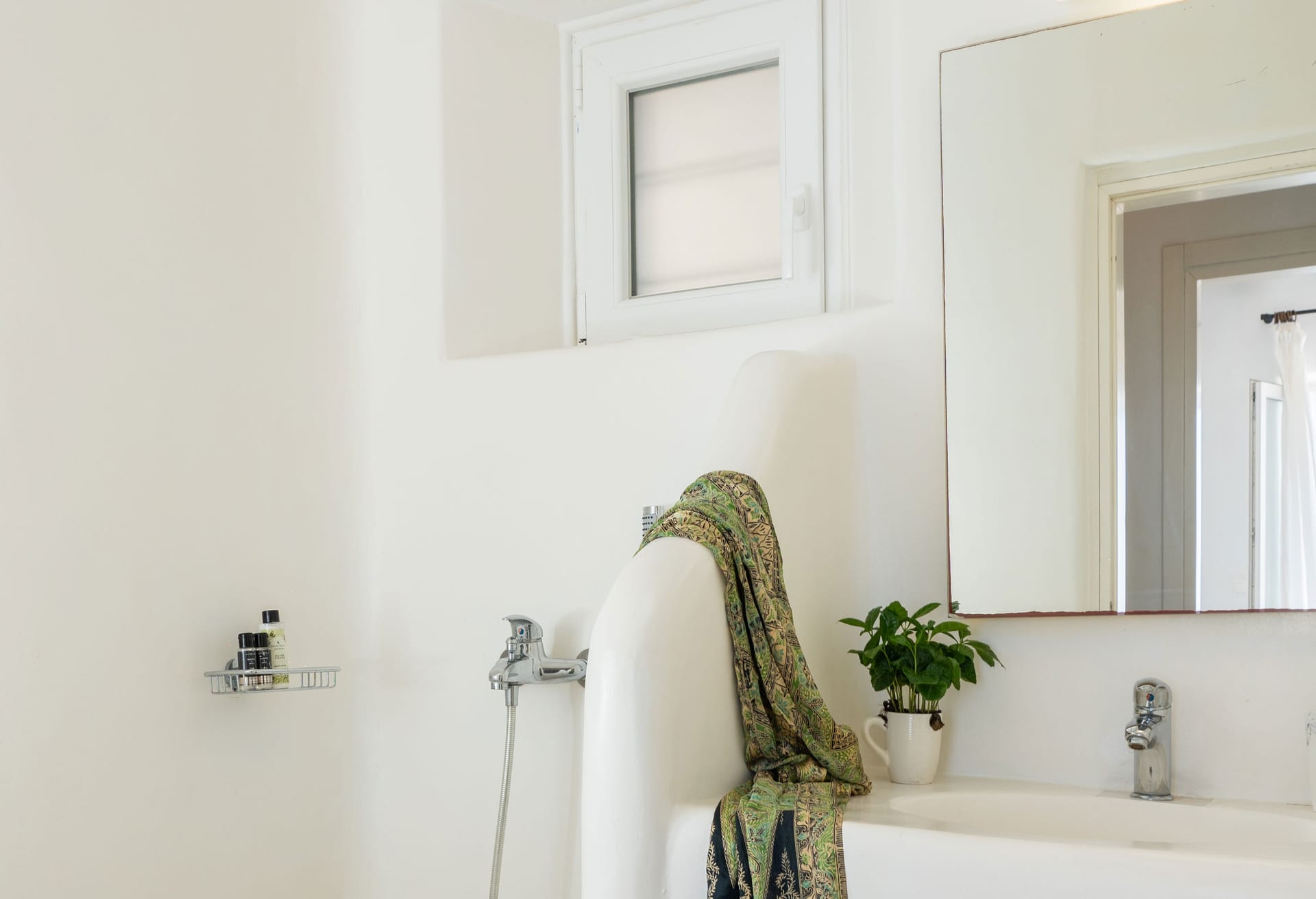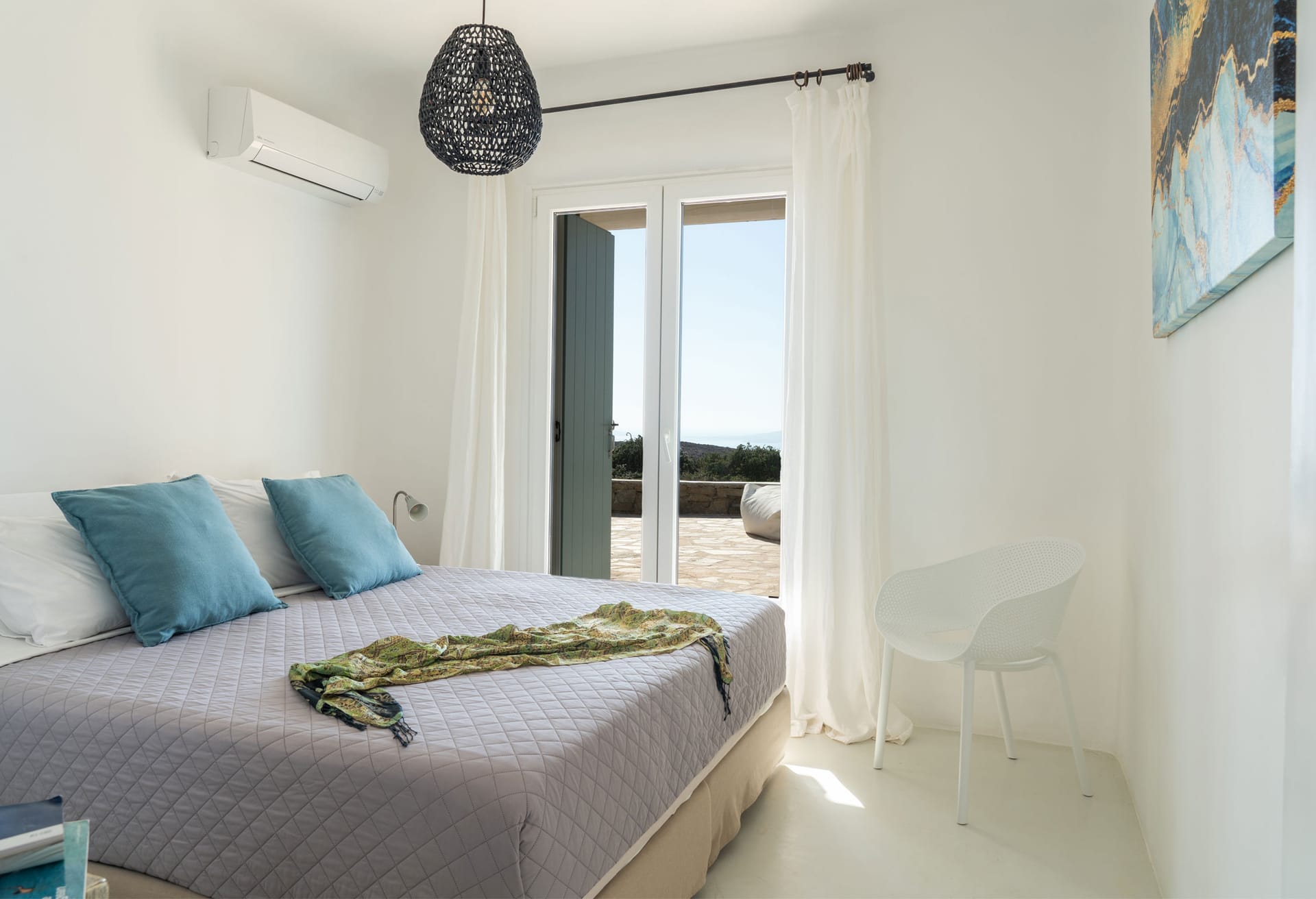 ➢ 2 double bedrooms with double sized beds sharing one full bathroom. The 2 bedrooms are both equipped with a wardrobe, AC, access to outdoor and swimming pool area via stairs, and direct bed views to the Aegean Sea.