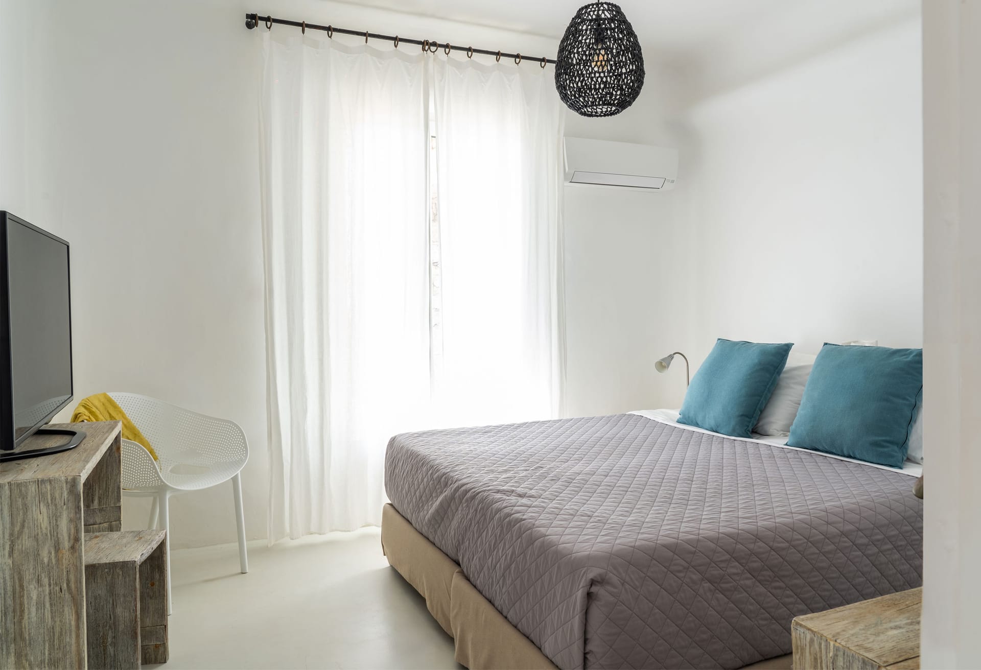 ➢ 2 double bedroom with double sized bed and private bathrooms. The rooms are equipped with wardrobe, AC, access to outdoor and swimming pool area and have direct bed views to the Aegean Sea.
