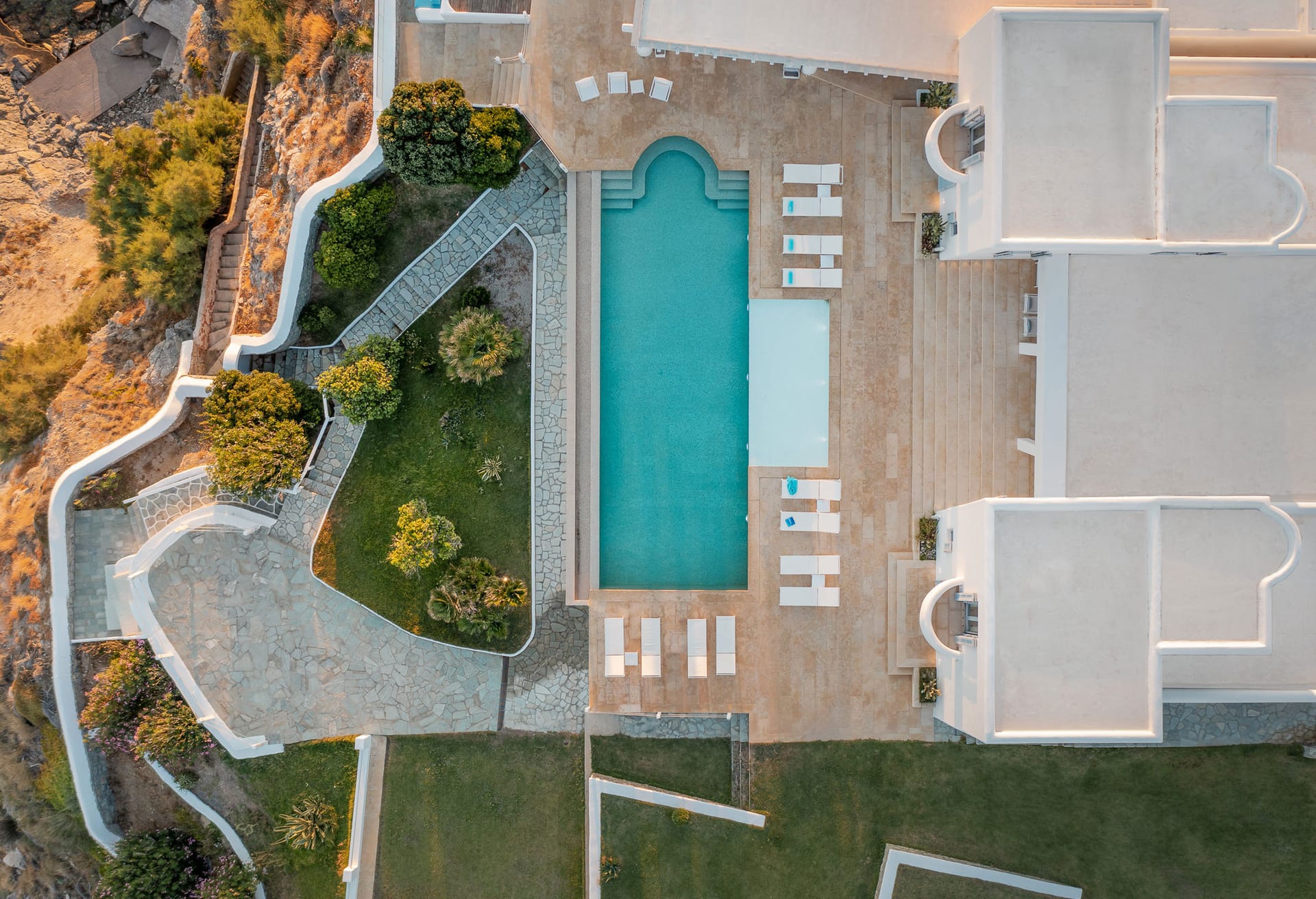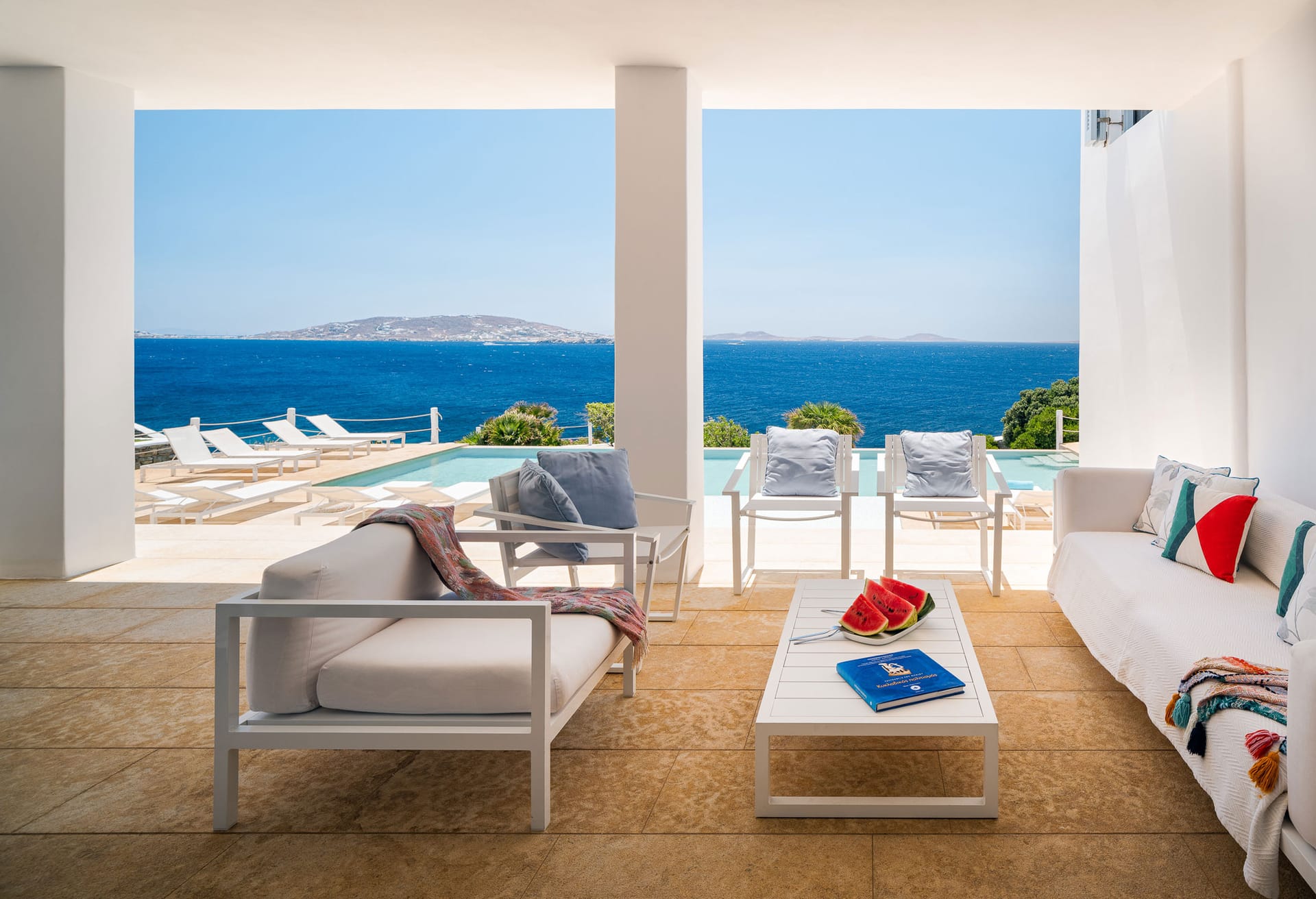 Mykonos Villa Dawn boasts luxury accommodation for up to 14 guests in a total of 7 Bedrooms, occupying an exquisite location on the coast of Agios Stefanos, a short drive from the main port of Mykonos and Mykonos Town.