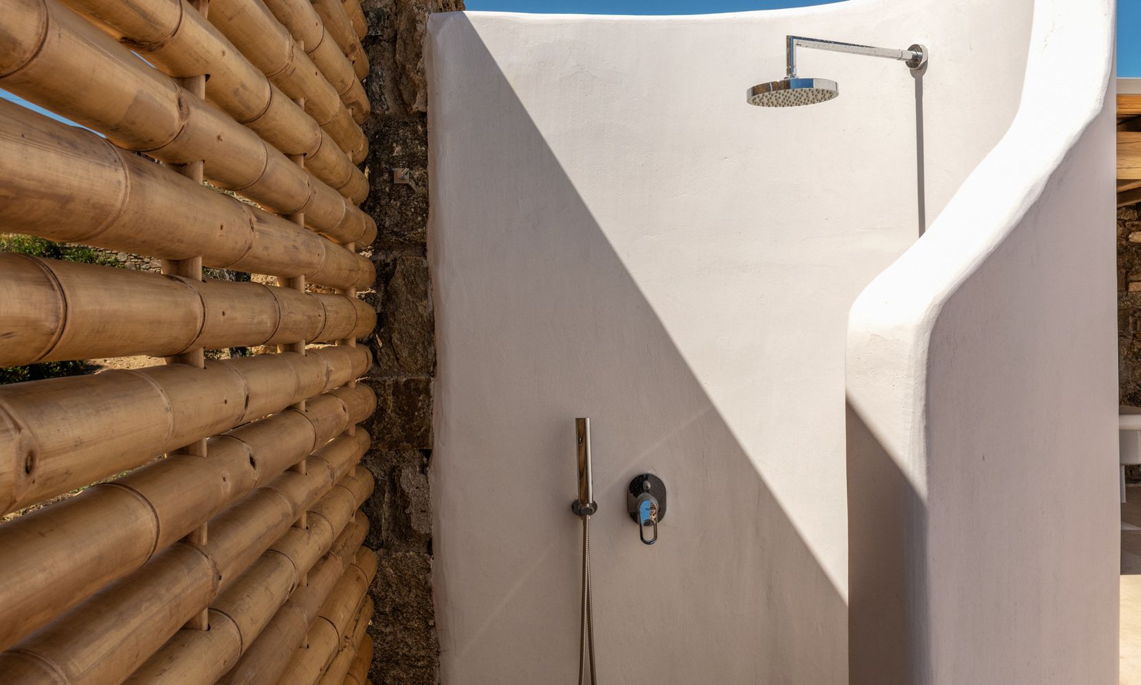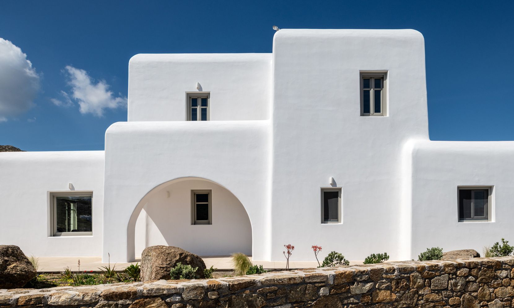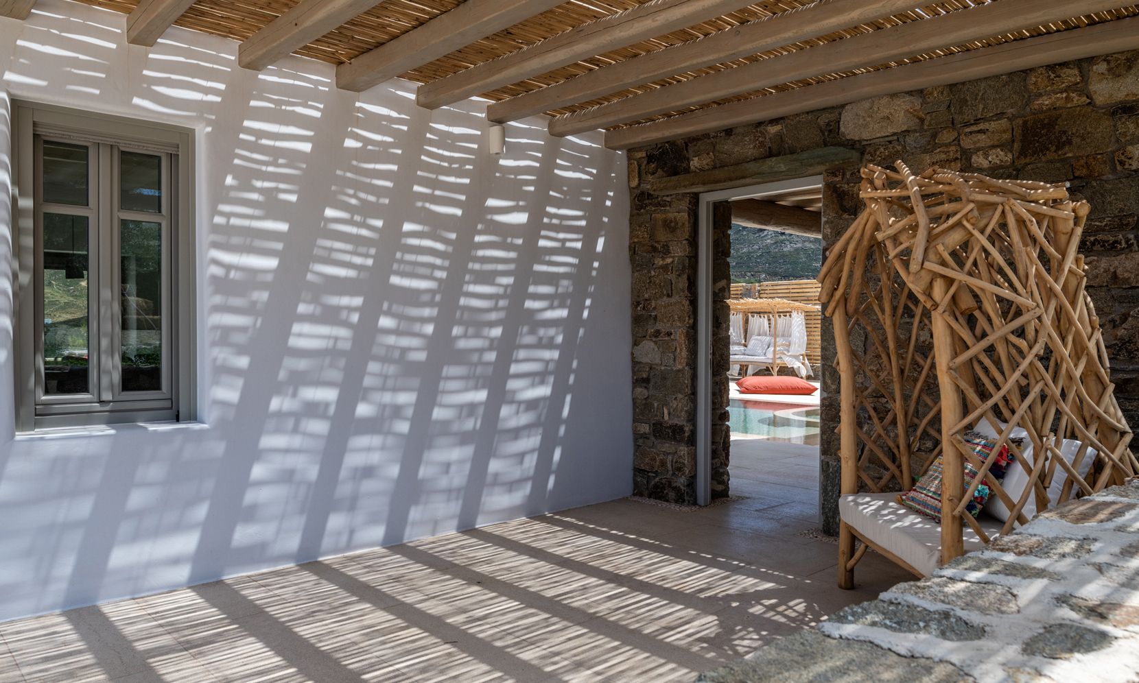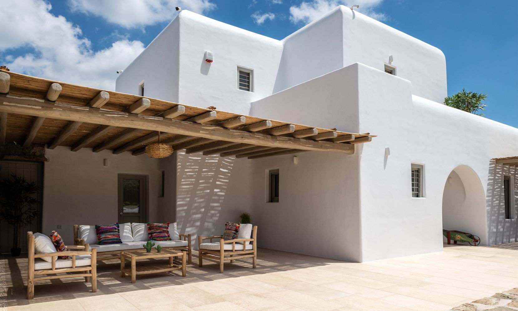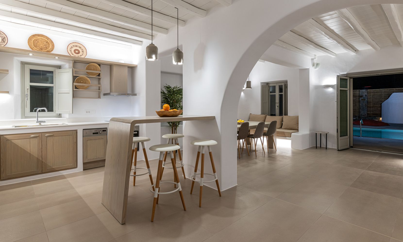The luxury villa exterior offers deluxe guests a variety of entertainment. The private swimming pool of Mykonos villa Elodia 2 guarantees fun and relaxation any time of the day. Have a morning dip to wake up yourself before going to the nearby Ftelia Beach. There is a BBQ that will allow you to get creative and prepare delicious meals for your family and friends. At night you can enjoy the view by making your own cocktails at the pool bar and letting the Mykonos breeze travel your senses.