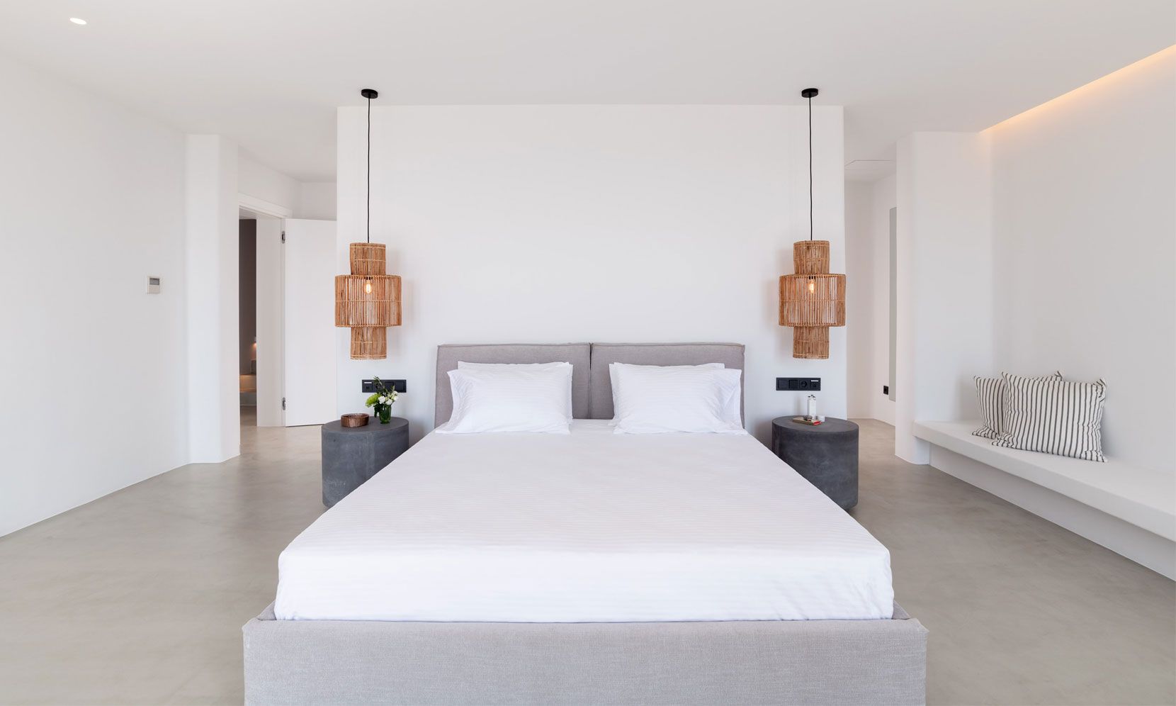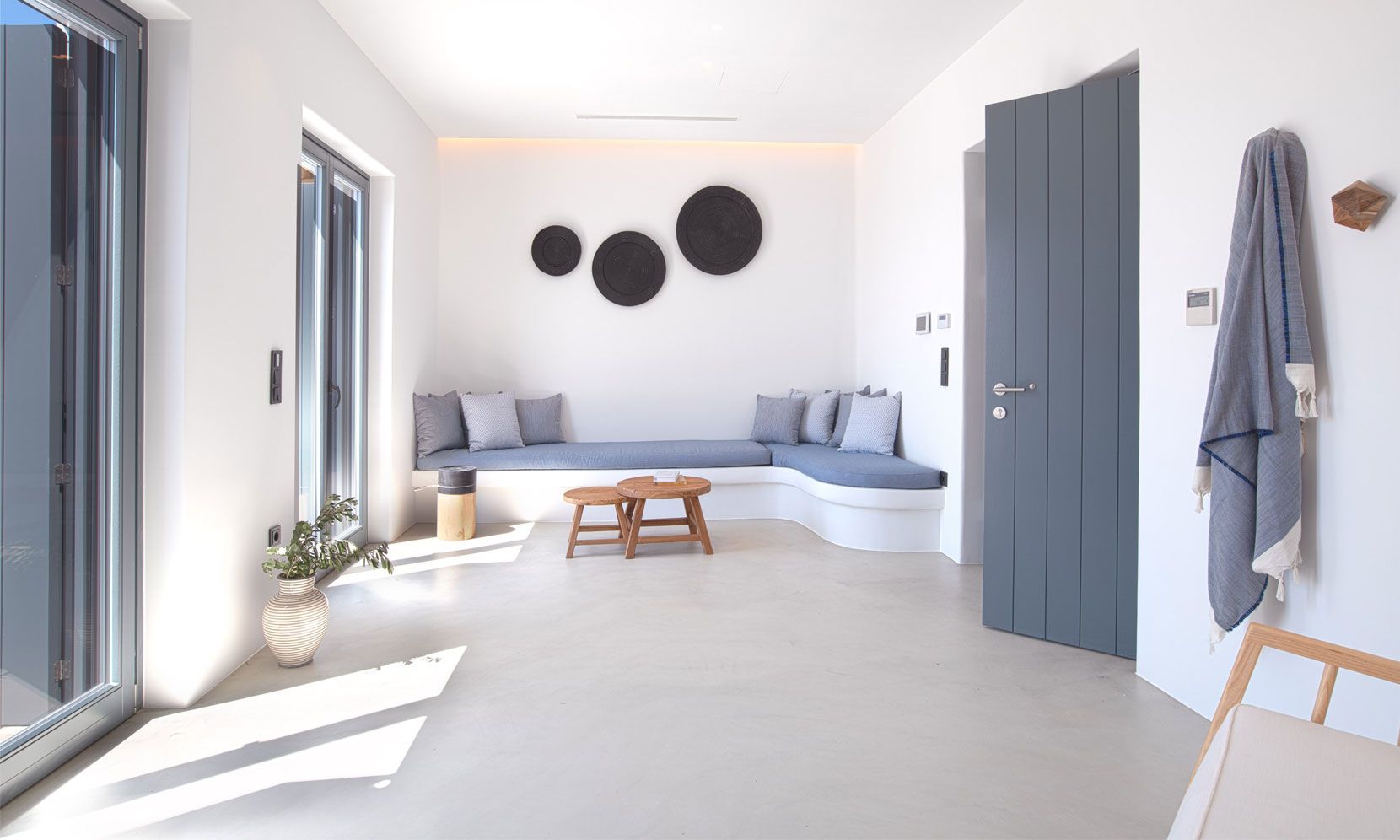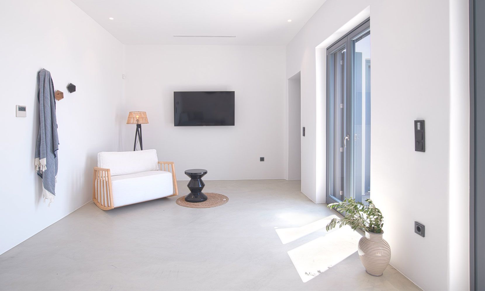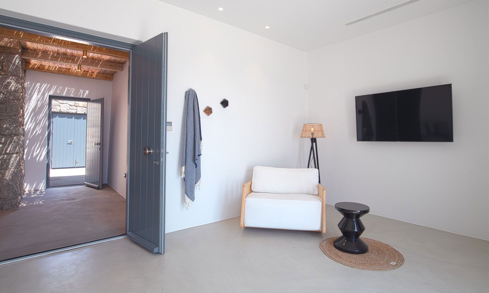 Under the traditional exterior are contemporary living areas meticulously designed to convey a sense of sophistication and relaxation at the same time. Minimal to a fault, the indoor spaces boast concrete floorings and a uniform white palette that is complemented by discrete details in black and blue. A few wooden and wicker details node to the house’s natural surroundings. There is a deliberate lack of ornaments here that serves a dual purpose: to acknowledge the fact that the landscape is the only protagonist in this scene, and to inspire a sense of absolute tranquility without unnecessary distractions. All around the house, windows and glass doors are used to connect the interior to the terraces and offer different views of the setting. The house comprises two levels; the ground level features a light-filled living room, a fully equipped kitchen, a bedroom with independent entrance and a bathroom, while the other three bedrooms and their respective bathrooms are located at the lower level.