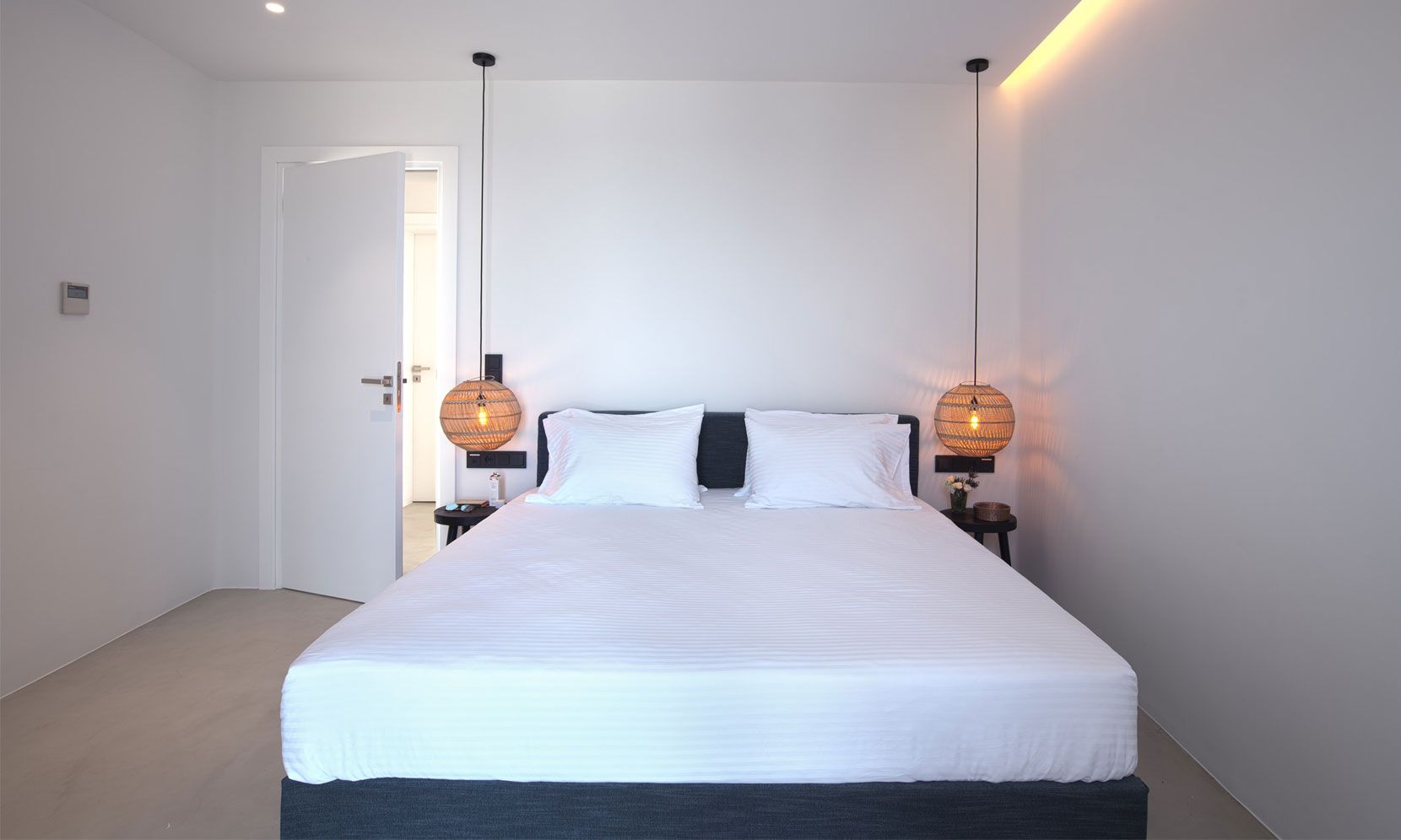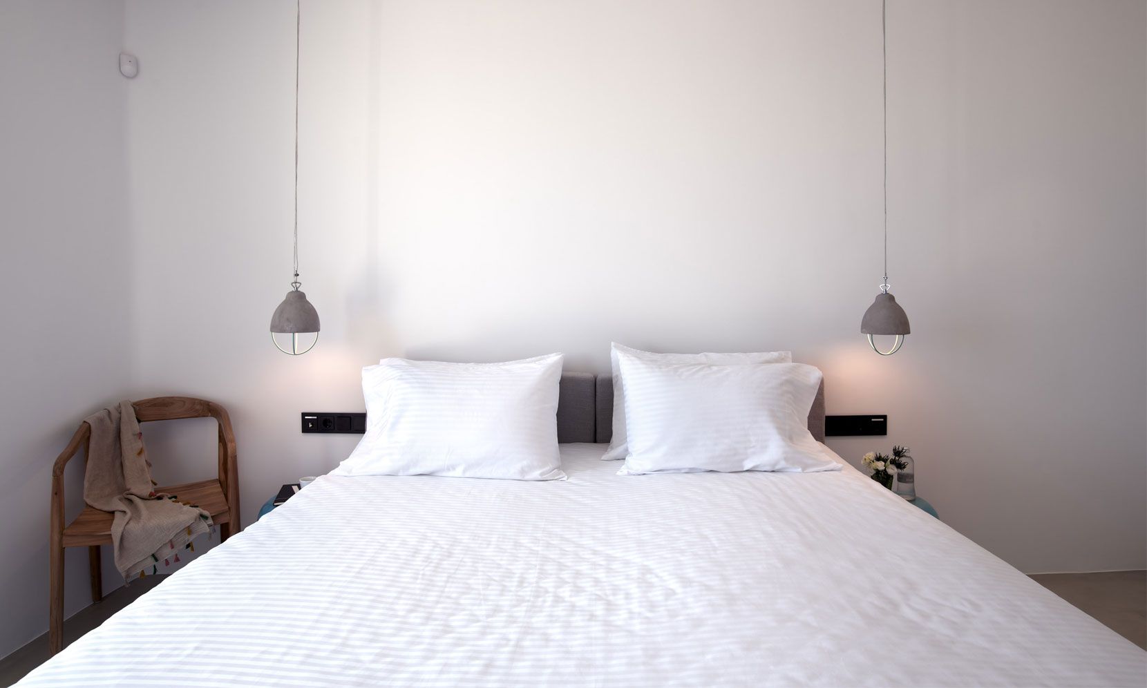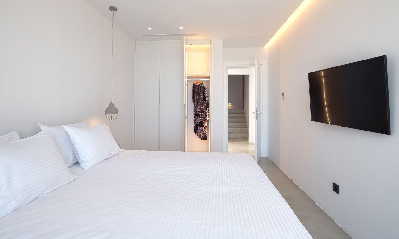 Under the traditional exterior are contemporary living areas meticulously designed to convey a sense of sophistication and relaxation at the same time. Minimal to a fault, the indoor spaces boast concrete floorings and a uniform white palette that is complemented by discrete details in black and blue. A few wooden and wicker details node to the house’s natural surroundings. There is a deliberate lack of ornaments here that serves a dual purpose: to acknowledge the fact that the landscape is the only protagonist in this scene, and to inspire a sense of absolute tranquility without unnecessary distractions. All around the house, windows and glass doors are used to connect the interior to the terraces and offer different views of the setting. The house comprises two levels; the ground level features a light-filled living room, a fully equipped kitchen, a bedroom with independent entrance and a bathroom, while the other three bedrooms and their respective bathrooms are located at the lower level.