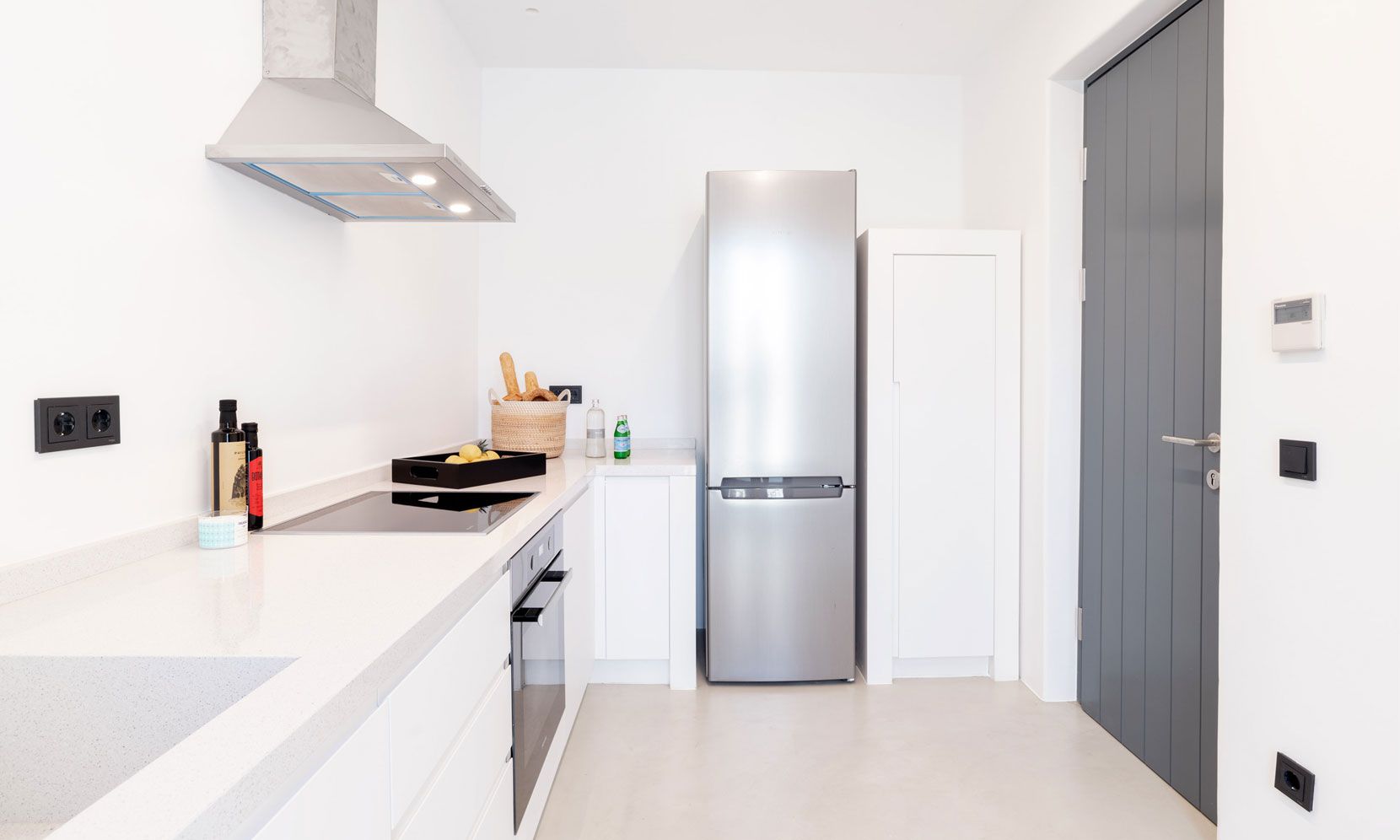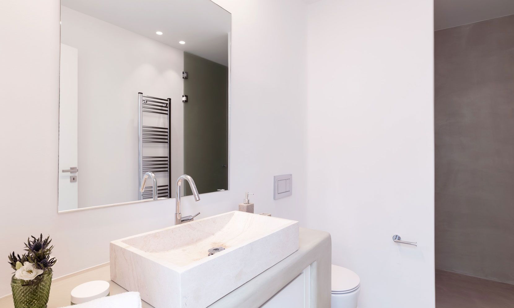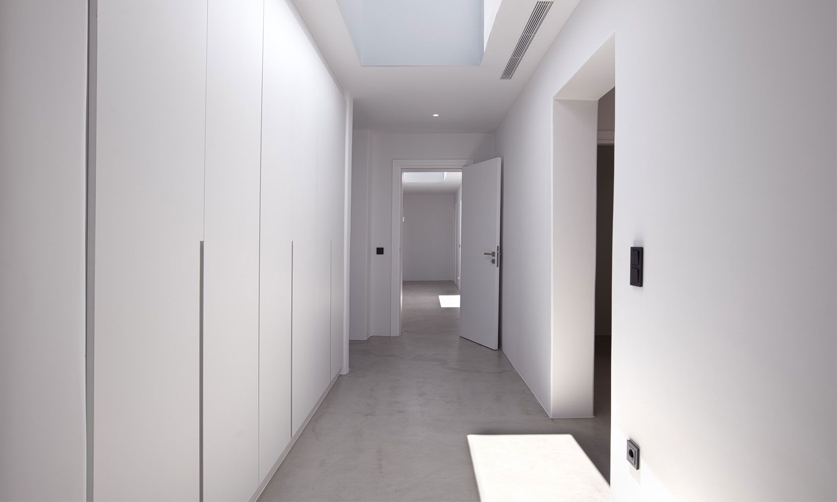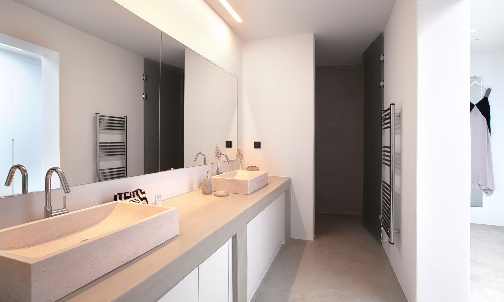 Under the traditional exterior are contemporary living areas meticulously designed to convey a sense of sophistication and relaxation at the same time. Minimal to a fault, the indoor spaces boast concrete floorings and a uniform white palette that is complemented by discrete details in black and blue. A few wooden and wicker details node to the house’s natural surroundings. There is a deliberate lack of ornaments here that serves a dual purpose: to acknowledge the fact that the landscape is the only protagonist in this scene, and to inspire a sense of absolute tranquility without unnecessary distractions. All around the house, windows and glass doors are used to connect the interior to the terraces and offer different views of the setting. The house comprises two levels; the ground level features a light-filled living room, a fully equipped kitchen, a bedroom with independent entrance and a bathroom, while the other three bedrooms and their respective bathrooms are located at the lower level.