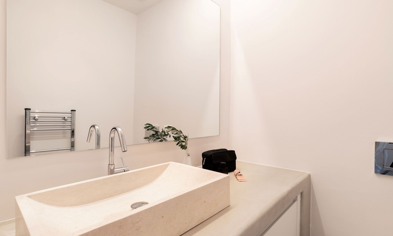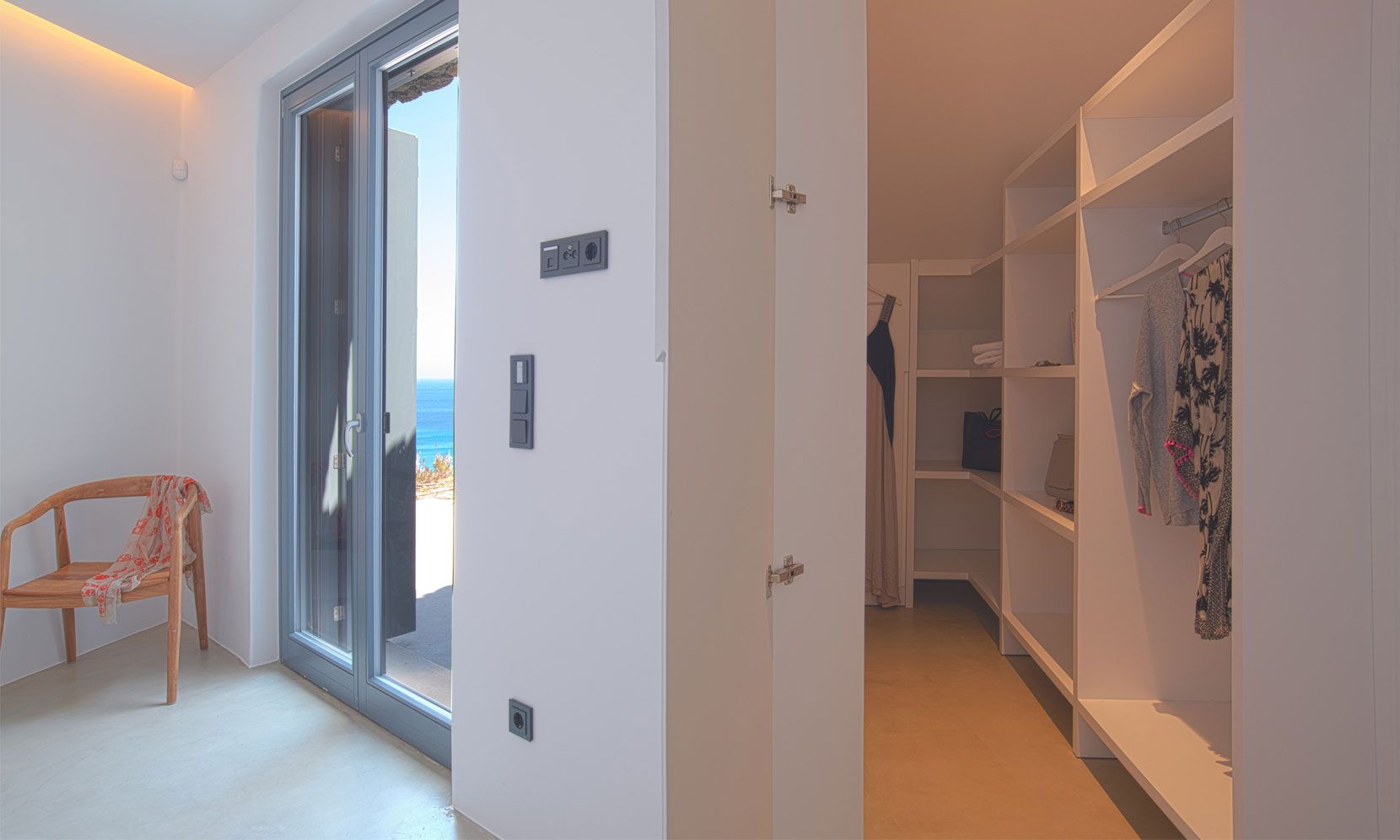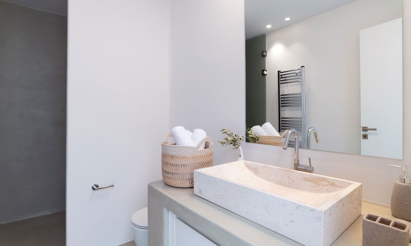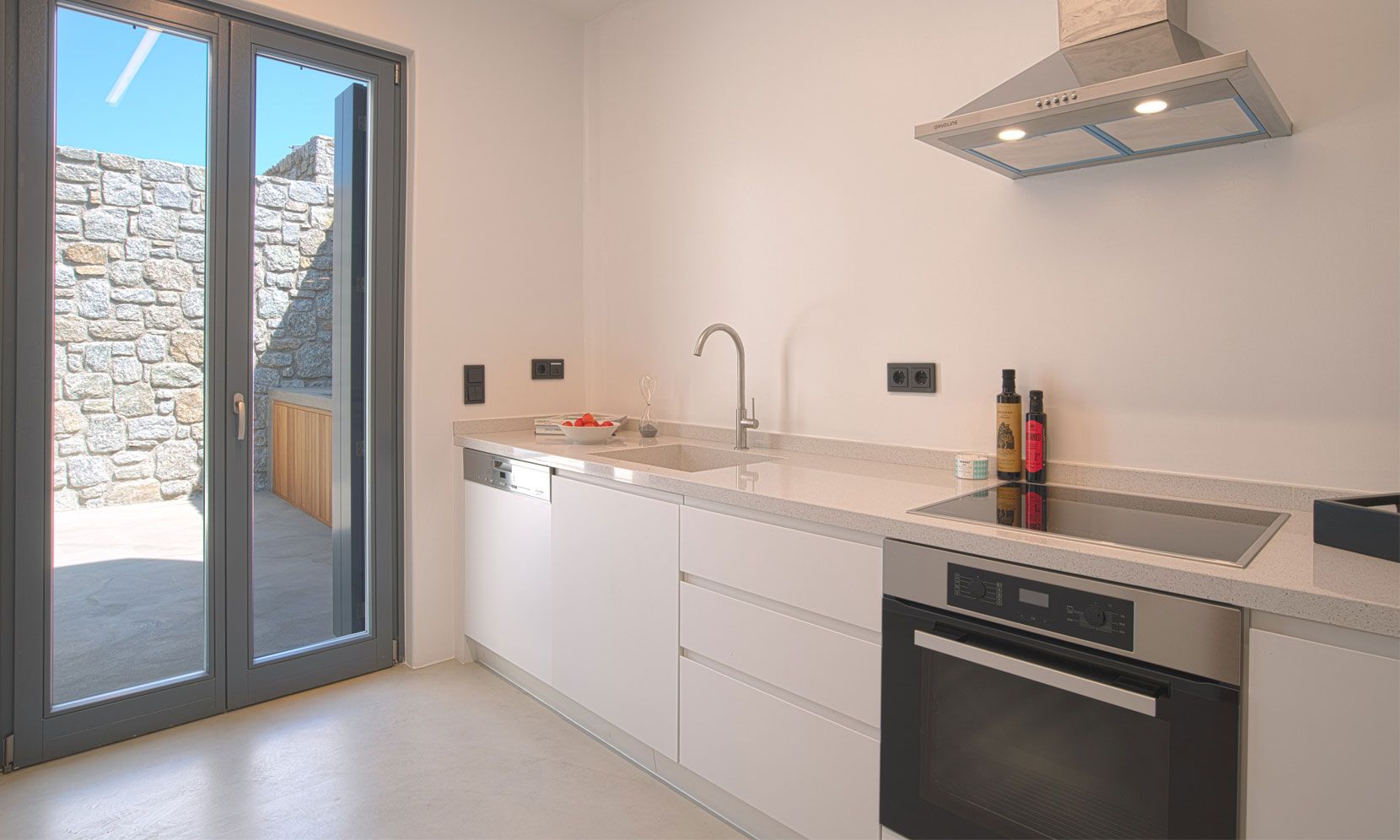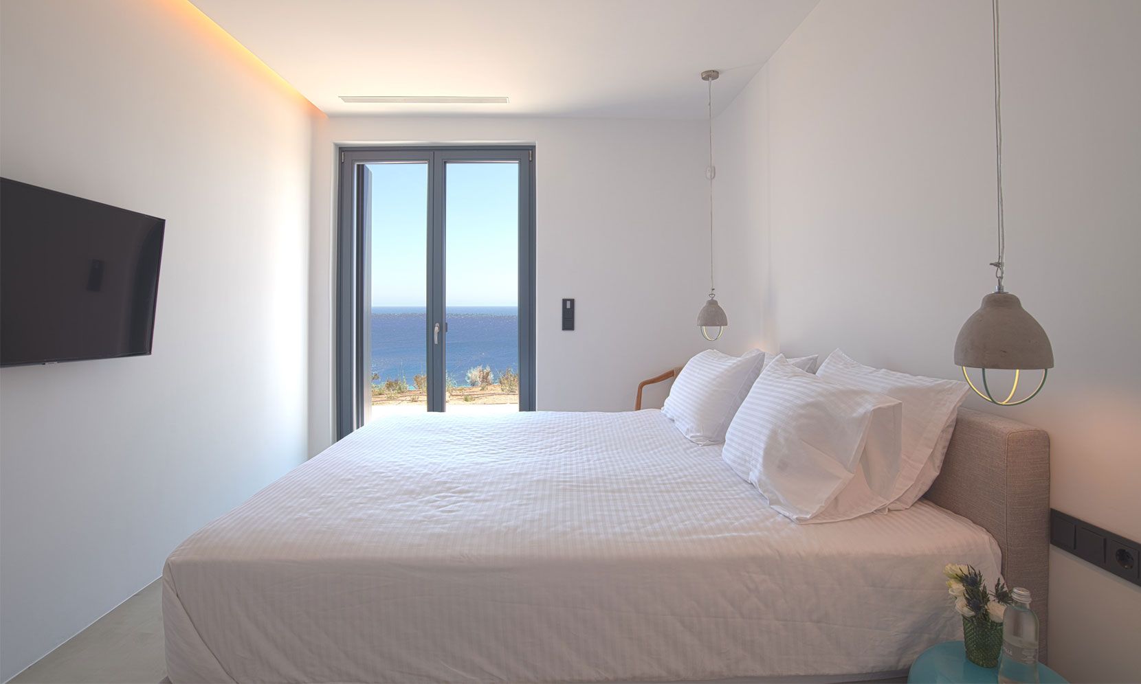 Set on a privileged plot of land that allows for magnificent views over the bay of Kalafatis, Villa Emerald 2 is a stylish 210sq.m. 4 bedroom residence that belongs to a complex of three independent vacation homes. Taking inspiration from the landscape’s dramatic contradictions, the structure is a handsome blend of ragged and refined. The dwelling’s brilliant white exterior is partially covered in stone, making it seem like it has emerged out of its setting. Perpetually infatuated with the magnificent vistas of the Aegean, the architect fitted the terrace with comfortable lounging/ dining spots, an open-air kitchen and a gorgeous infinity pool, all oriented toward a seascape that keeps changing as the day goes by.
