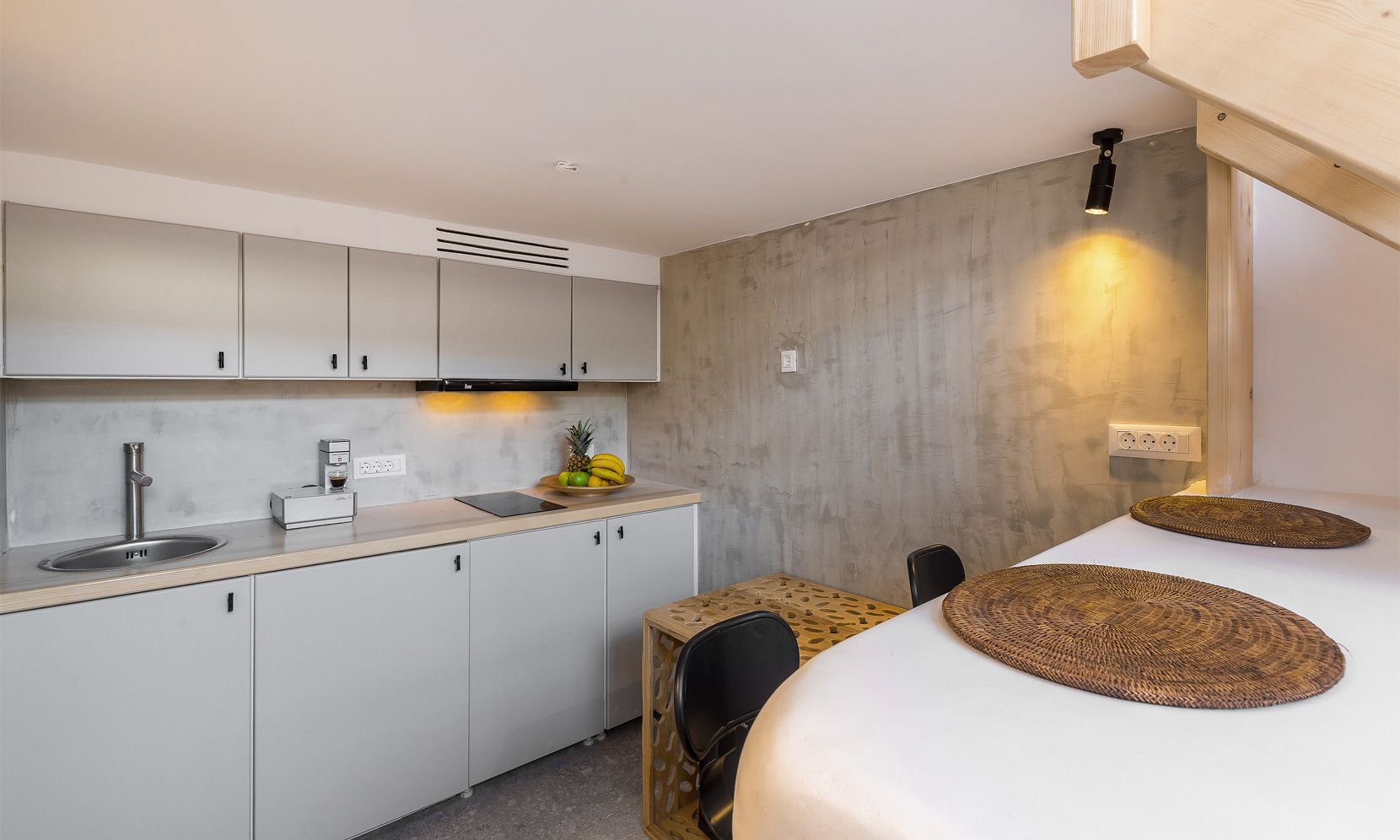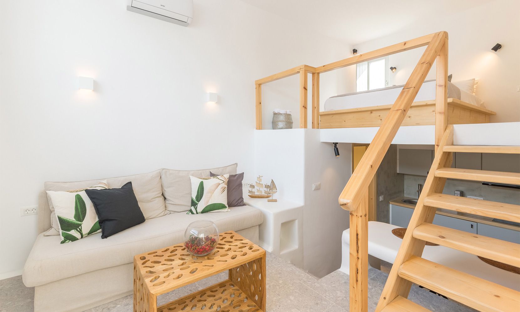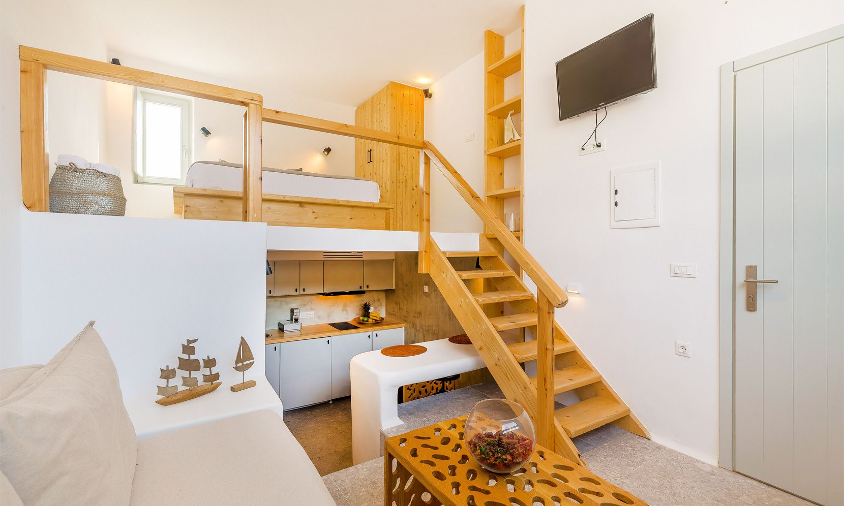 Ground level: Open plan living area with a sofa easily convertible to double bed, kitchenette and a bathroom