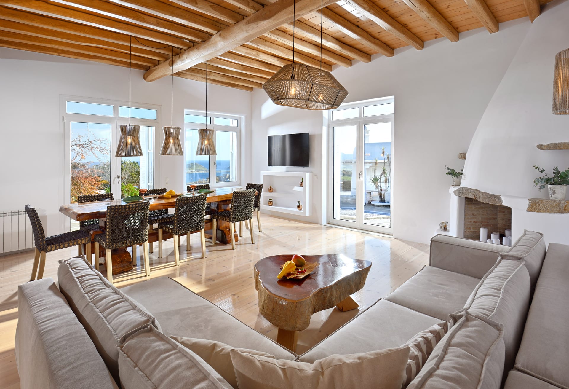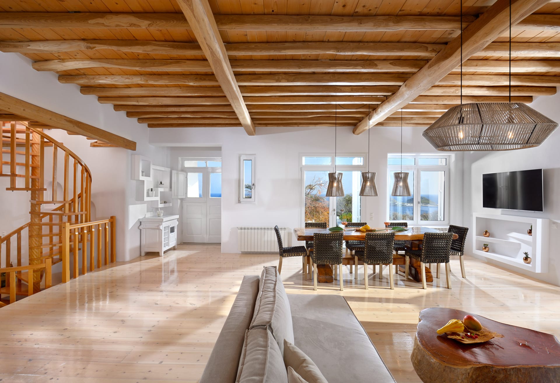 Whitewashed walls, natural stone and wood are combined with the elaborately appointed interiors of the villa.