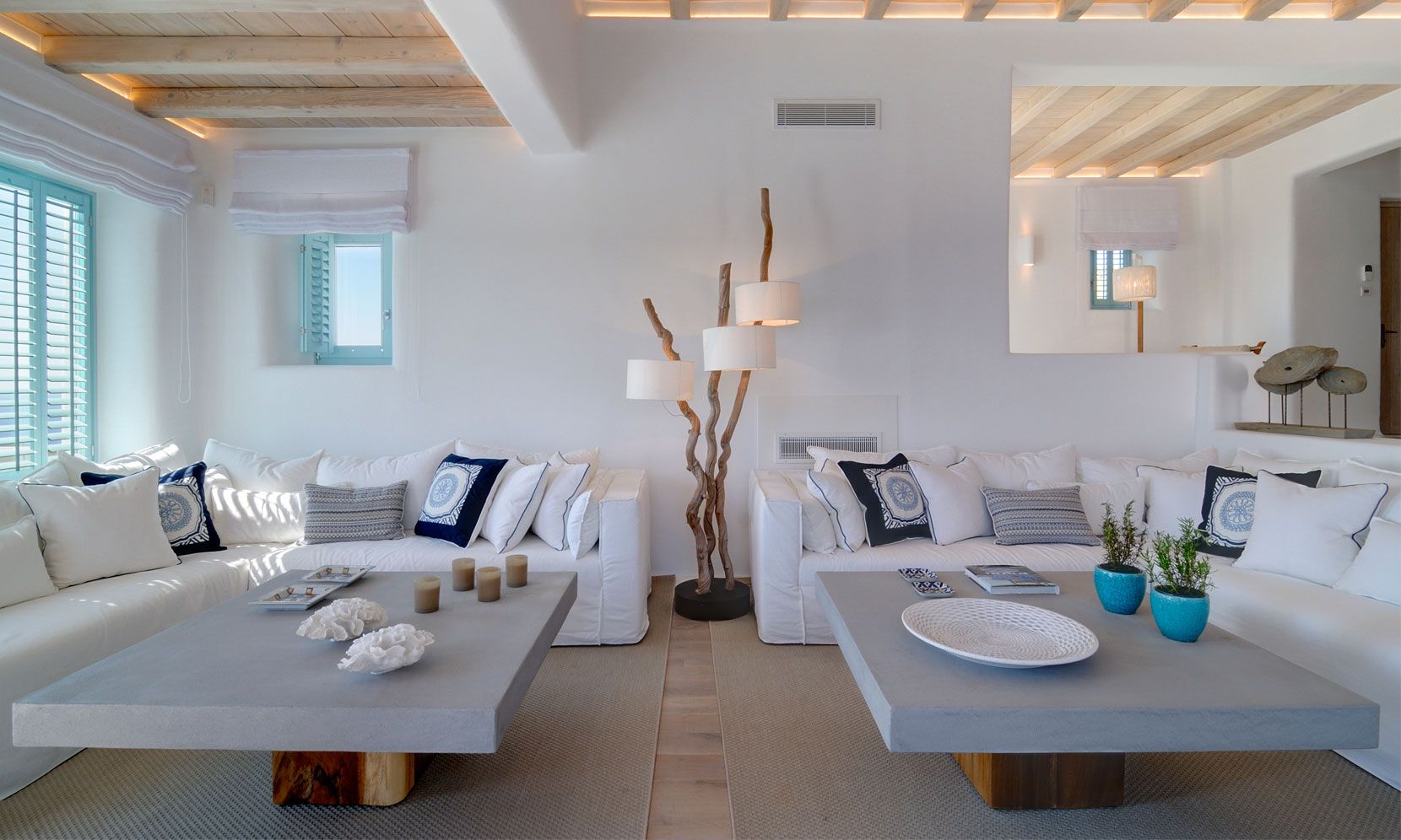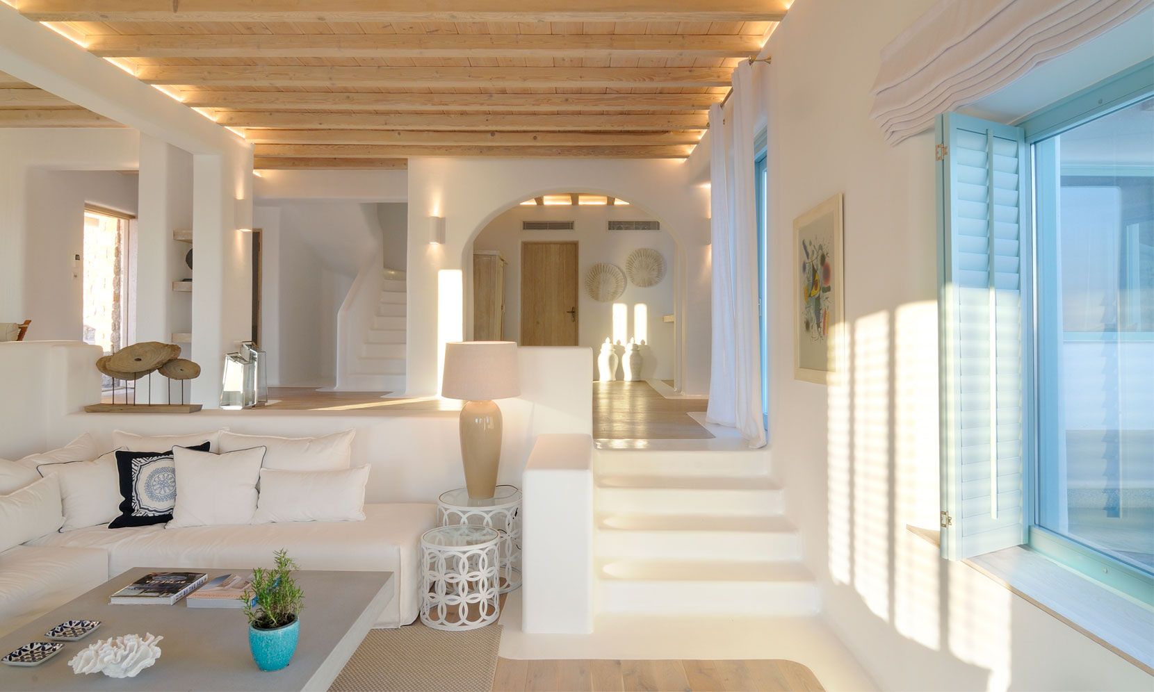 Keeping a local touch in the interior design, all living areas are warm, with soft, light wooden floors and wooden pillars at the ceiling, Cycladic arches and white surfaces.
