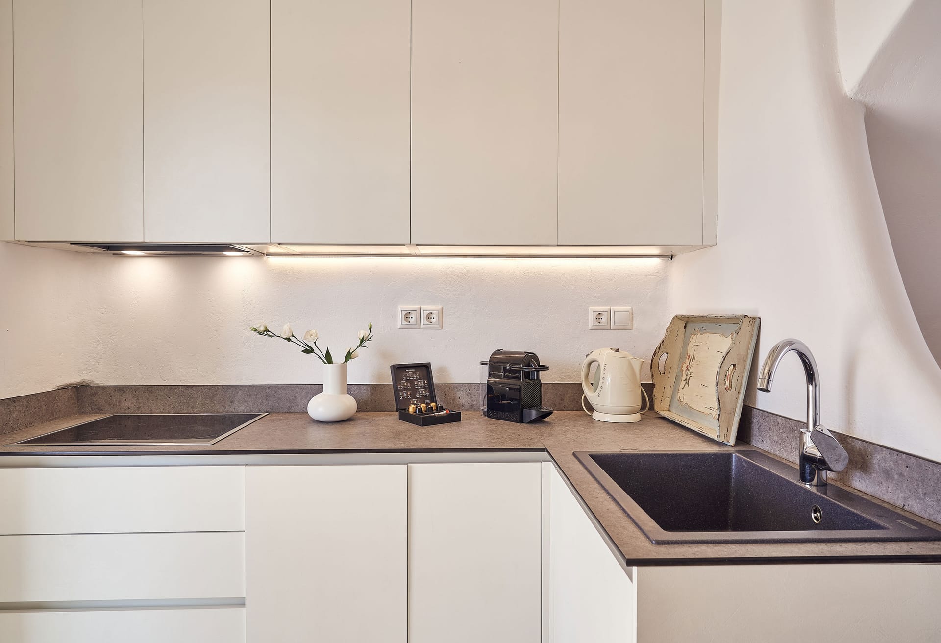 Guest house 2: 33 m2 with sea views. 1 Open patio. Queen size bed. Independent entrance. Direct access to the pool. Kitchenette. The room is equipped with a TV, fridge, tea and coffee making facilities, a safe, a hairdryer, air conditioning, toiletries and towels.