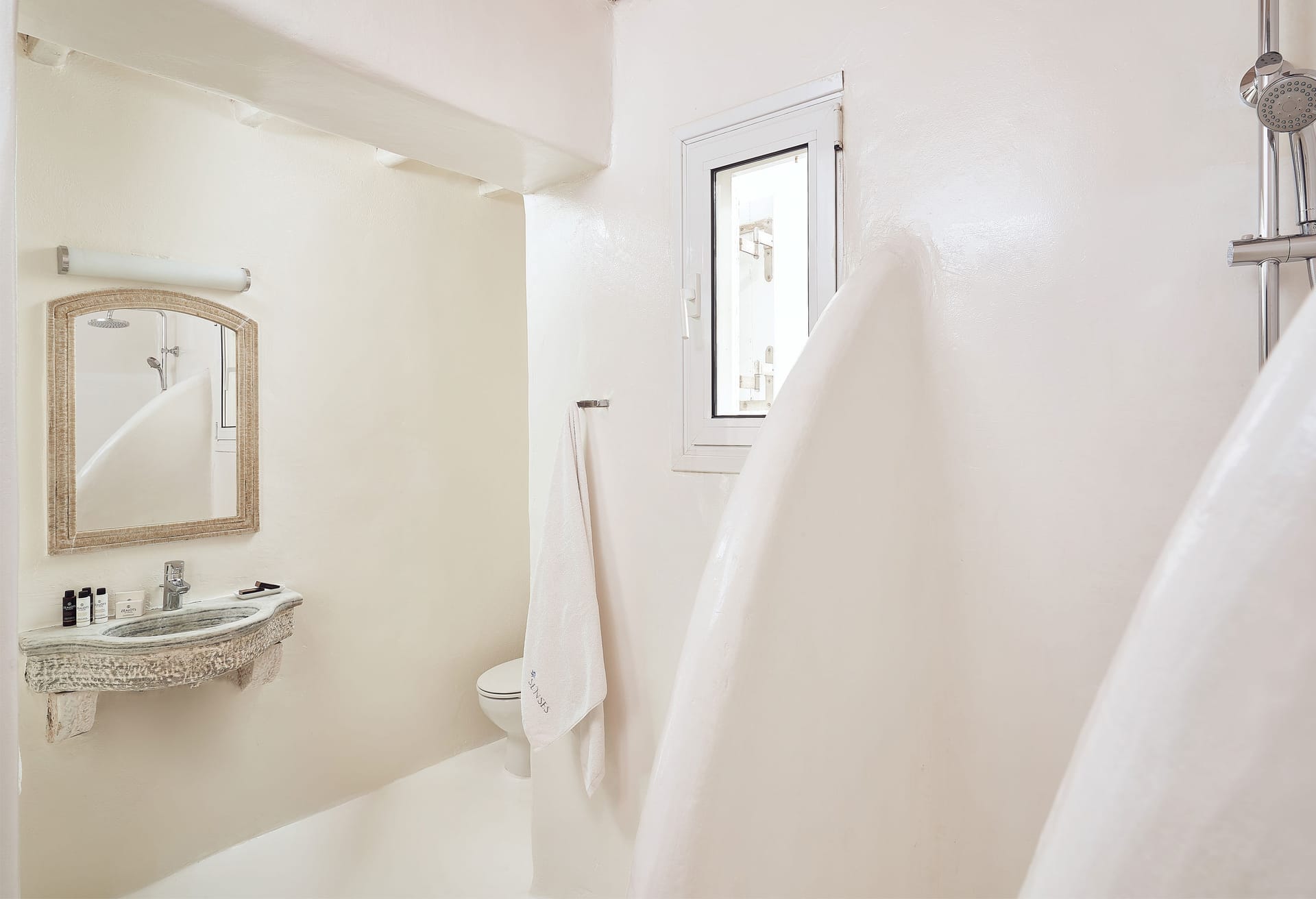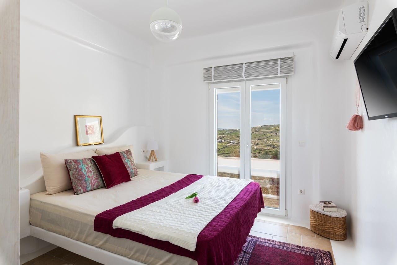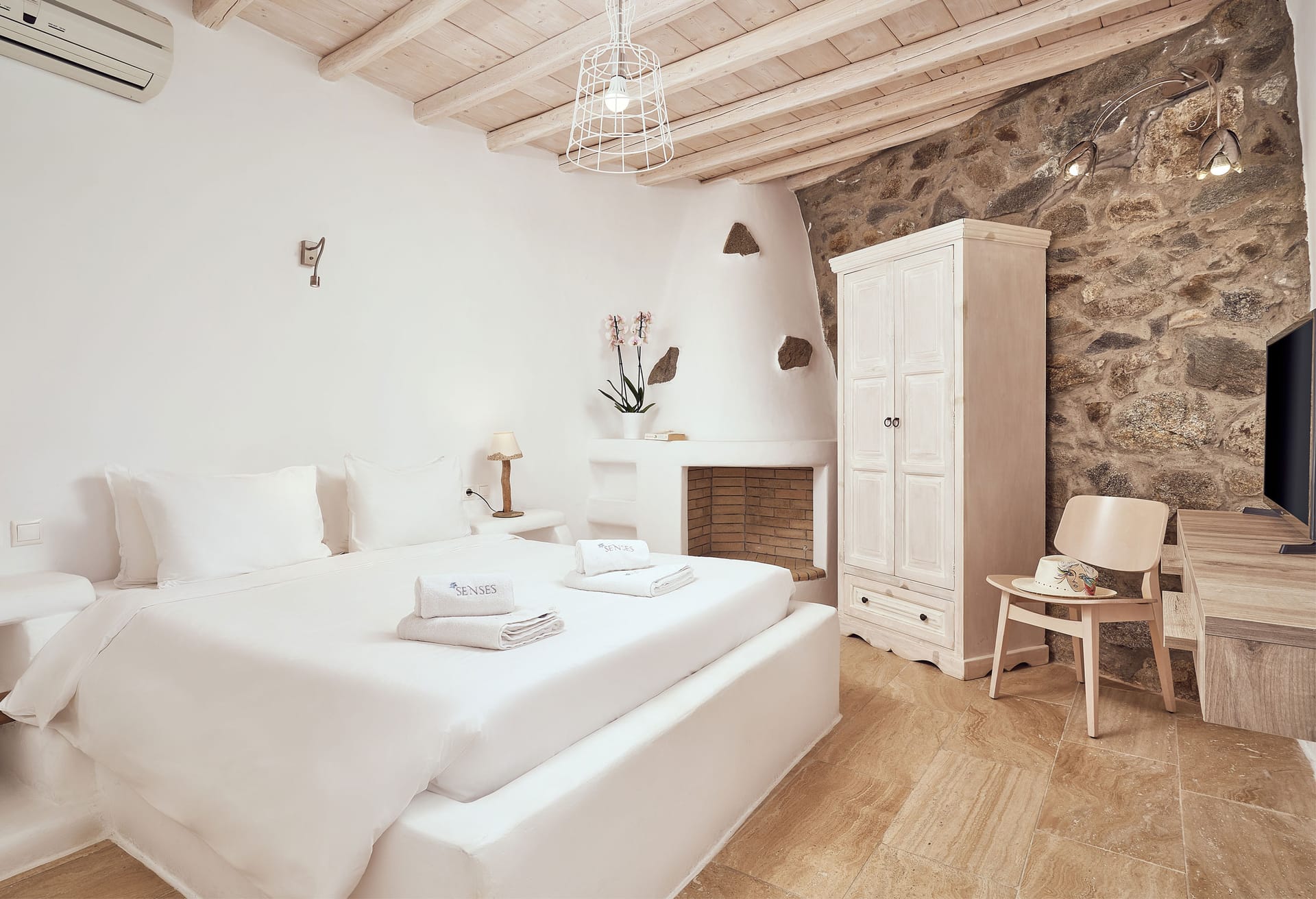 1 master bedroom 34 m2. 1 balcony of 34 m2 overlooking Mykonos town and the Aegean Sea. 1 King size bed with COCOMAT mattress. 1 fireplace, 1 hall. The room is equipped with a safe, hairdryer, air conditioning, toiletries and towels.
