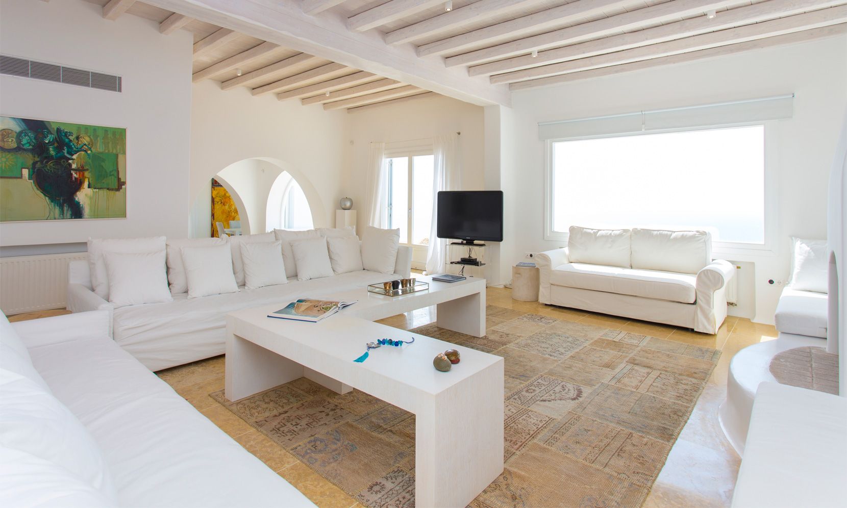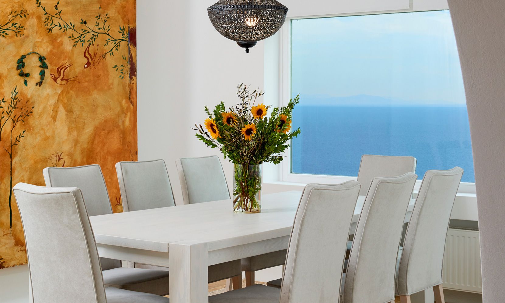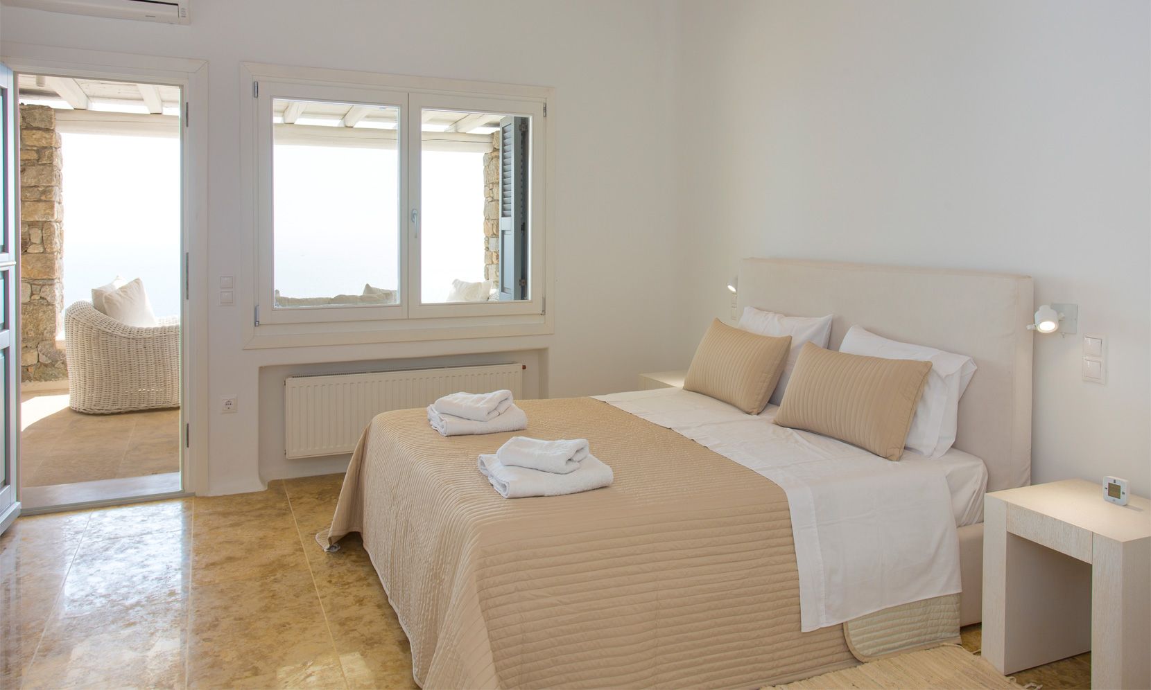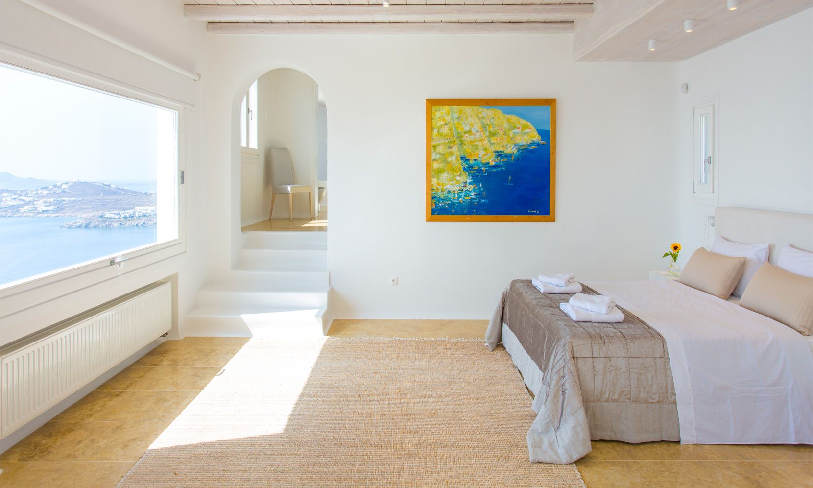 The interiors are the epitome of discreet luxury. White-washed, lavishly decorated, enriched with numerous authentic paintings, they skillfully mix contemporary design with art and connect the three levels in one and only atmosphere. The pool level contains the living and dining areas together with a fully-equipped modern kitchen, directly accessed to the outdoors. From white to creamy, soft beige and pale gray, the color palette emphasizes the natural light that deluges generously inside. The seven bedrooms, all with en-suite bathrooms, benefit from the slope of the cliff edge and provide magnificent view of the sea, even when somebody is lying in any one of the beds. Especially when stepping into the oversize master suite with the large windows and the private panoramic balcony, you will feel like flying over the Aegean sea.