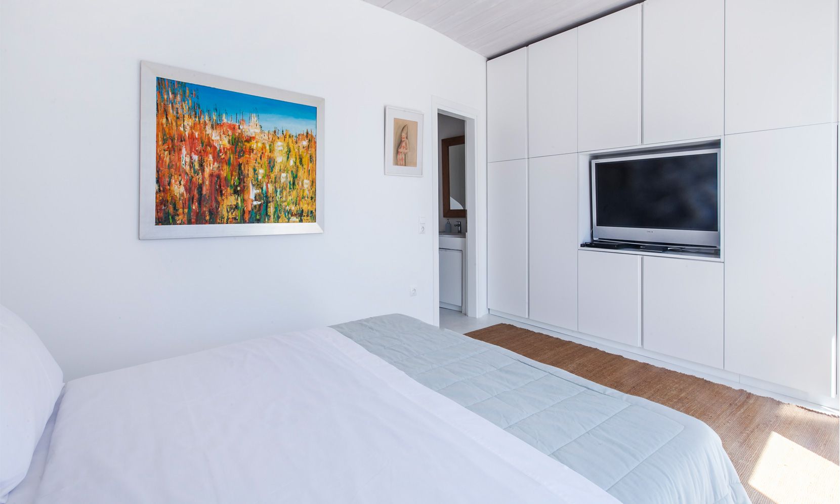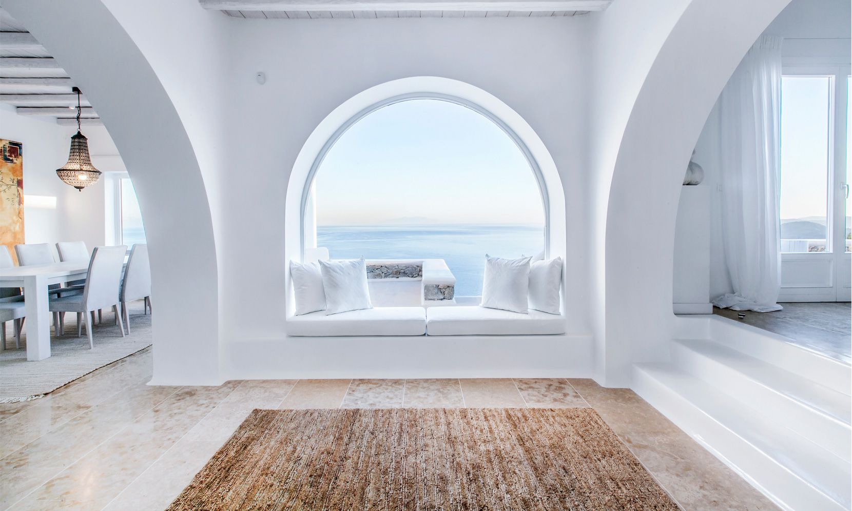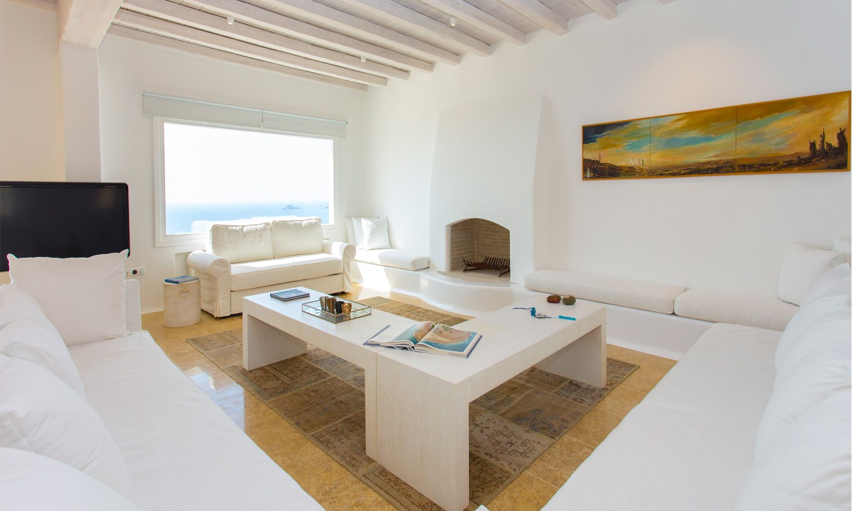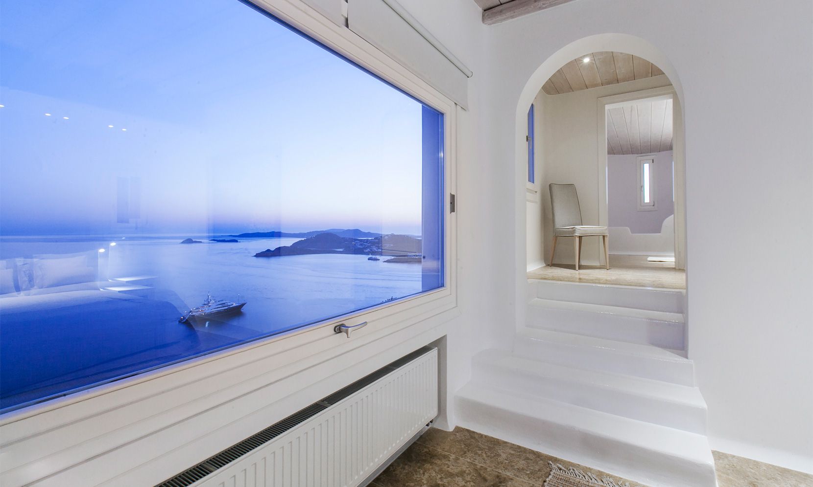 The interiors are the epitome of discreet luxury. White-washed, lavishly decorated, enriched with numerous authentic paintings, they skillfully mix contemporary design with art and connect the three levels in one and only atmosphere. The pool level contains the living and dining areas together with a fully-equipped modern kitchen, directly accessed to the outdoors. From white to creamy, soft beige and pale gray, the color palette emphasizes the natural light that deluges generously inside. The seven bedrooms, all with en-suite bathrooms, benefit from the slope of the cliff edge and provide magnificent view of the sea, even when somebody is lying in any one of the beds. Especially when stepping into the oversize master suite with the large windows and the private panoramic balcony, you will feel like flying over the Aegean sea.