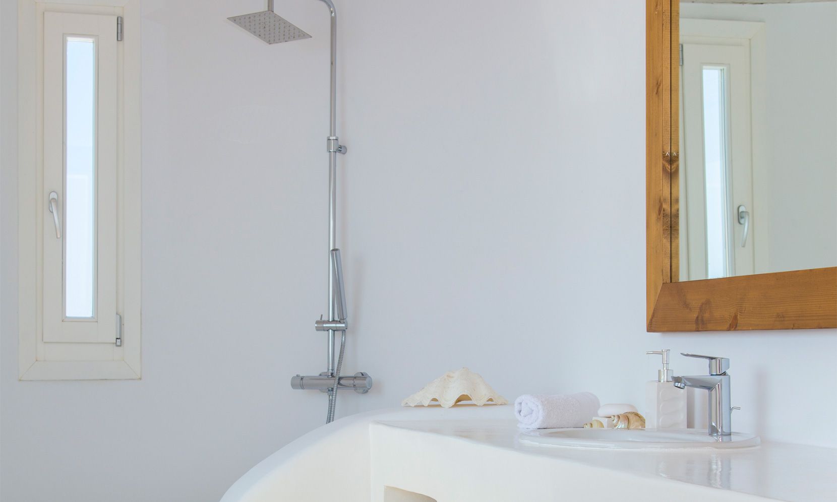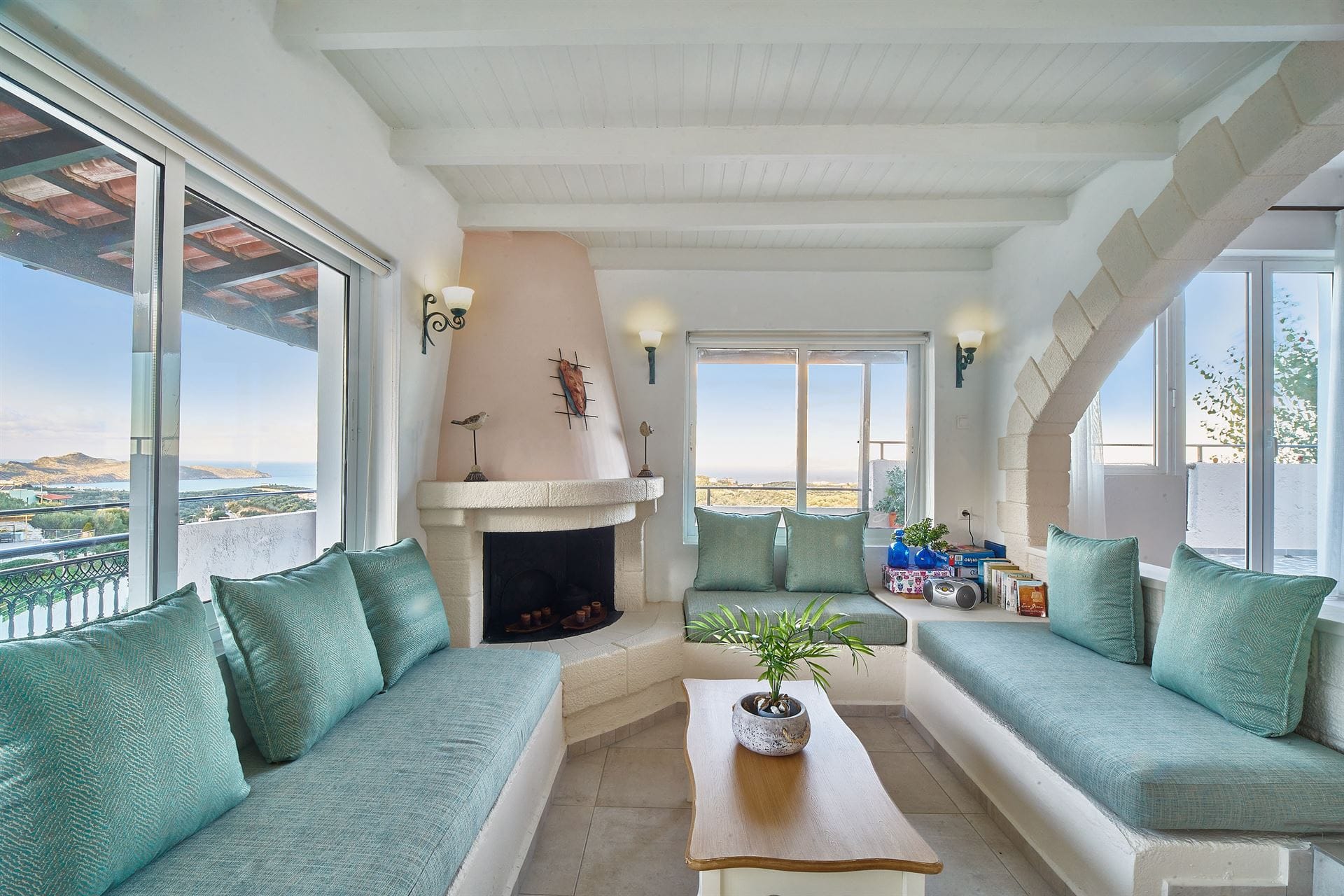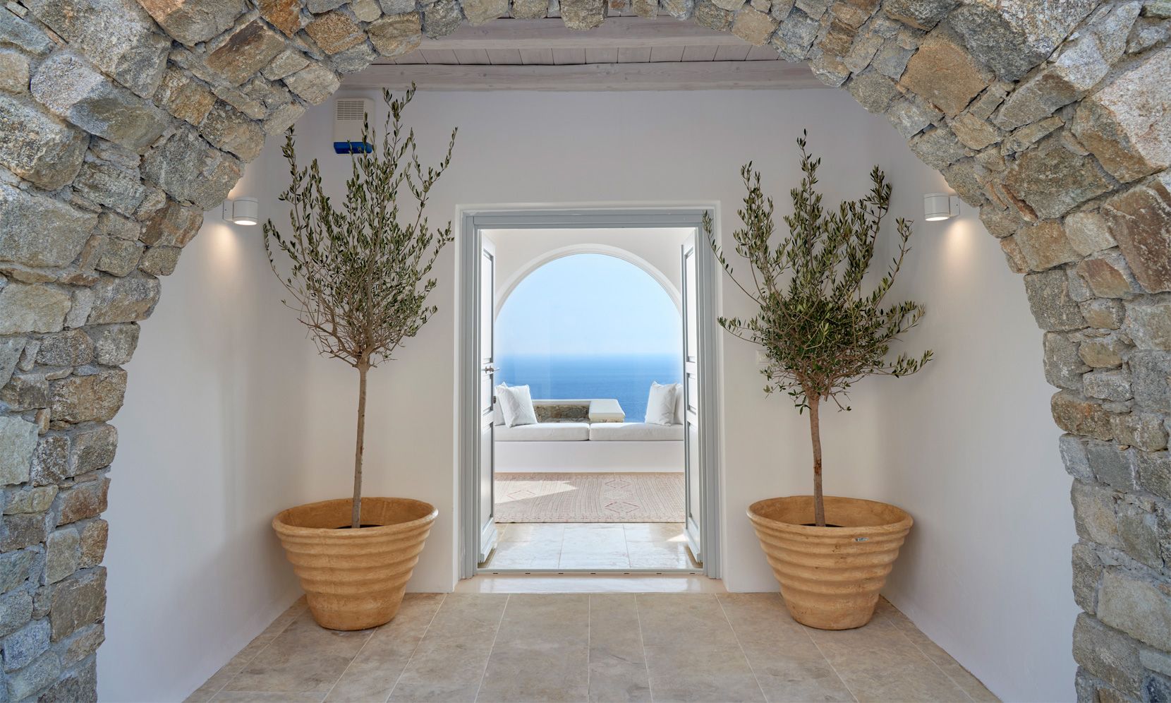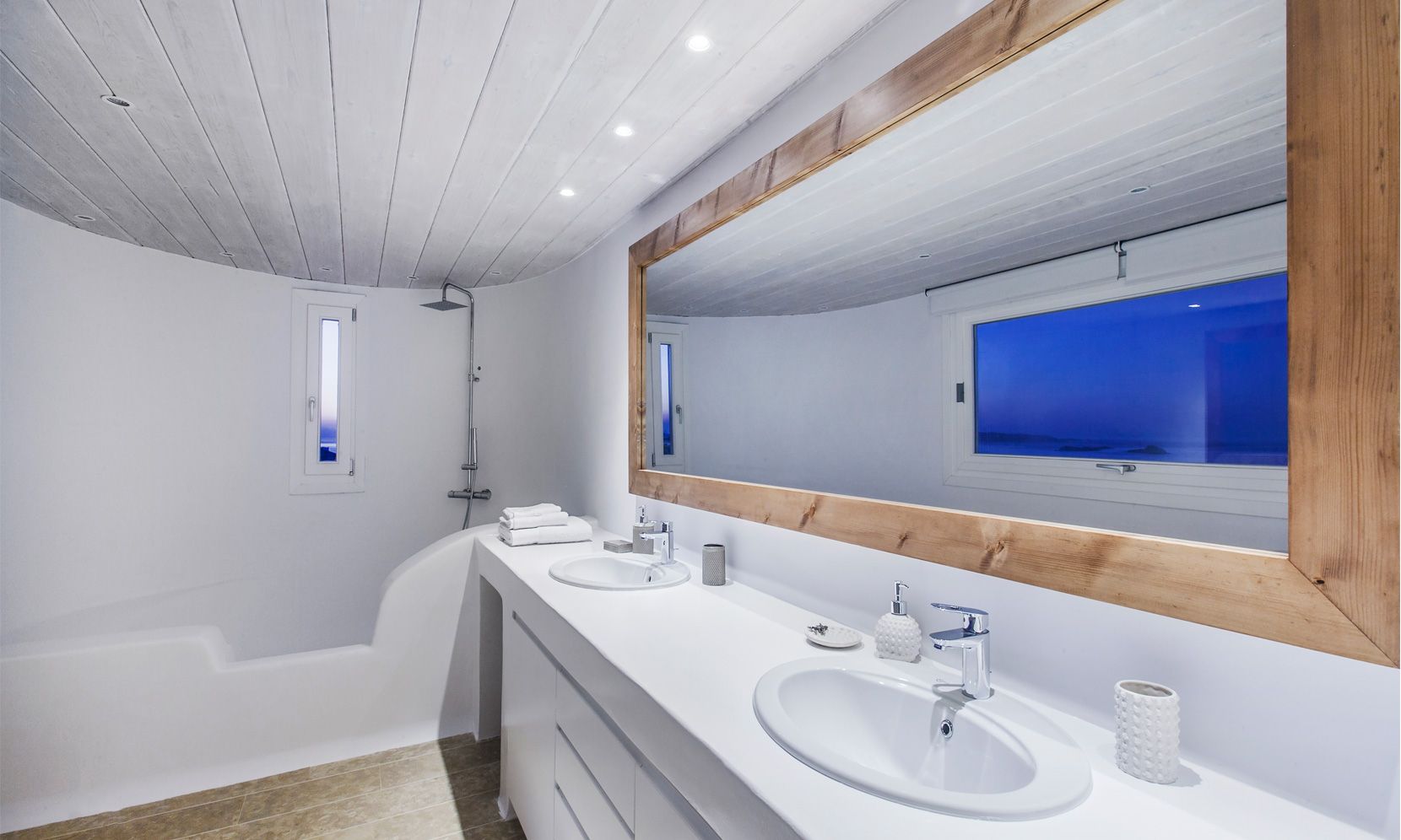 The interiors are the epitome of discreet luxury. White-washed, lavishly decorated, enriched with numerous authentic paintings, they skillfully mix contemporary design with art and connect the three levels in one and only atmosphere. The pool level contains the living and dining areas together with a fully-equipped modern kitchen, directly accessed to the outdoors. From white to creamy, soft beige and pale gray, the color palette emphasizes the natural light that deluges generously inside. The seven bedrooms, all with en-suite bathrooms, benefit from the slope of the cliff edge and provide magnificent view of the sea, even when somebody is lying in any one of the beds. Especially when stepping into the oversize master suite with the large windows and the private panoramic balcony, you will feel like flying over the Aegean sea.