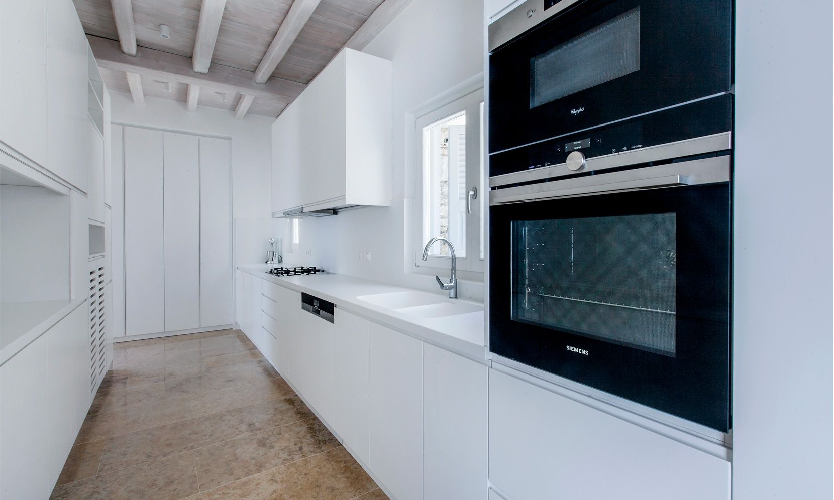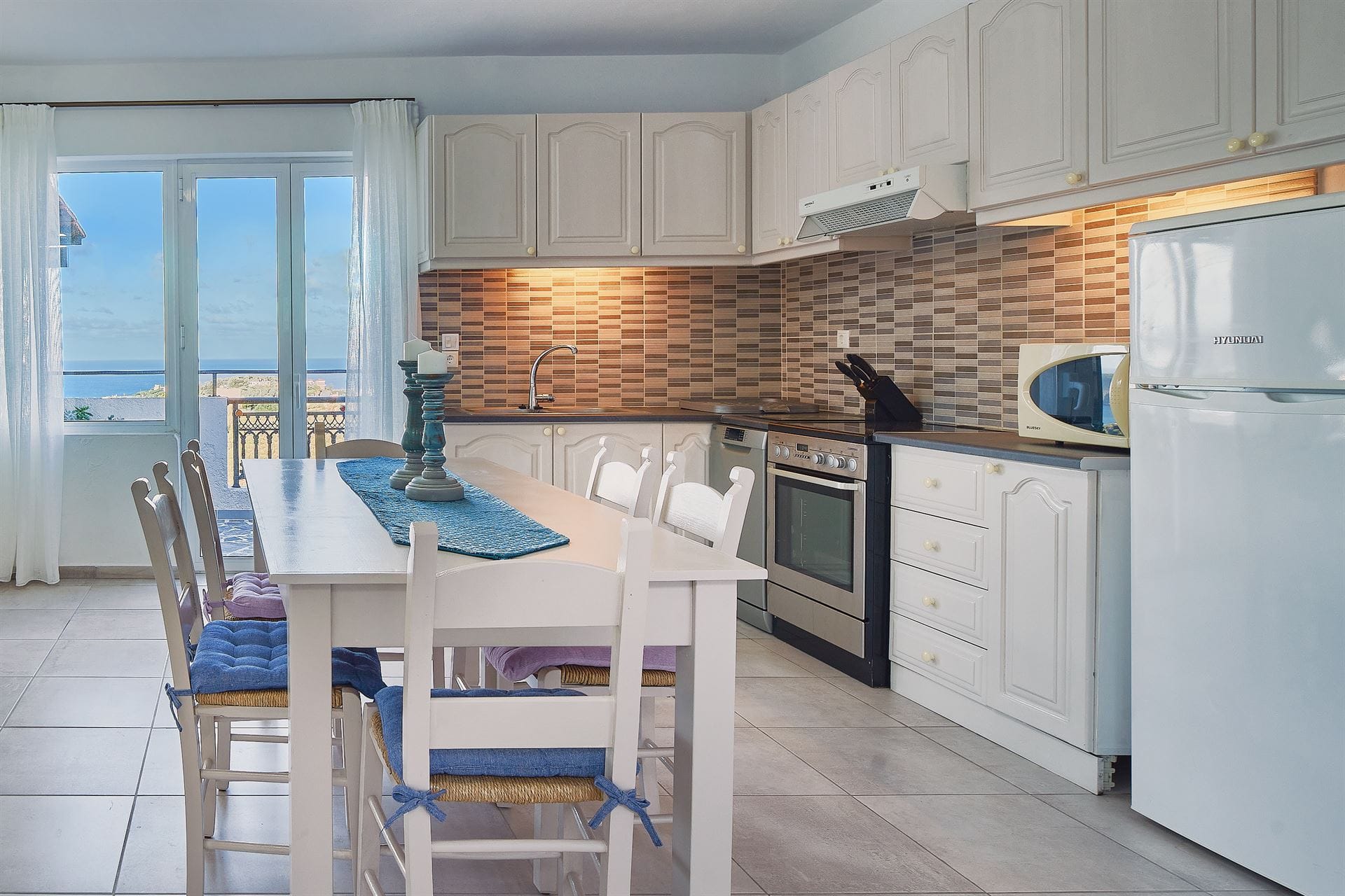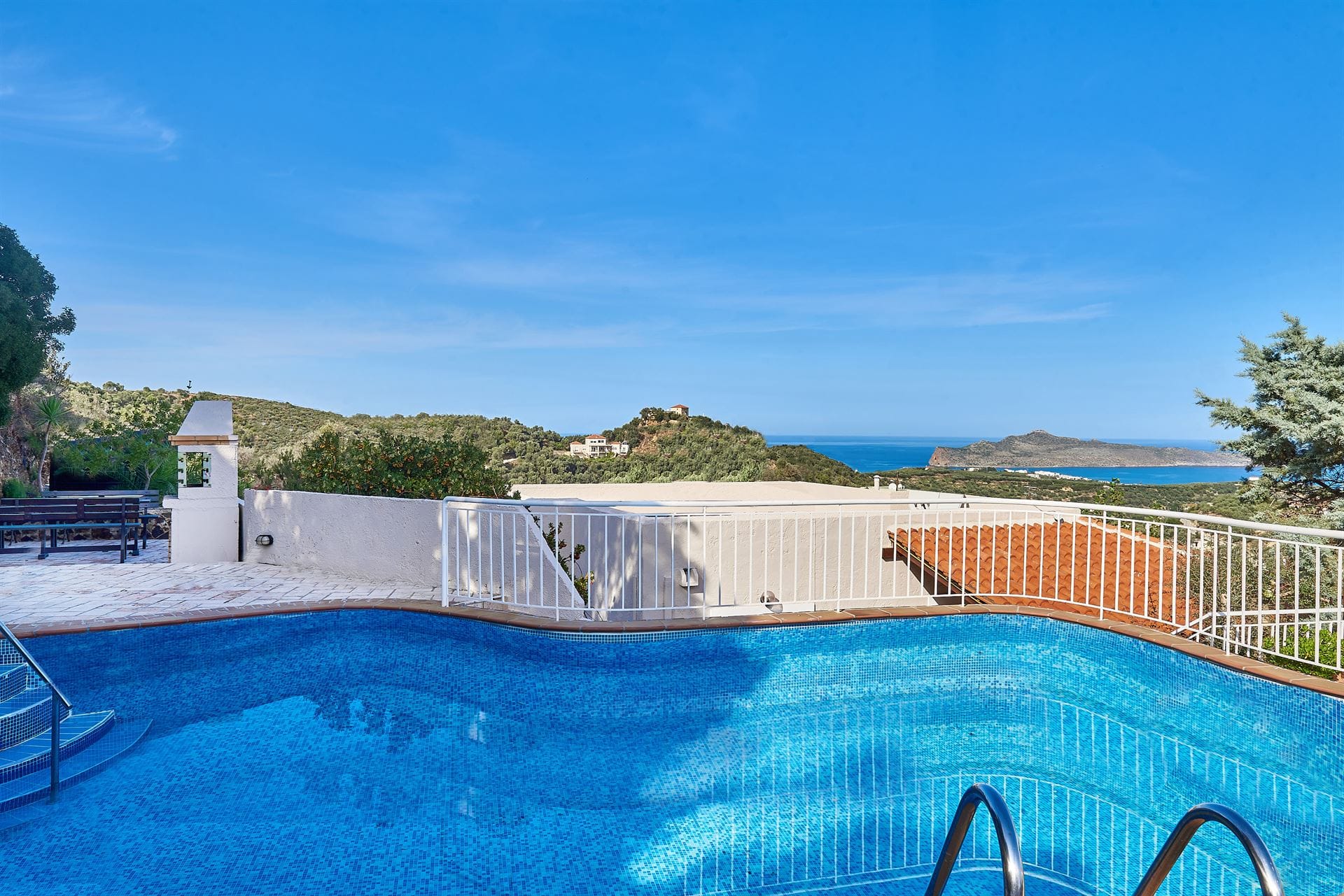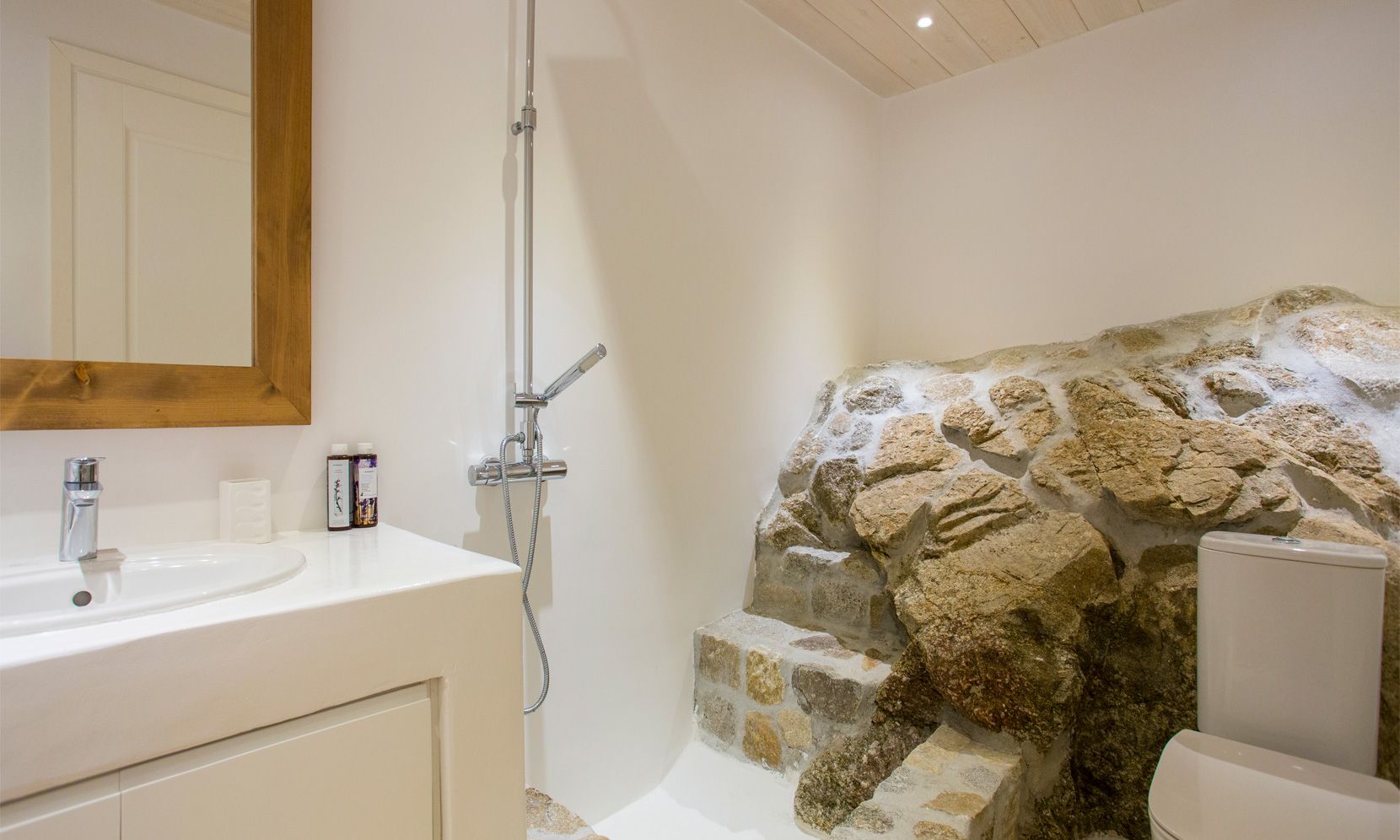 The interiors are the epitome of discreet luxury. White-washed, lavishly decorated, enriched with numerous authentic paintings, they skillfully mix contemporary design with art and connect the three levels in one and only atmosphere. The pool level contains the living and dining areas together with a fully-equipped modern kitchen, directly accessed to the outdoors. From white to creamy, soft beige and pale gray, the color palette emphasizes the natural light that deluges generously inside. The seven bedrooms, all with en-suite bathrooms, benefit from the slope of the cliff edge and provide magnificent view of the sea, even when somebody is lying in any one of the beds. Especially when stepping into the oversize master suite with the large windows and the private panoramic balcony, you will feel like flying over the Aegean sea.