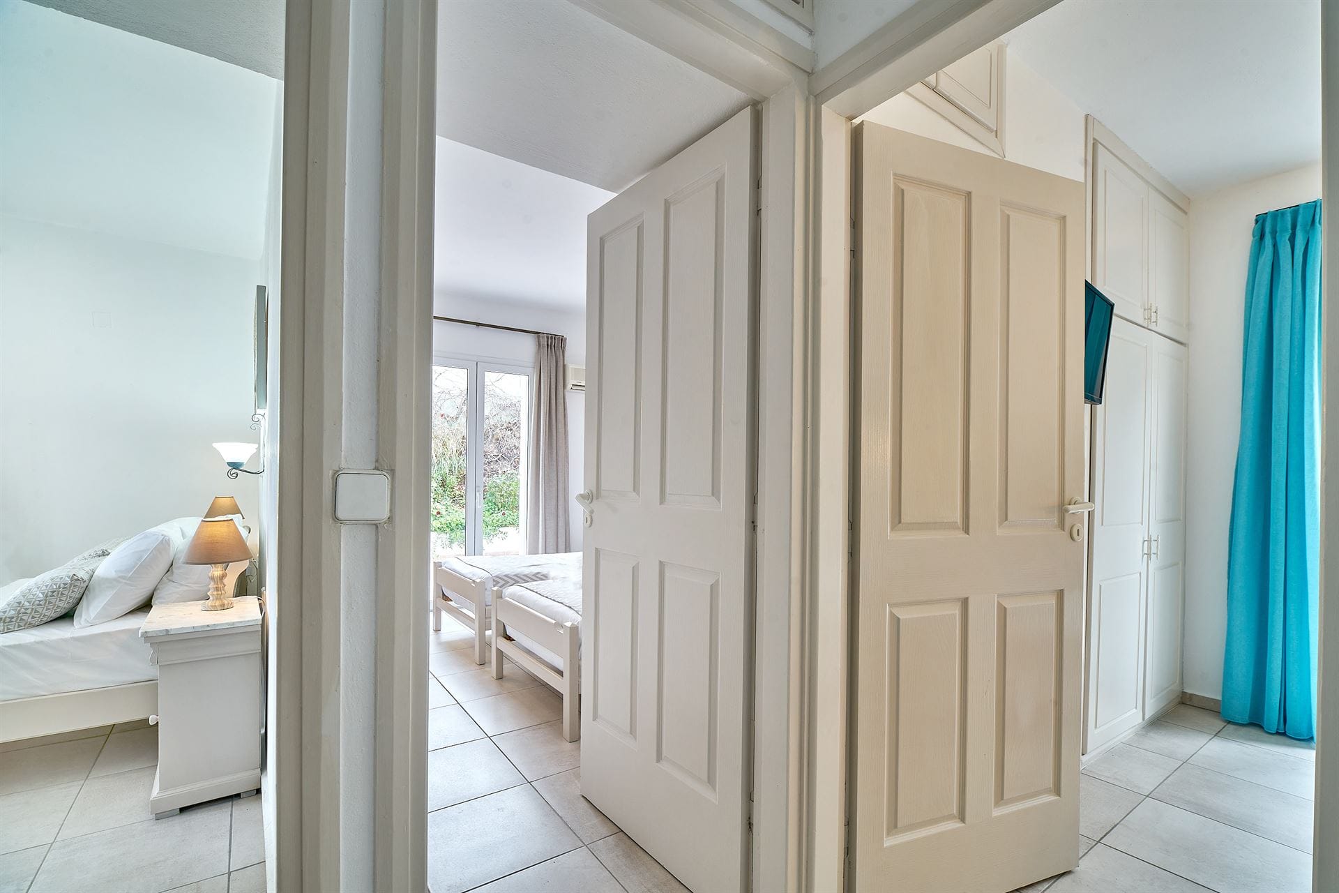Middle level: Two bedrooms with independent entrances, the one with queen size bed, the other with single bed, both with en-suite shower bathrooms, air conditioning, access to terrace, sea view