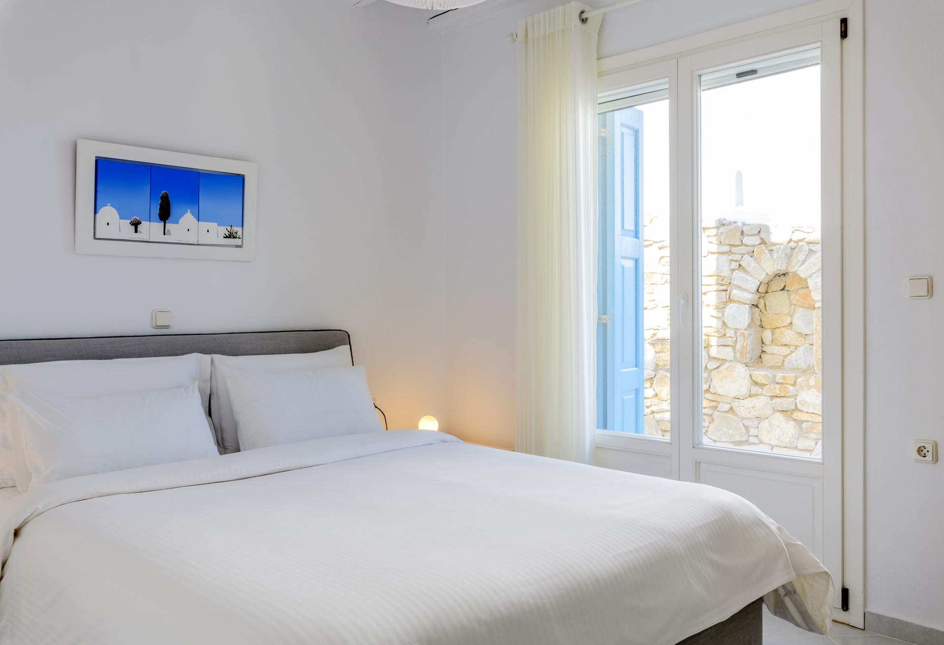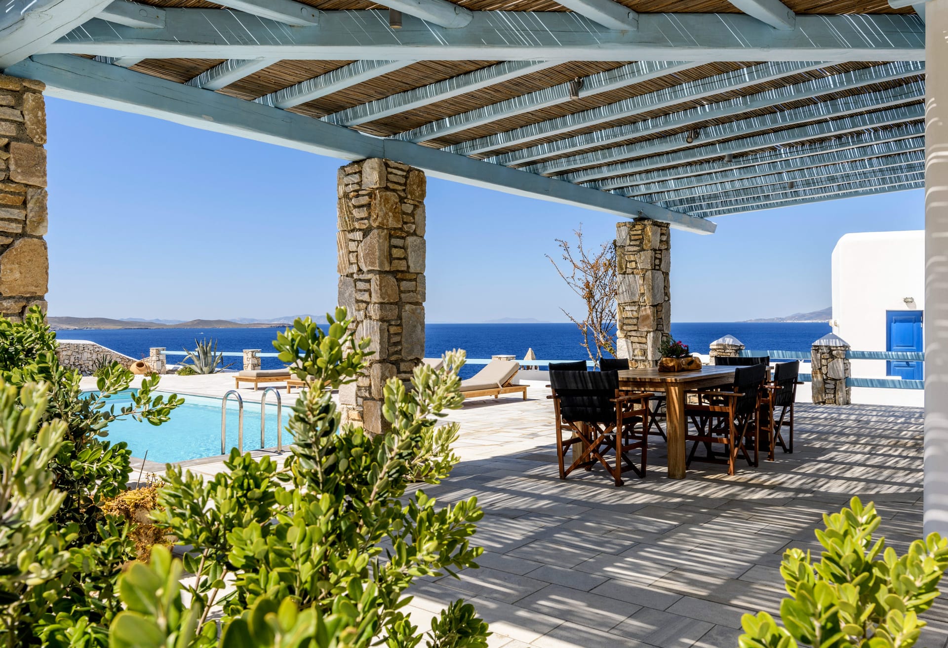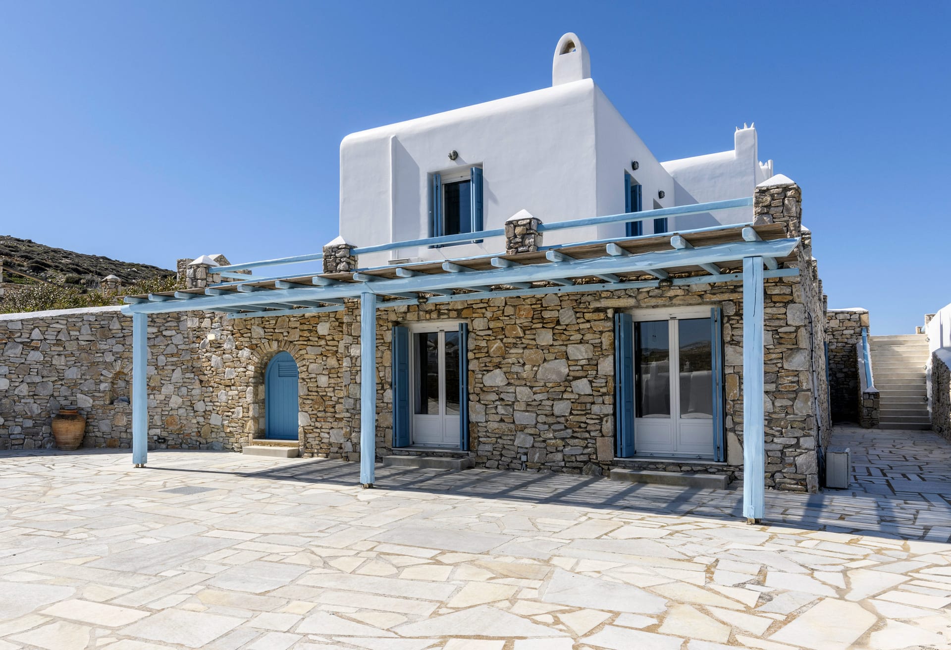 Mykonos Villa Lennox is a private traditional Villas, located on a unique seaside spot at the exclusive southern part of Mykonos, Kanalia. The porperty offers unique views, overlookingthe Aegean Sea, Delos and Rhenia islands and Mykonos Town.