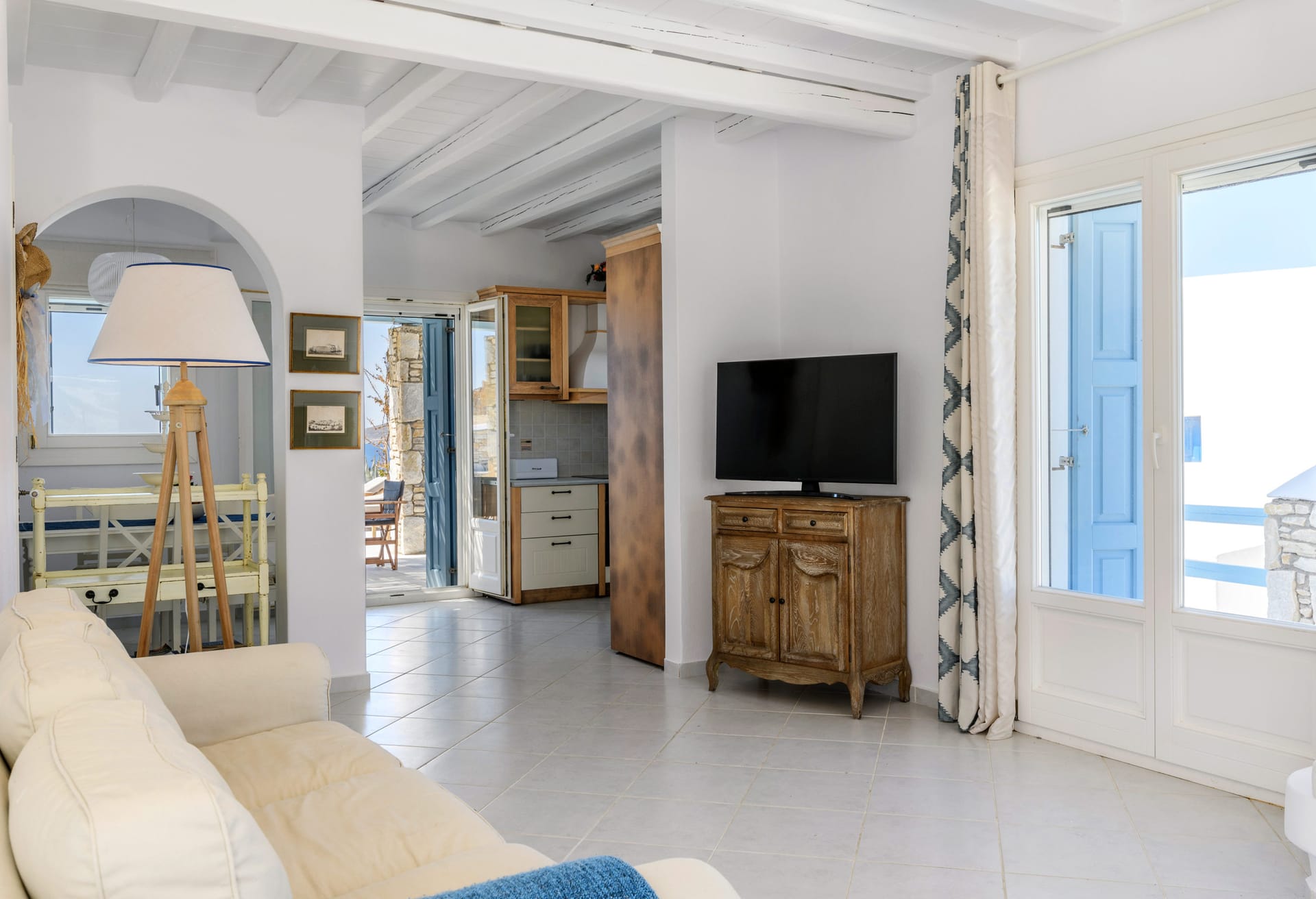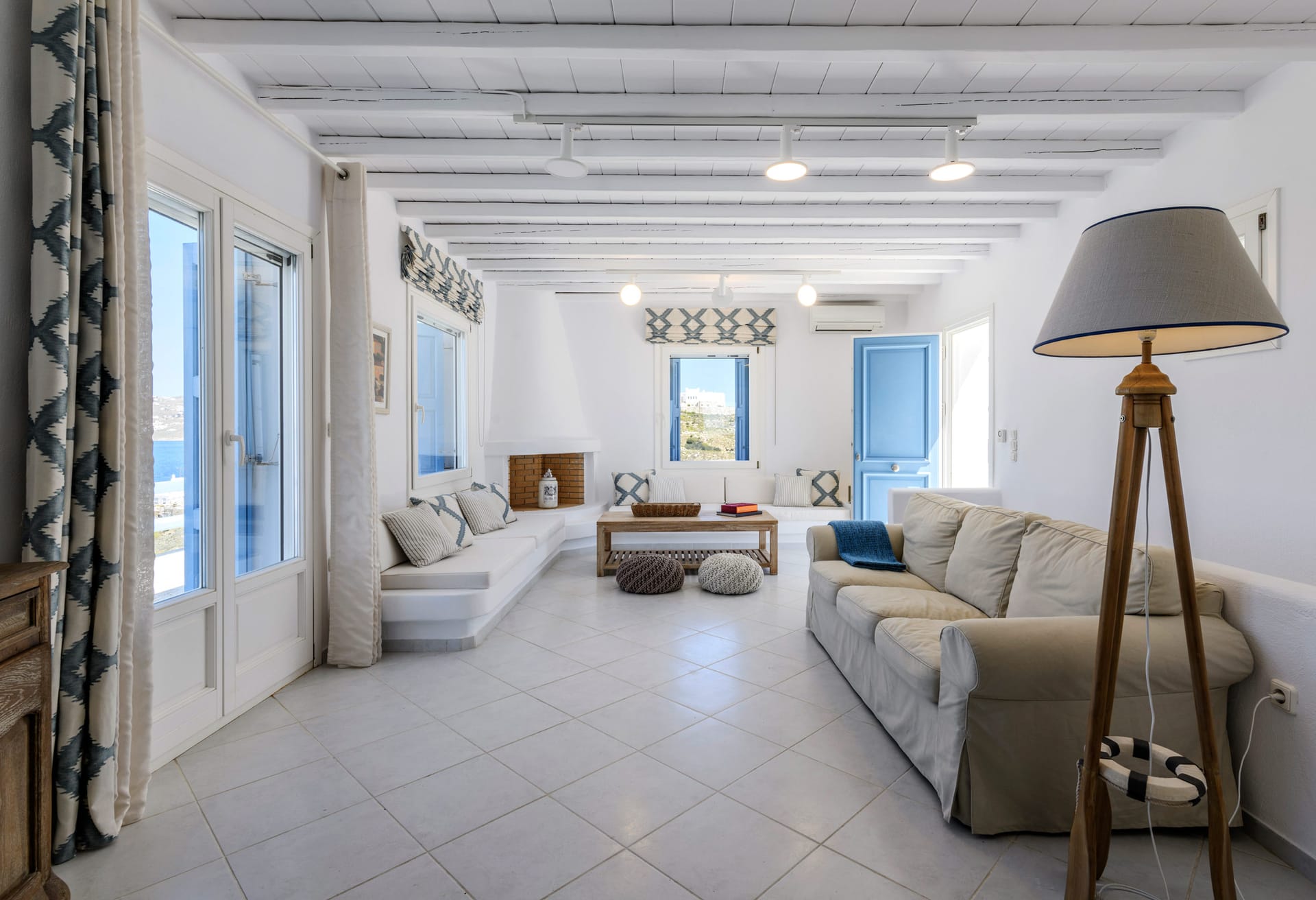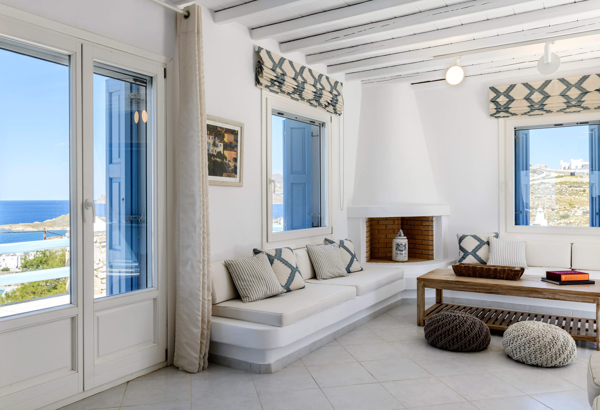 Living room with fireplace and view to Mykonos Town and Aegean Sea