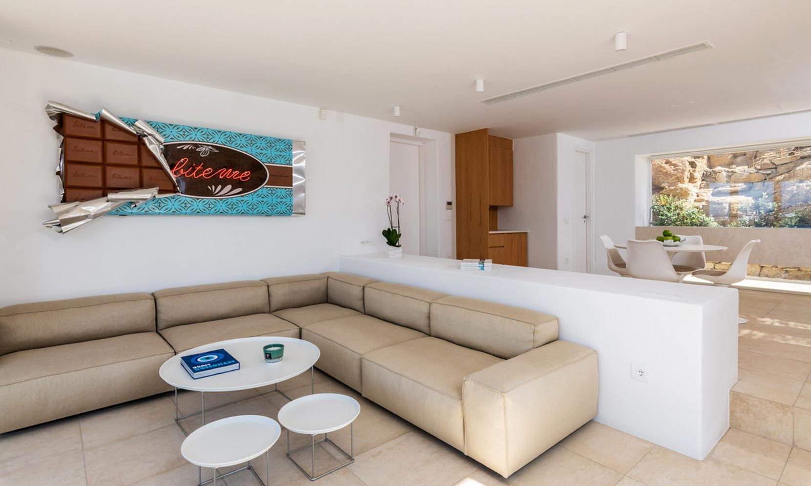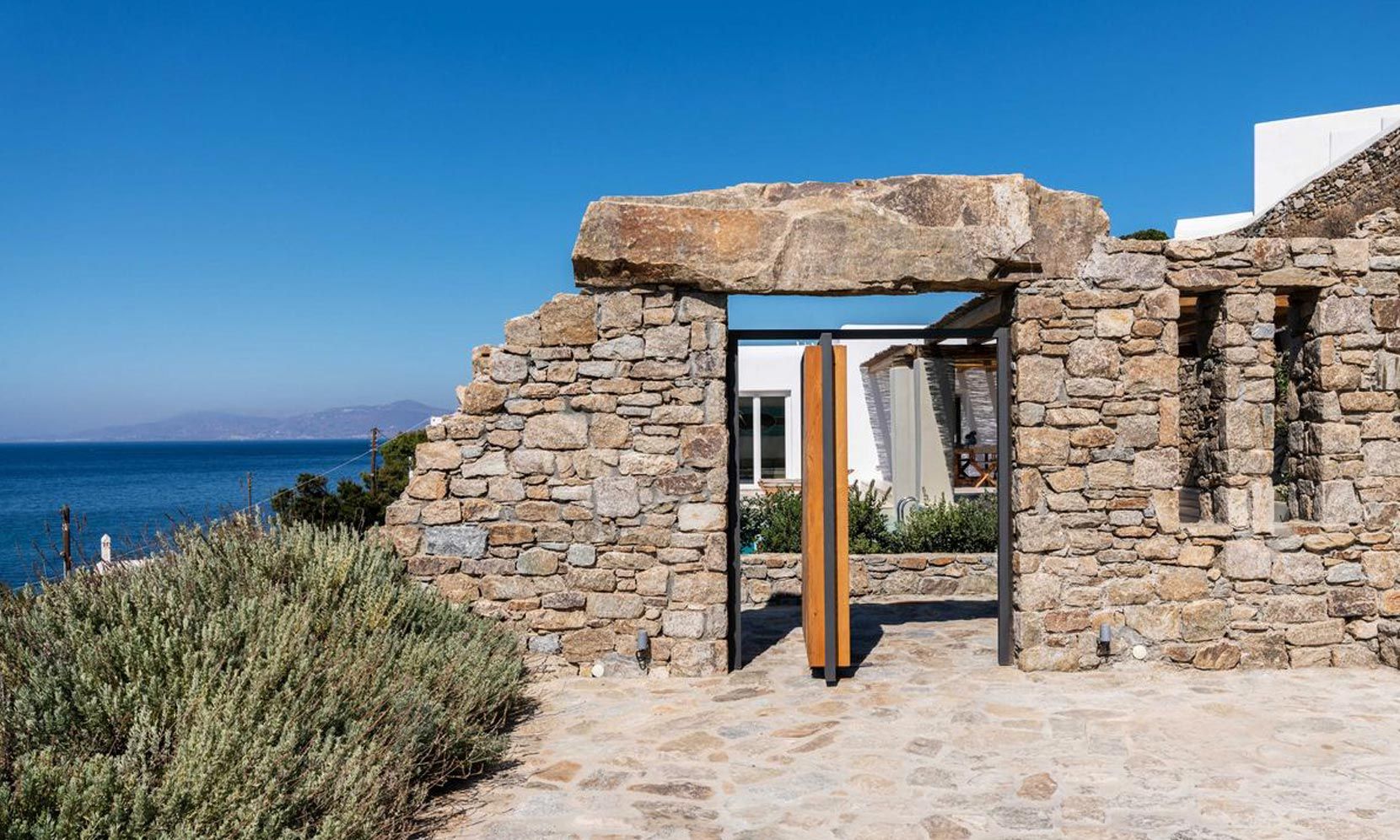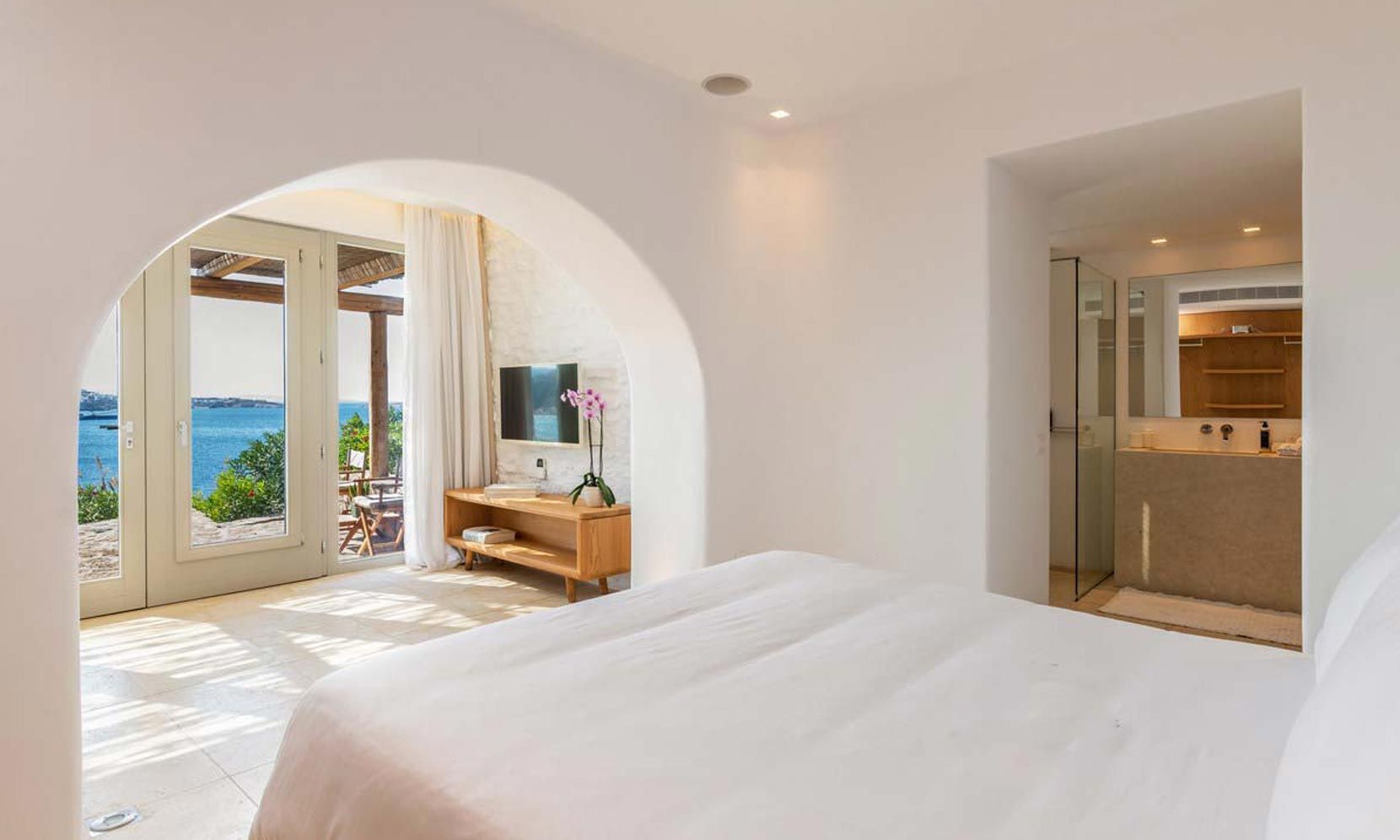 Villa Magnolia One has exceptional panoramic sea views of Megali Ammos Bay, in the south of Mykonos offering unpassed sunset views, while Mykonos Town and the iconic Windmills are within walking distance. The villa is easily accessed by the main road behind a secure parking gate. It is dressed by traditional walled gardens with olive trees. The traditional building structures utilize agrarian stone architecture, aligning with silky smooth white walls.