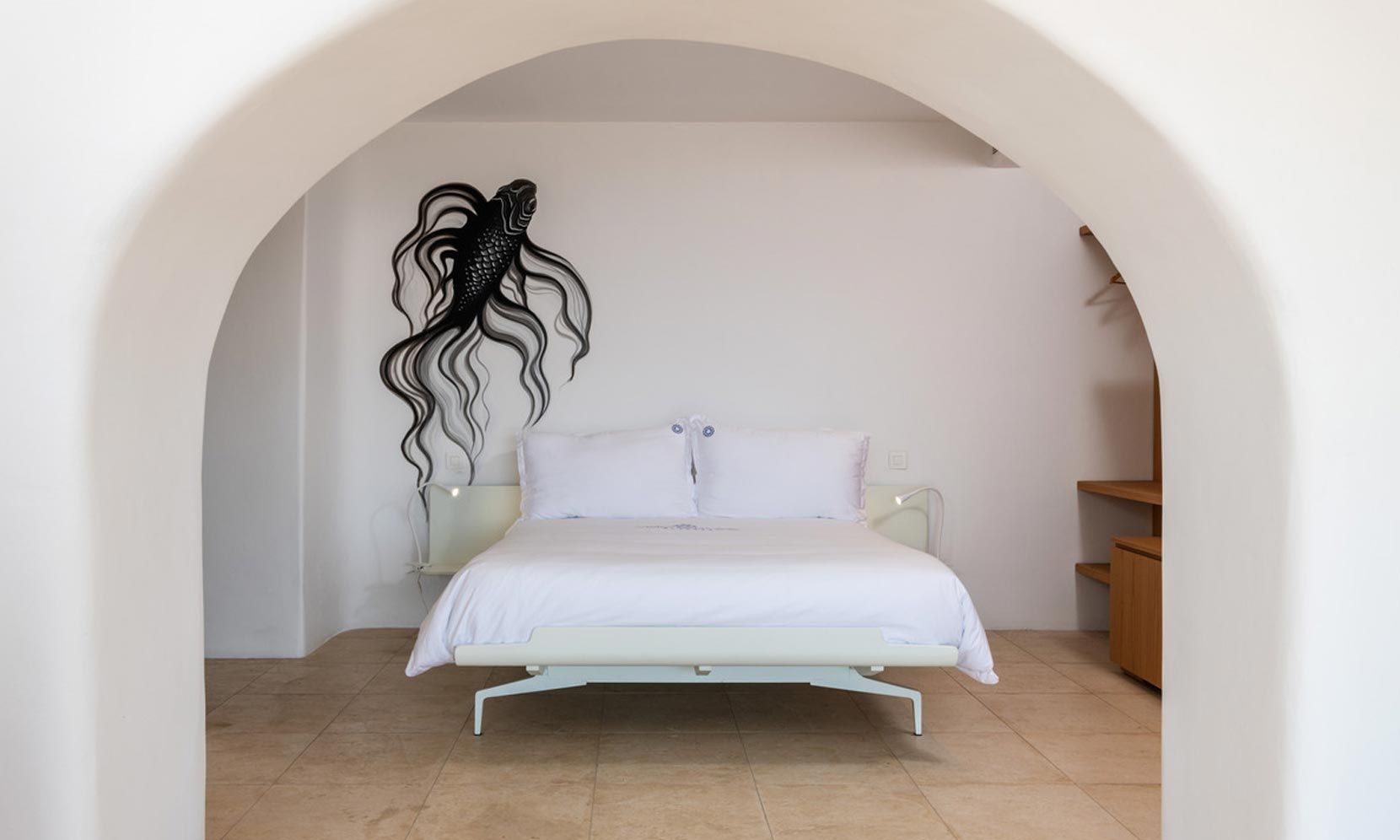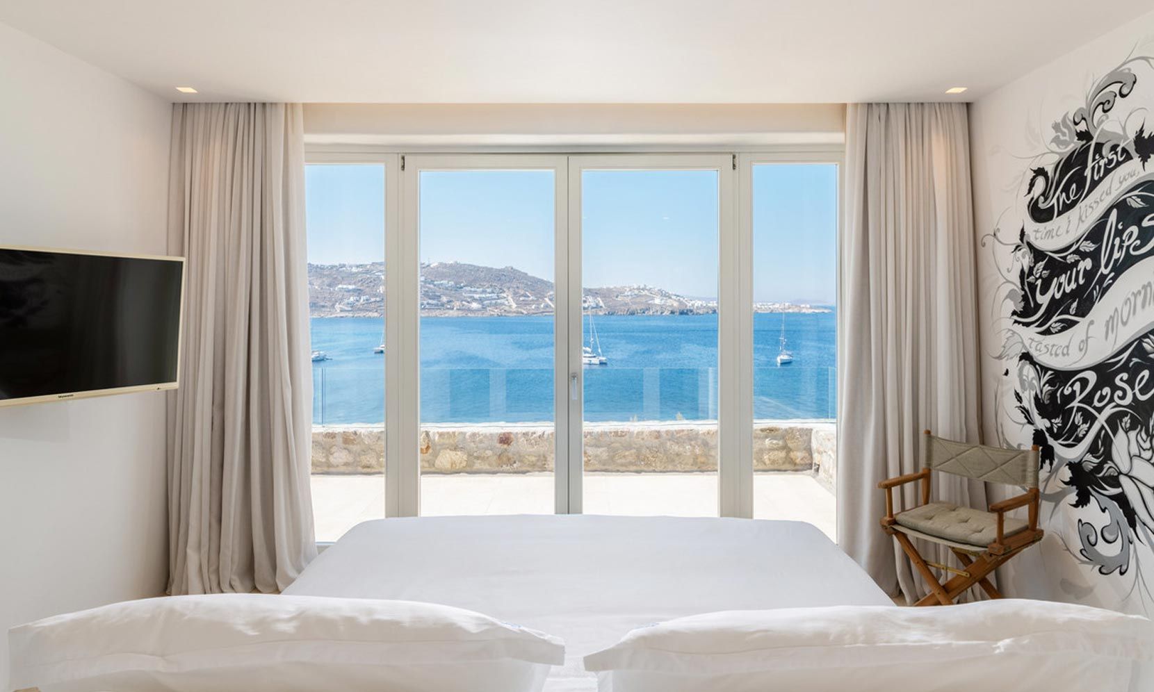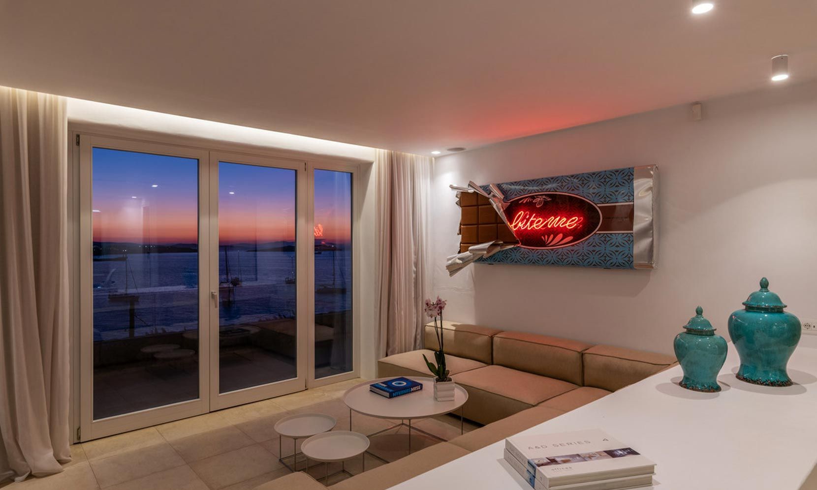 Villa Magnolia One has exceptional panoramic sea views of Megali Ammos Bay, in the south of Mykonos offering unpassed sunset views, while Mykonos Town and the iconic Windmills are within walking distance. The villa is easily accessed by the main road behind a secure parking gate. It is dressed by traditional walled gardens with olive trees. The traditional building structures utilize agrarian stone architecture, aligning with silky smooth white walls.