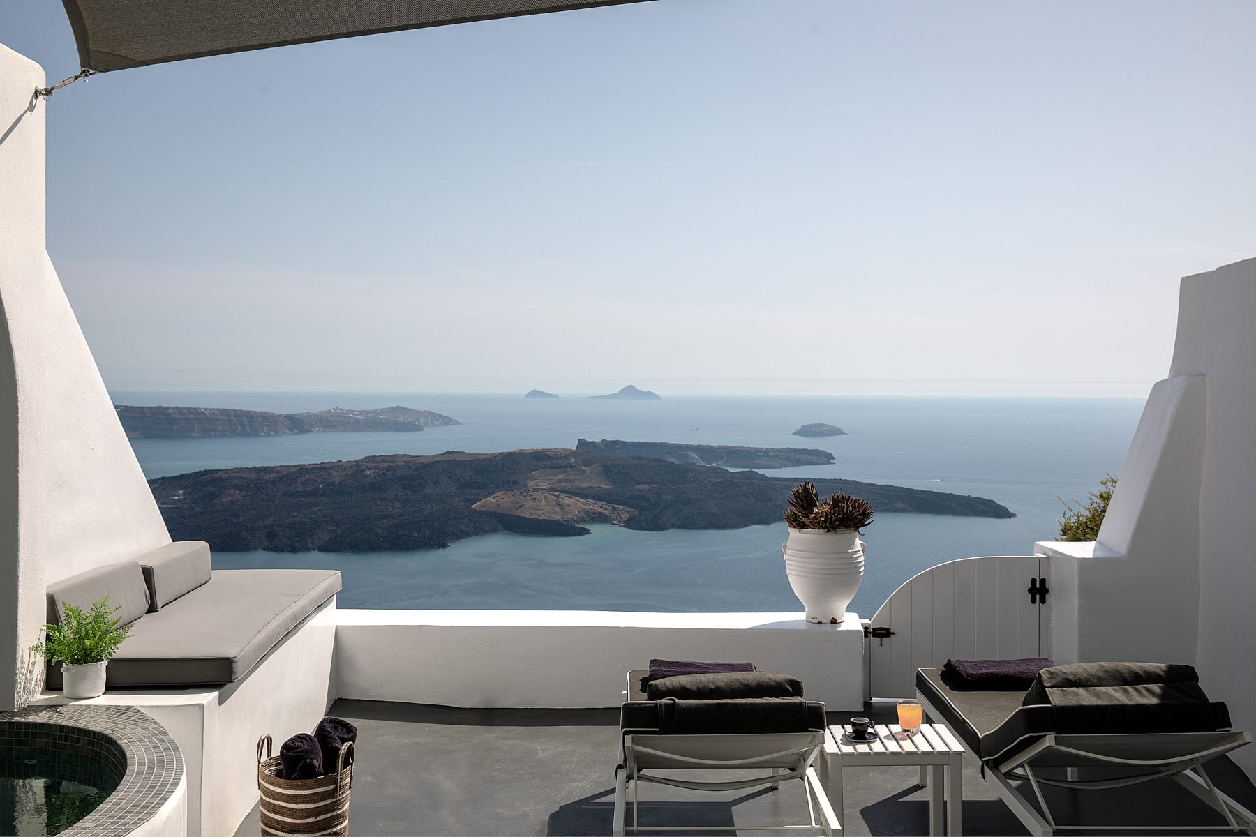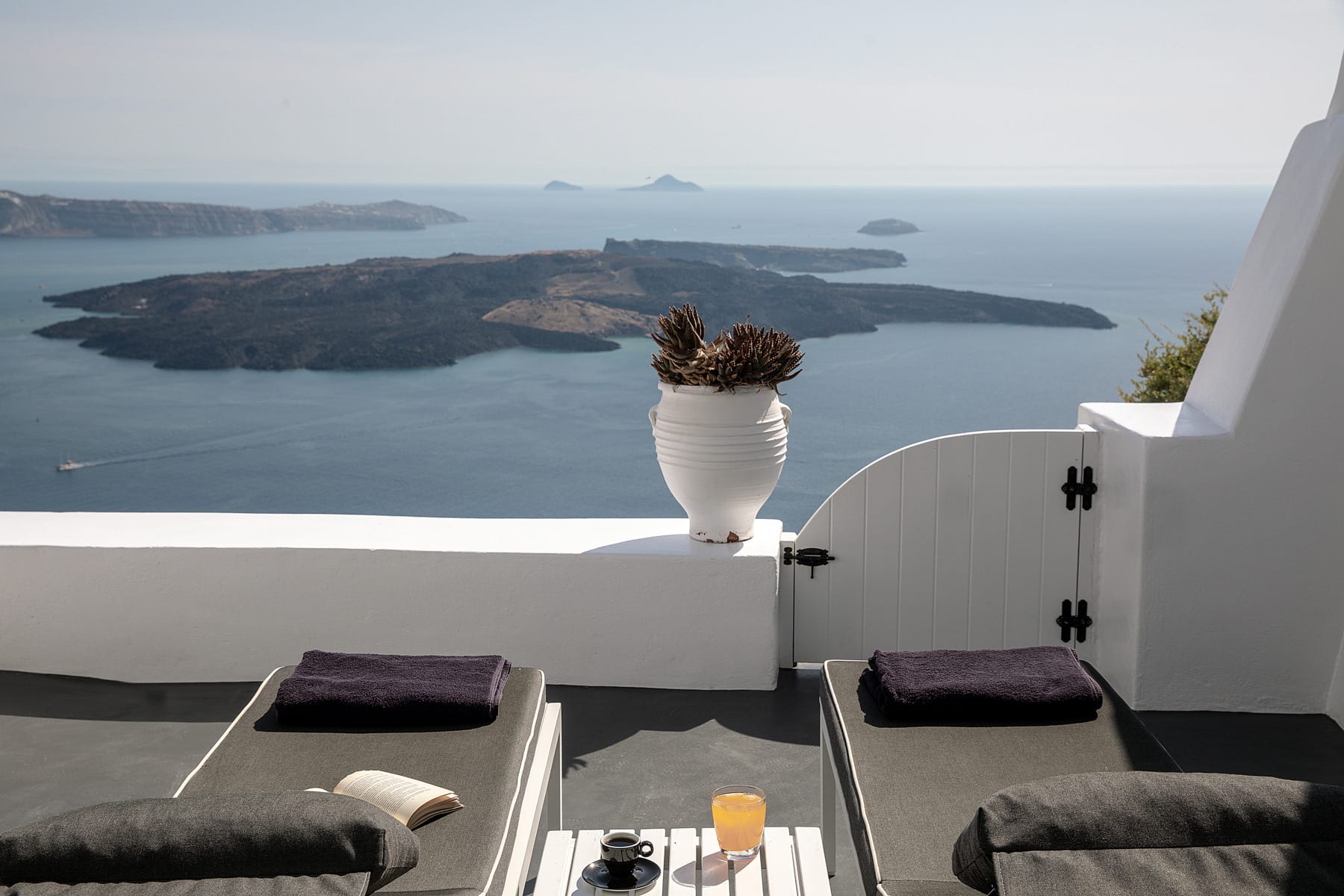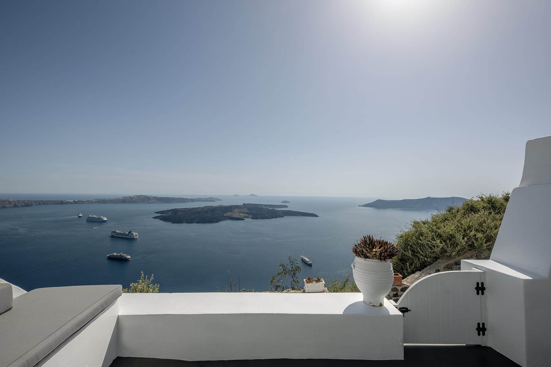 The patio wraps around the rear of the villa leading to a stairway directly down to the pedestrian gate to town. All of the patio areas have a full view of Megali Ammos and Canalia in the distance.
