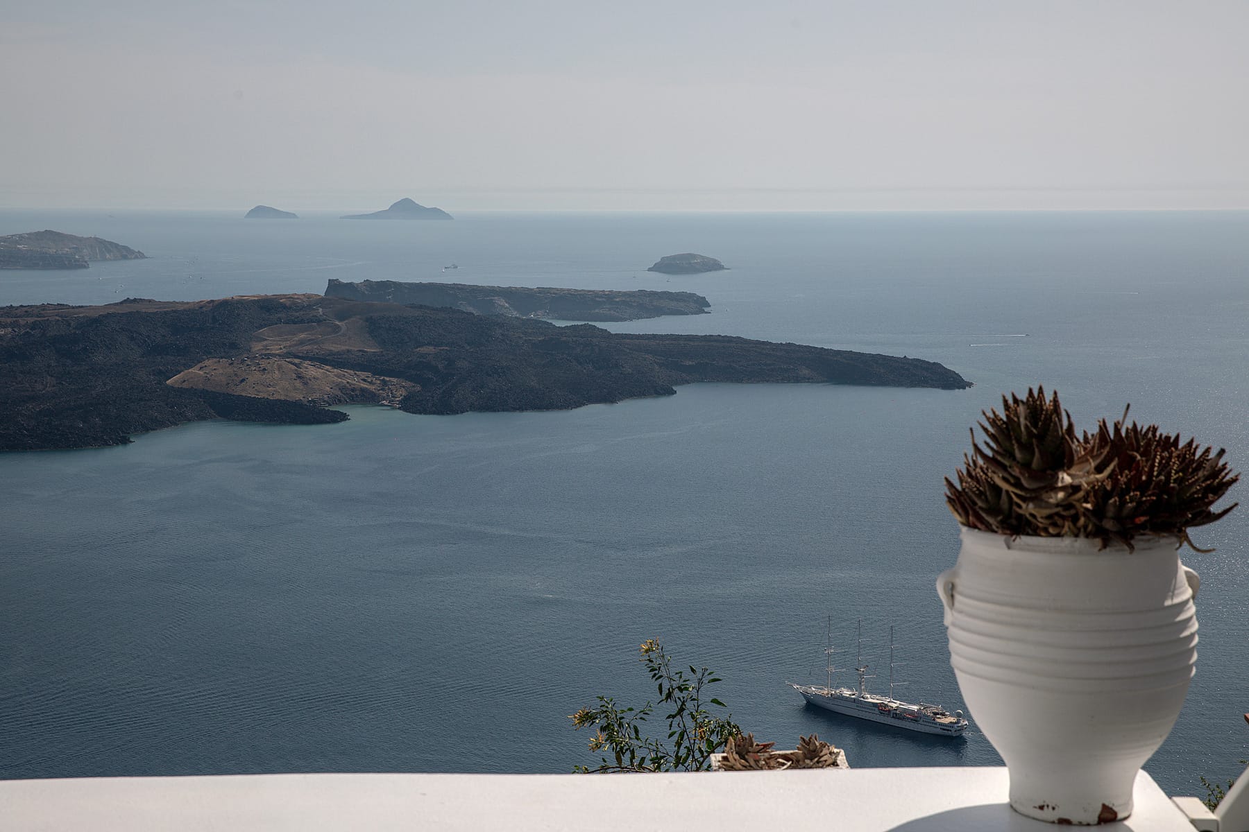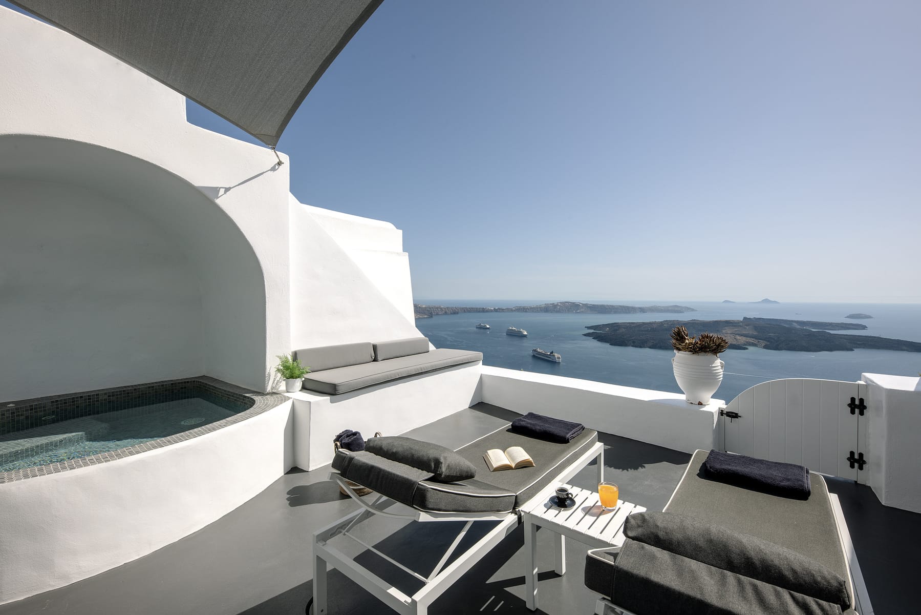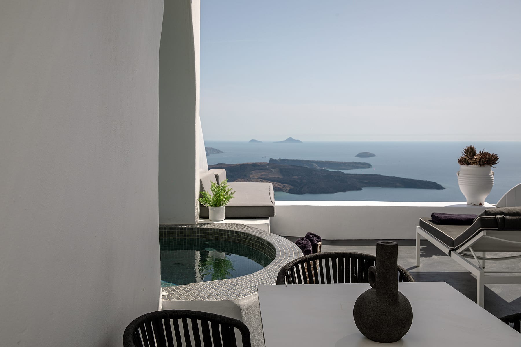 The patio wraps around the rear of the villa leading to a stairway directly down to the pedestrian gate to town. All of the patio areas have a full view of Megali Ammos and Canalia in the distance.
