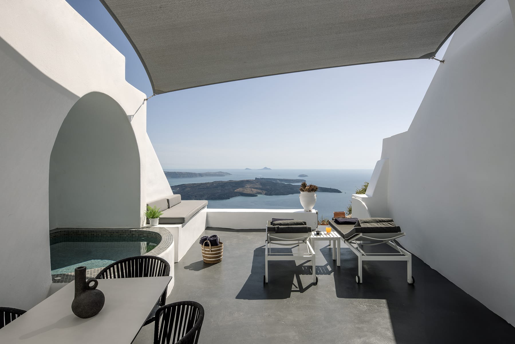 The lower level is comprised of 2 separate suites with salons and patios. The main level patio area encompasses a large built in seating area that is shaded by a pergola, sun loungers and an infinity pool.