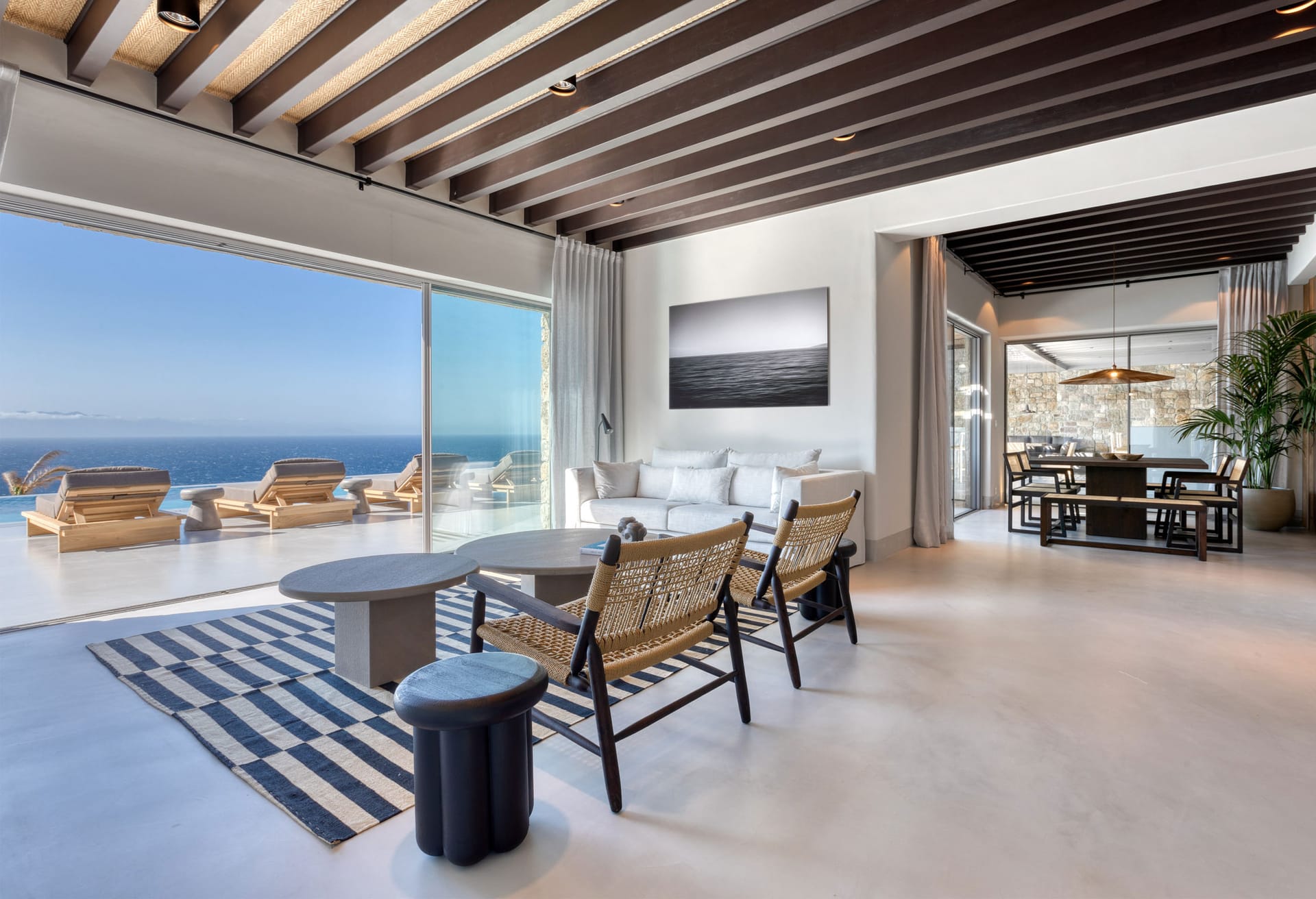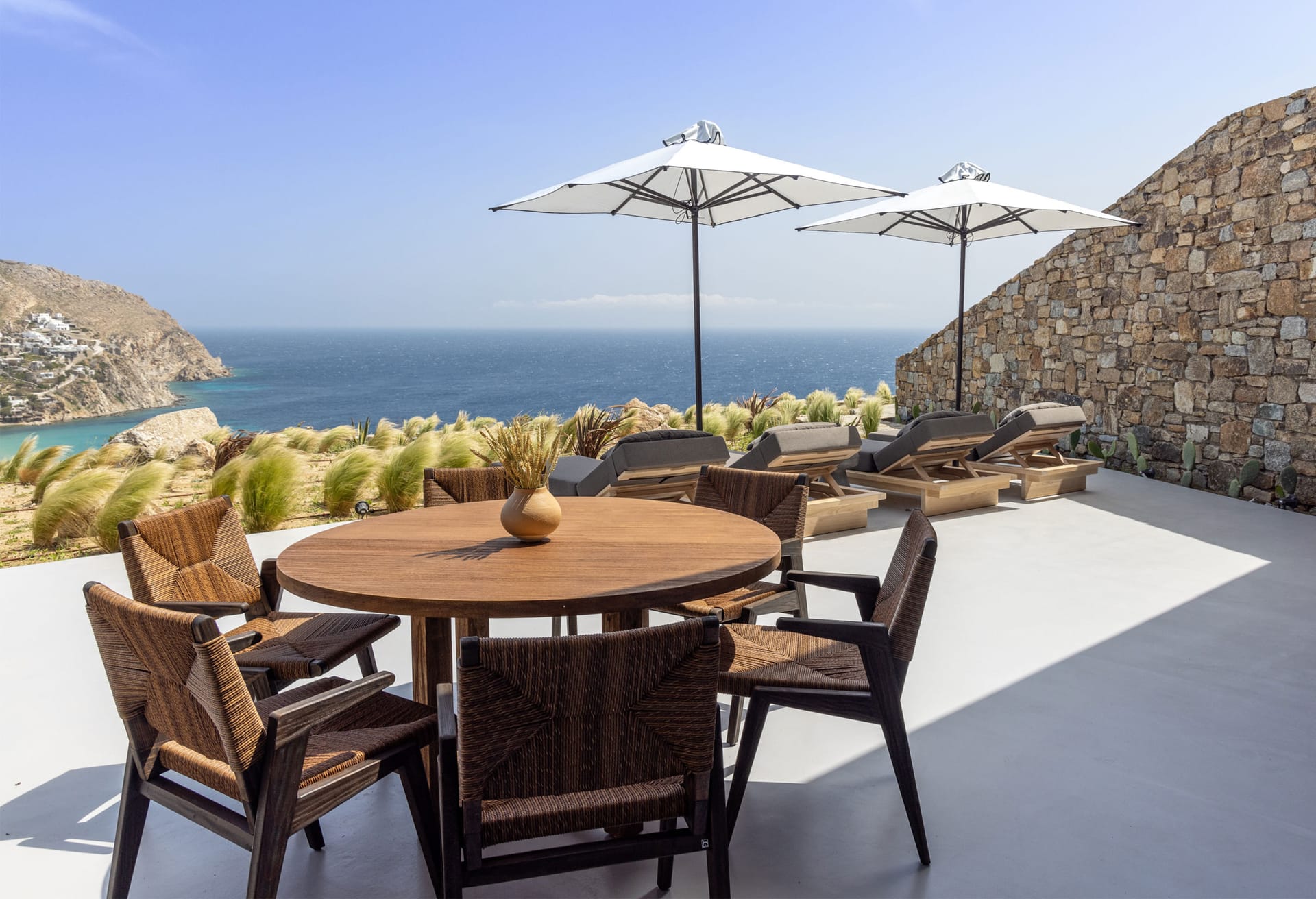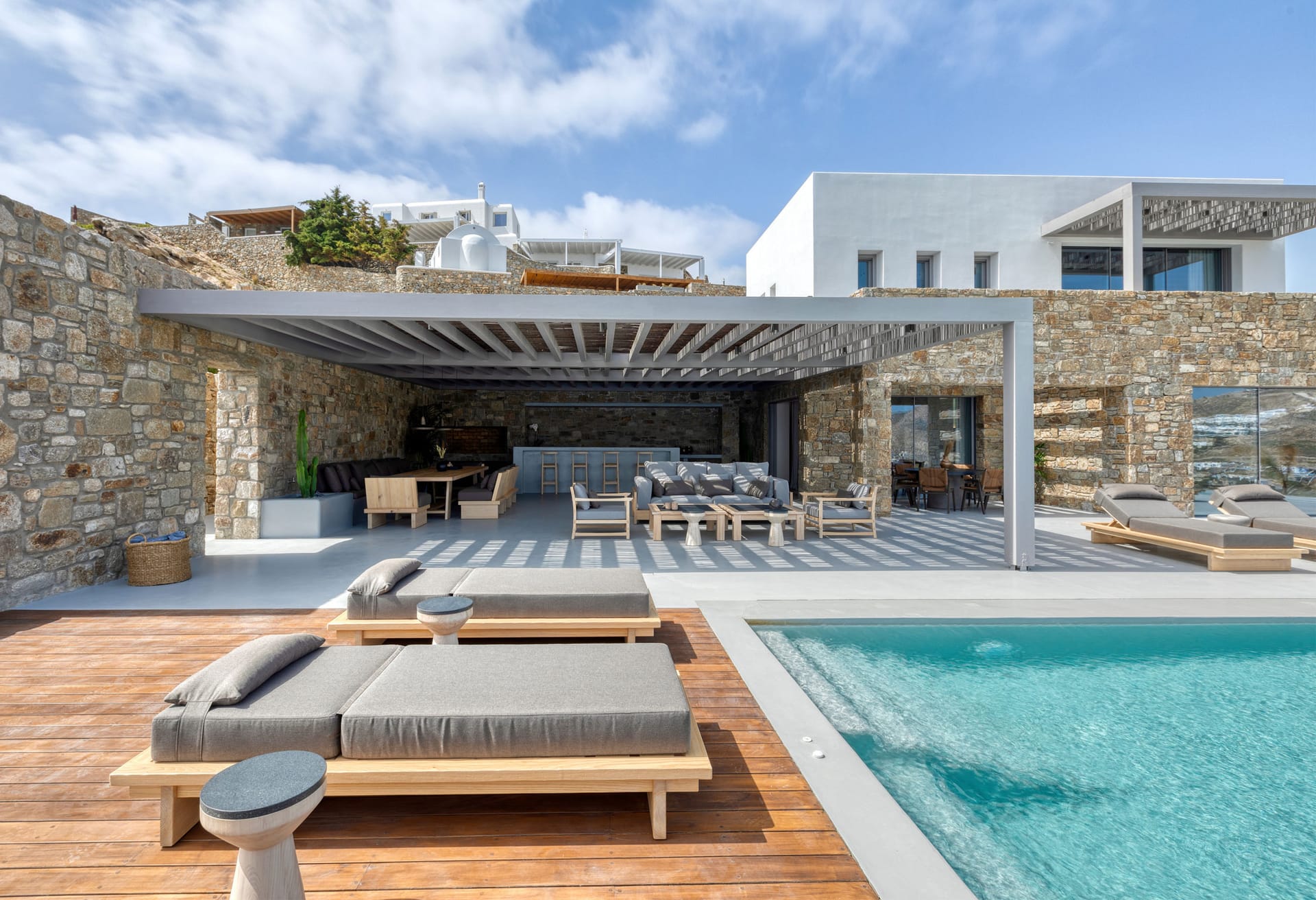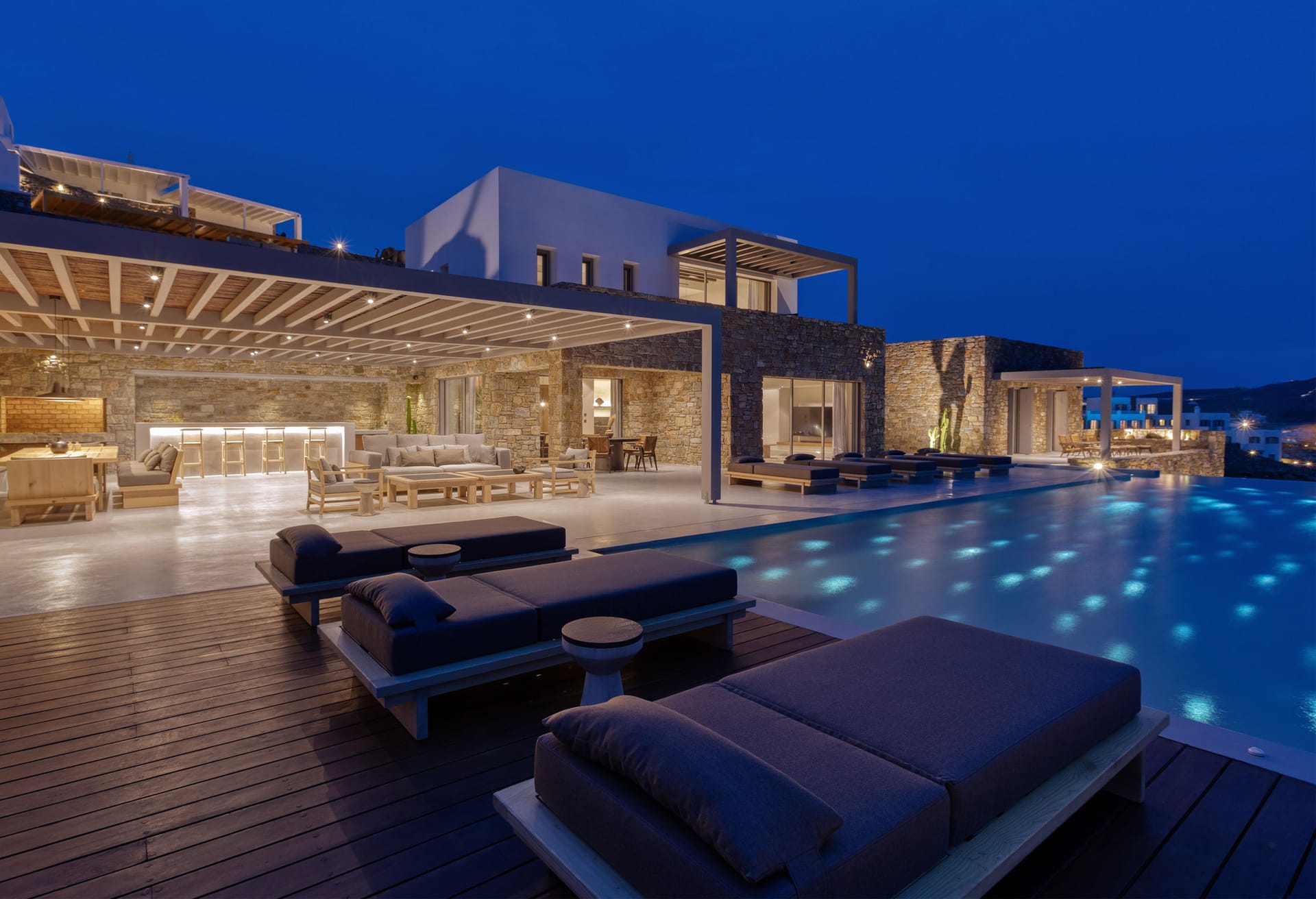 Unravel the tangle of Ariadne, discovering one by one all the interesting, elegant, and tastefully made corners of this modern, luxurious, and brand new Mykonian house. A high-level team in the field of luxury home architecture supervised the creation of a unique holiday home that satisfies the tastes of its visitors with its modern construction, high-quality materials, and functionality.