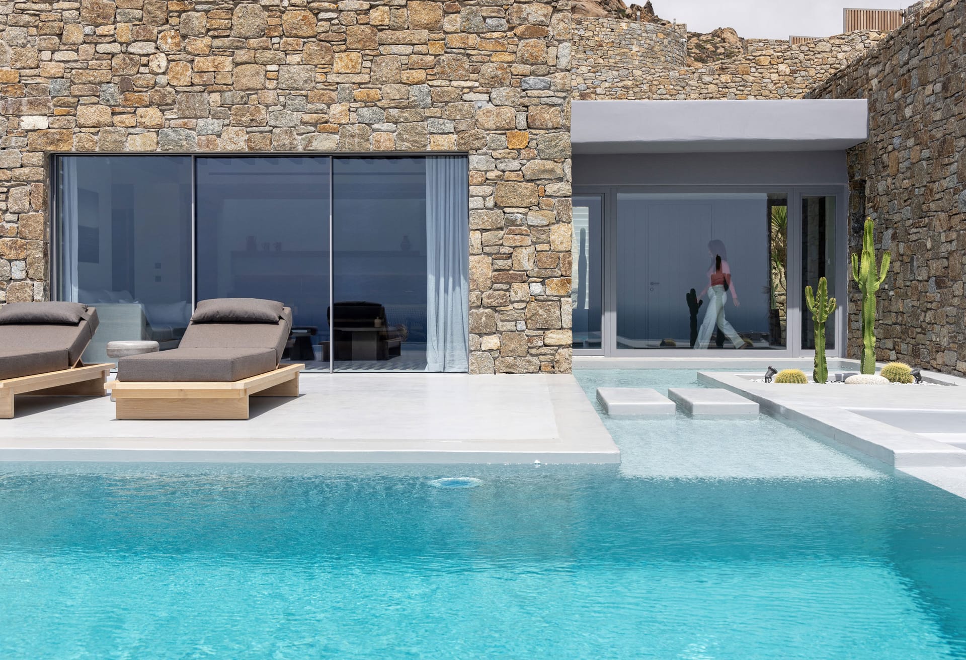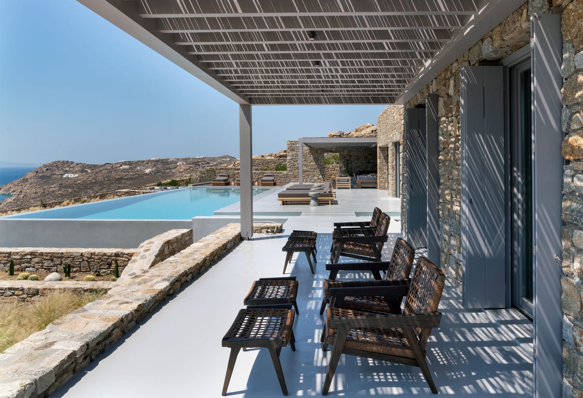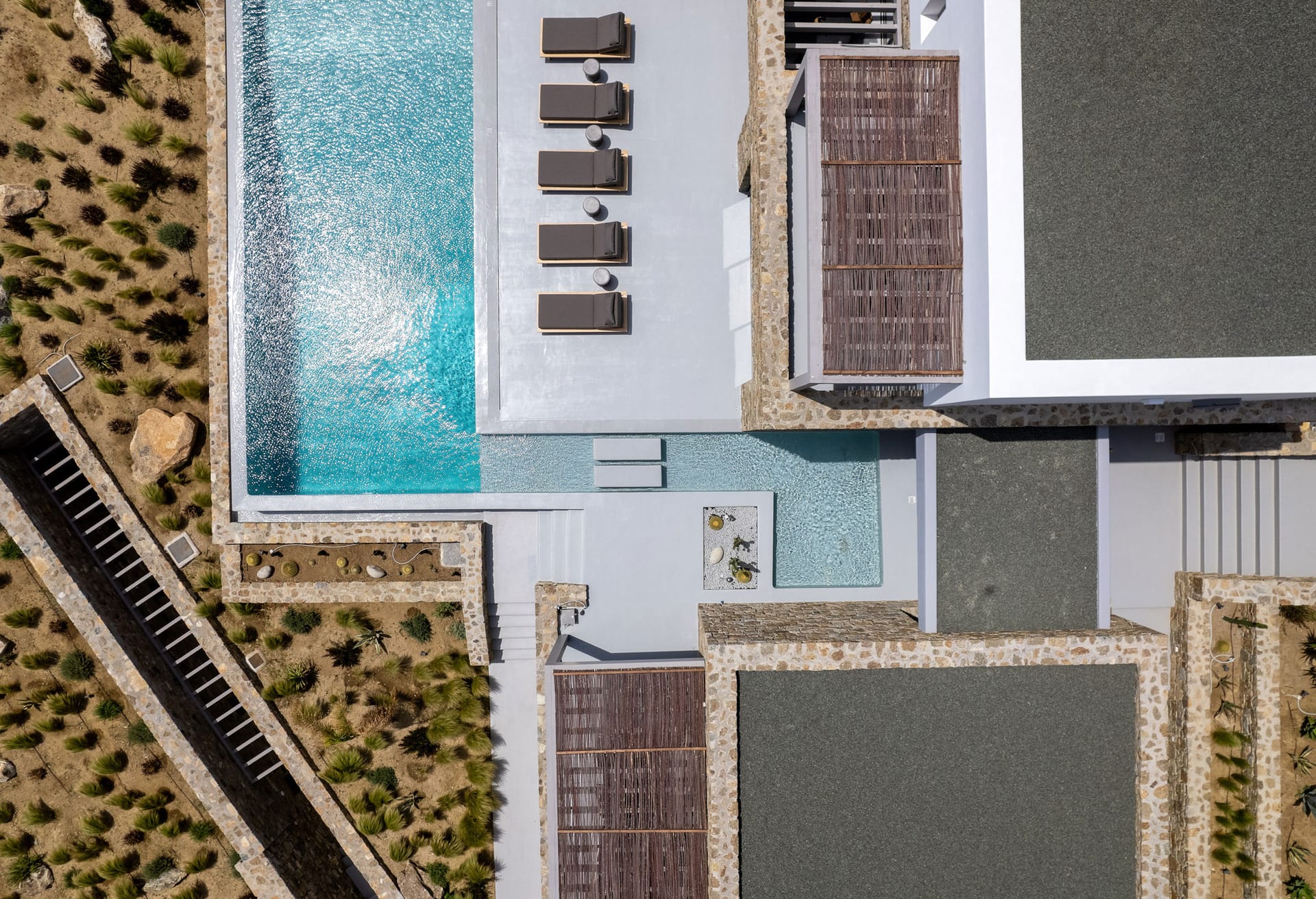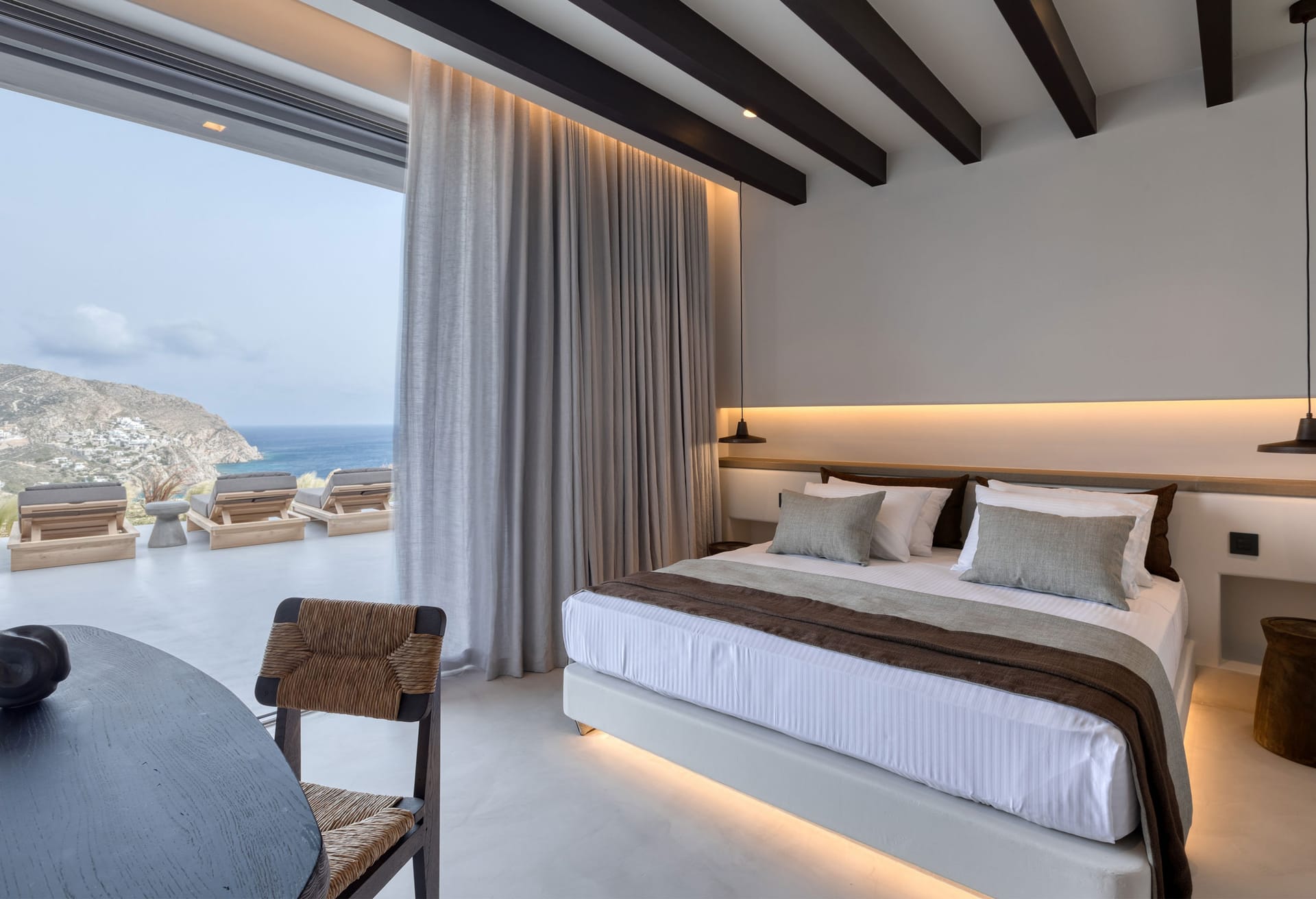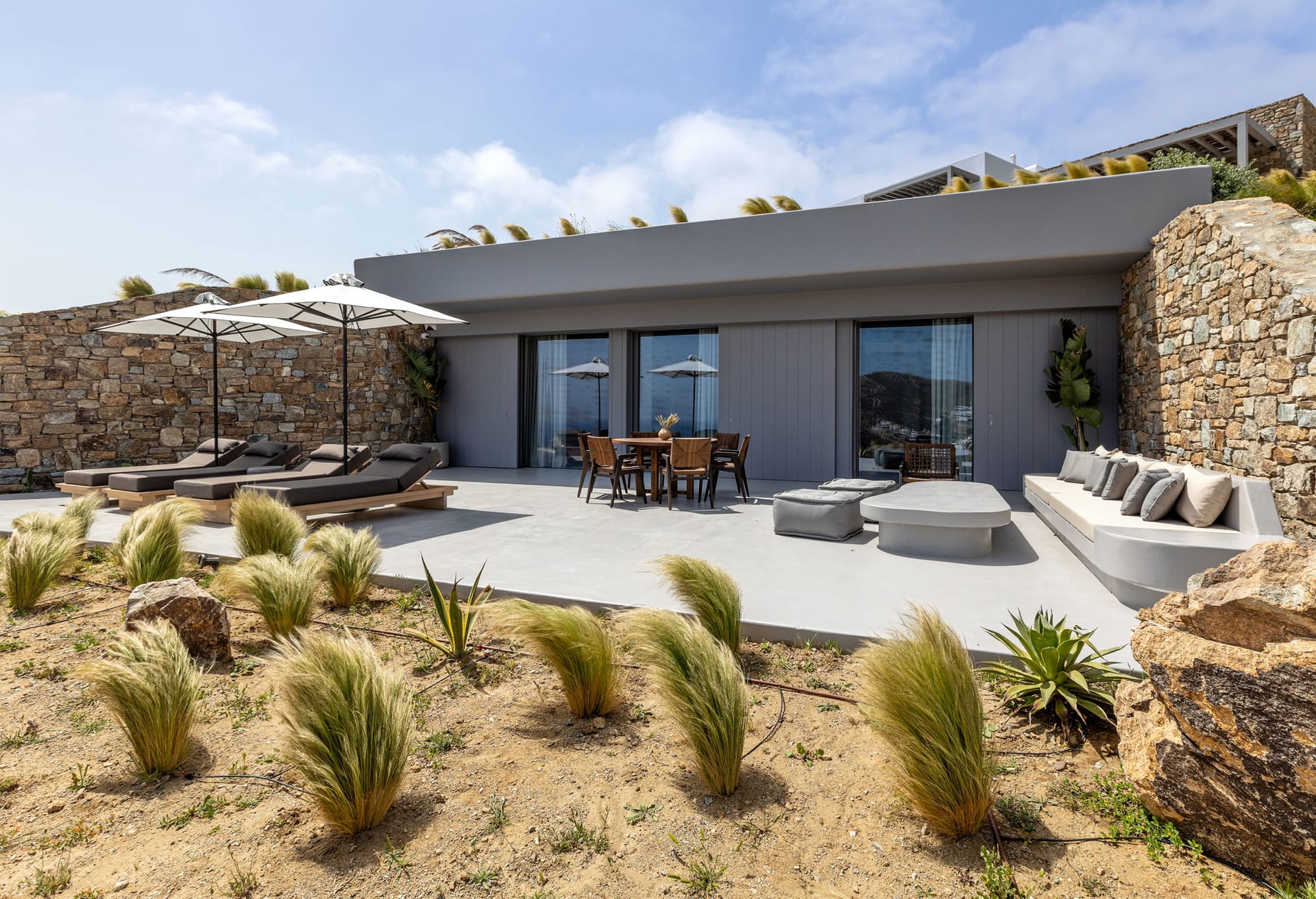 Unravel the tangle of Ariadne, discovering one by one all the interesting, elegant, and tastefully made corners of this modern, luxurious, and brand new Mykonian house. A high-level team in the field of luxury home architecture supervised the creation of a unique holiday home that satisfies the tastes of its visitors with its modern construction, high-quality materials, and functionality.