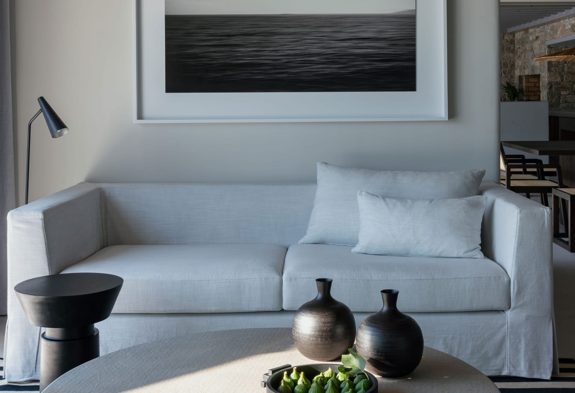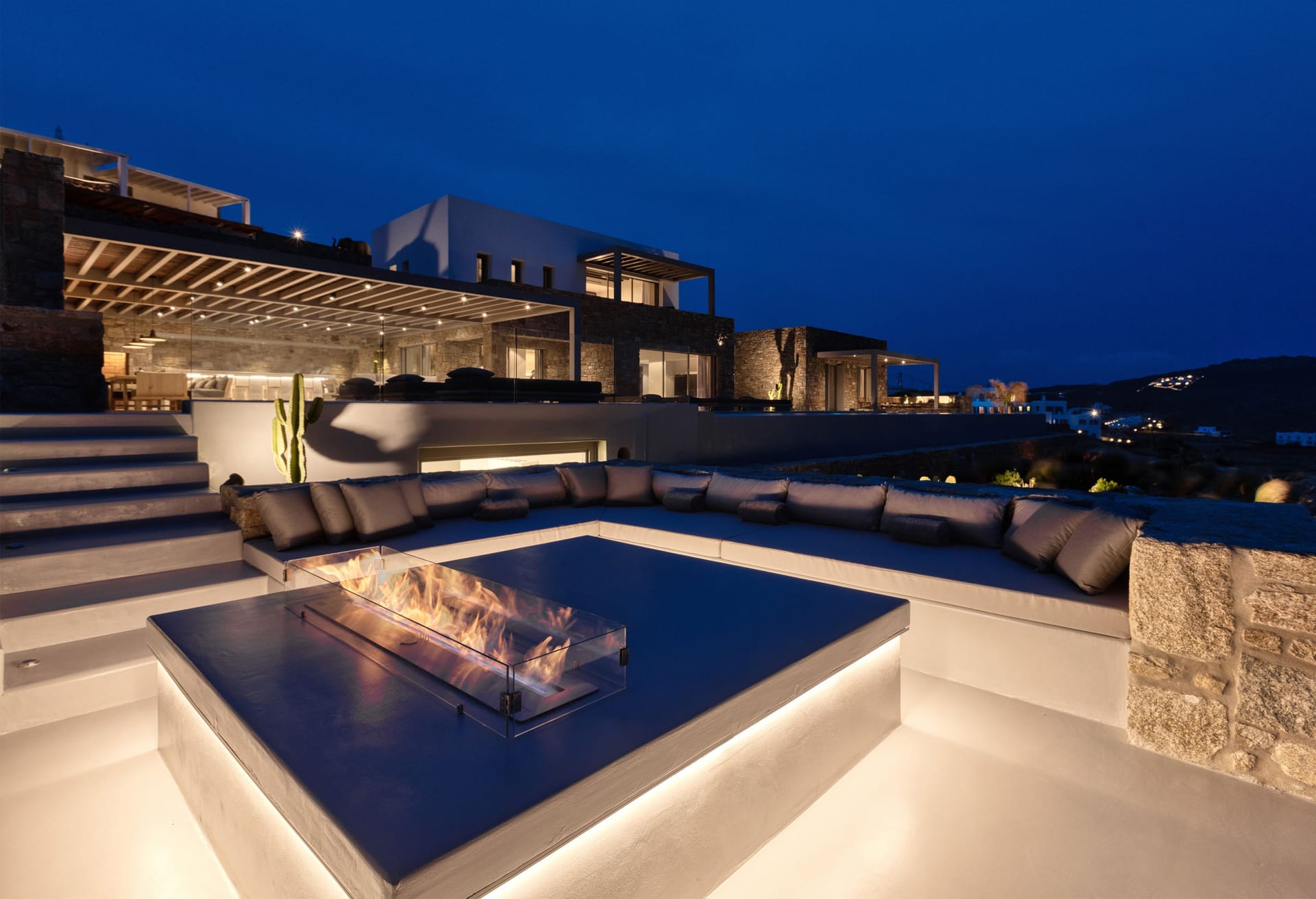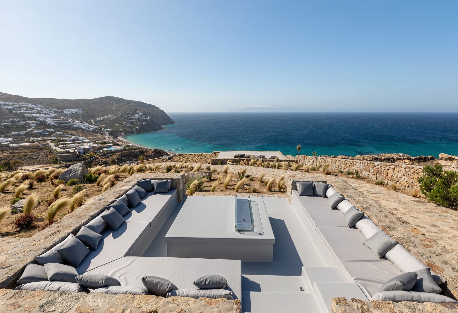 As the sun shines you can sunbathe and enjoy the incomparable view at the outdoor living room by the pool. Watch the sun meeting the sea while you enjoy your drinks around the open fireplace.
