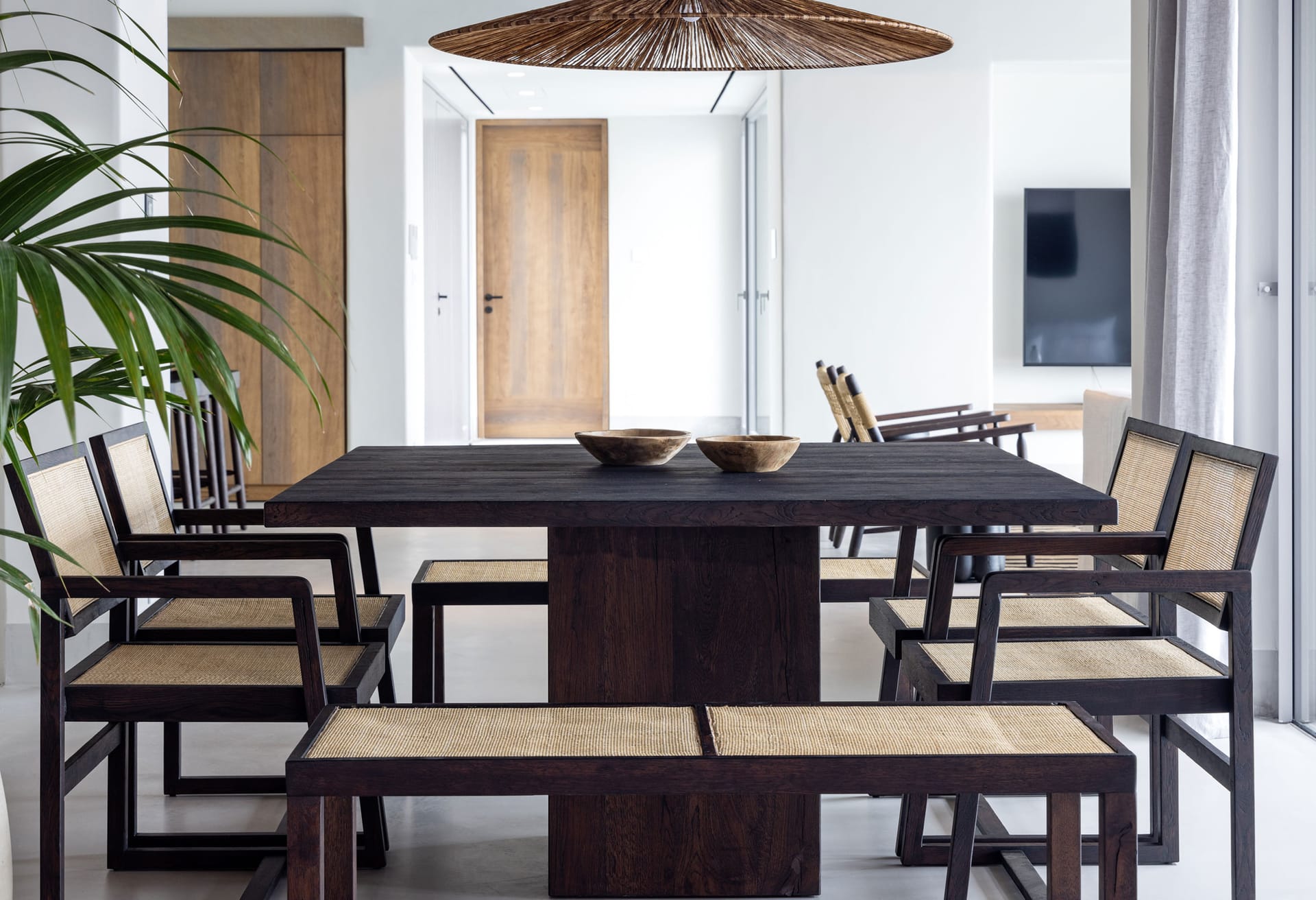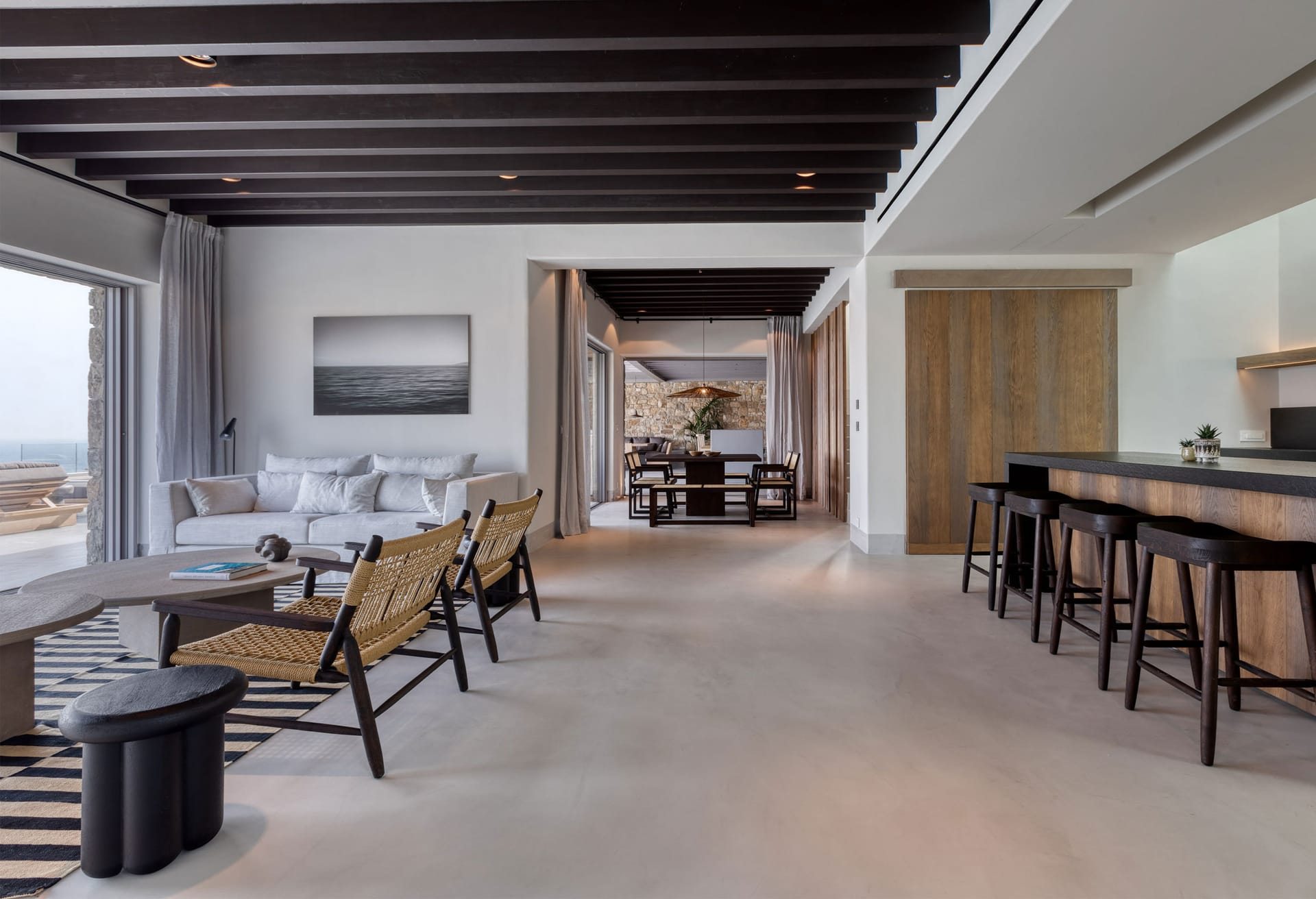 Open plan fully equipped kitchen with kitchen island and high chairs, spacious living room with TV, and amazing pool and see view, guest WC, indoor dining area [6 seats] – access to the outdoor kitchen-bar with BBQ and outdoor dining area