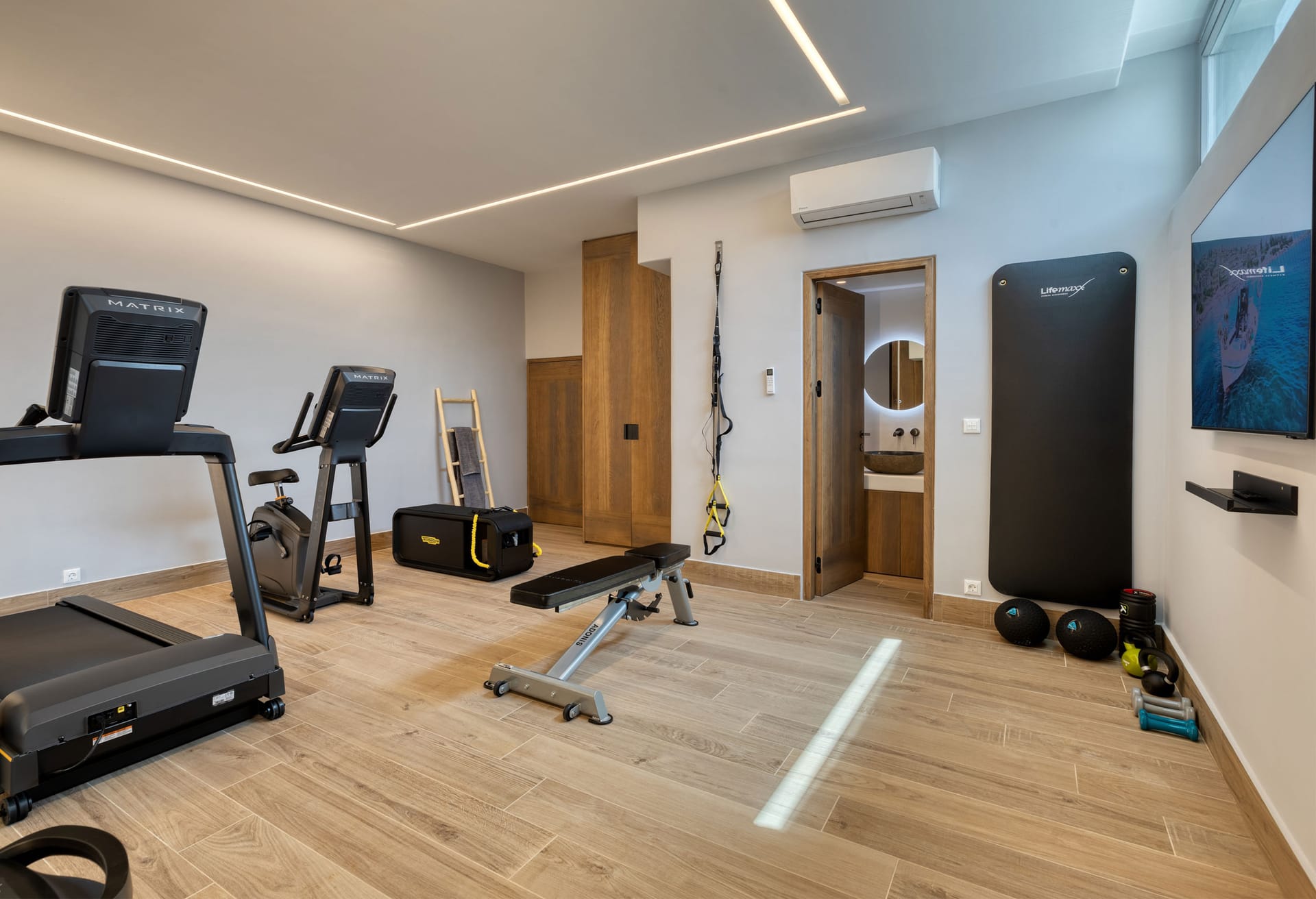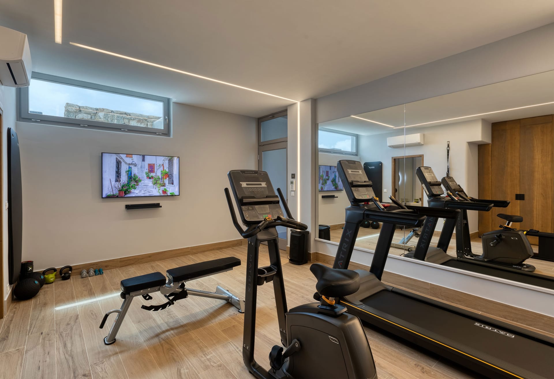 Independent fully equipped gym with Matrix instruments, WC and shower, and large TV | individual entrance