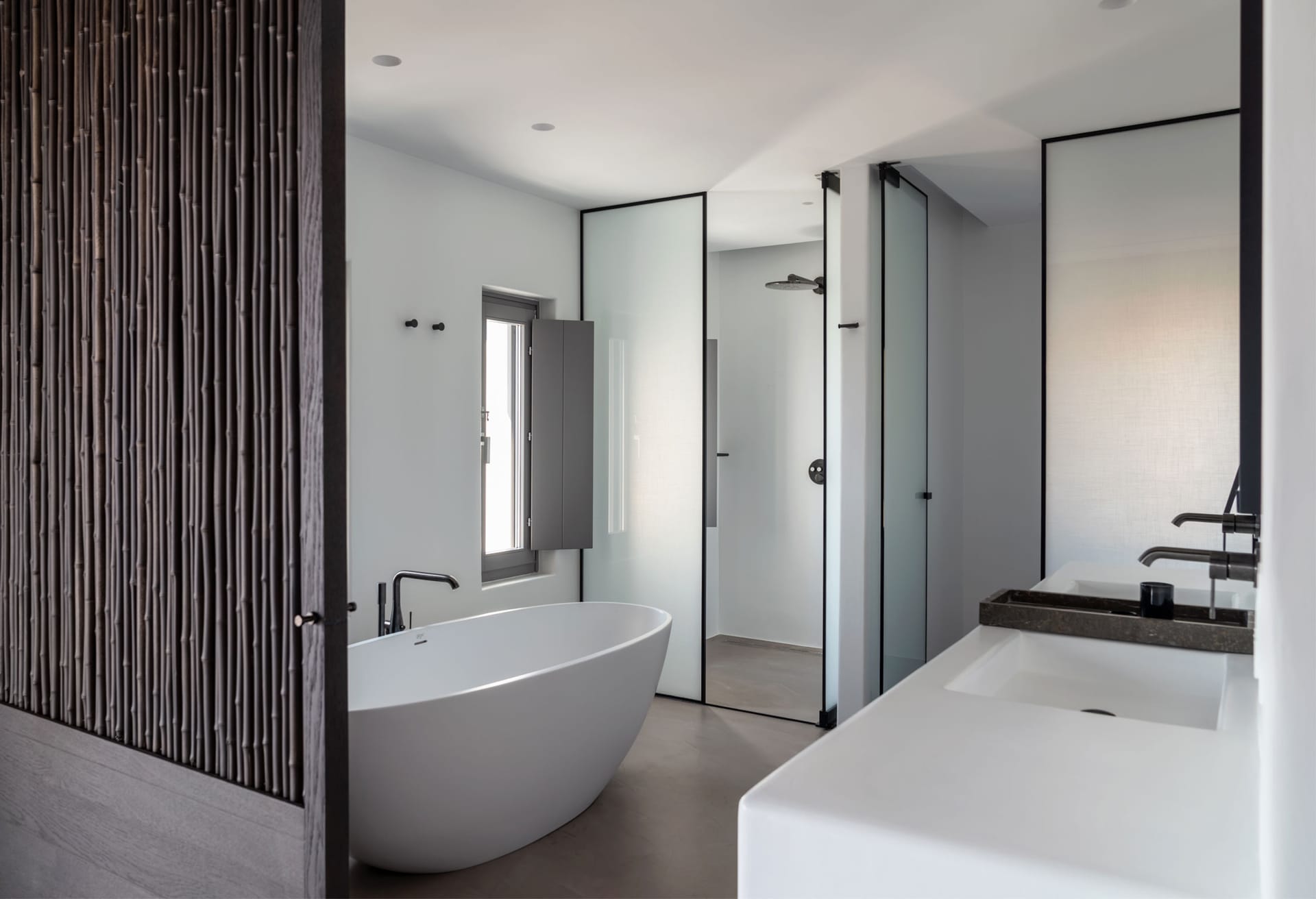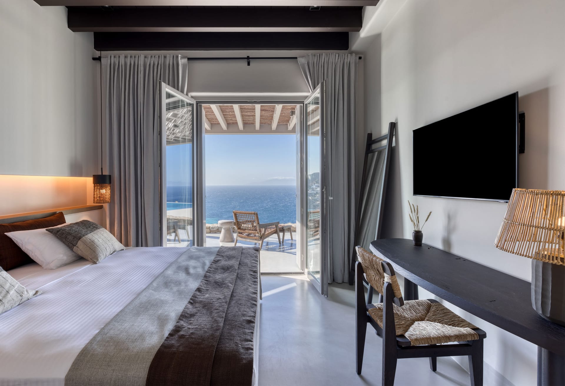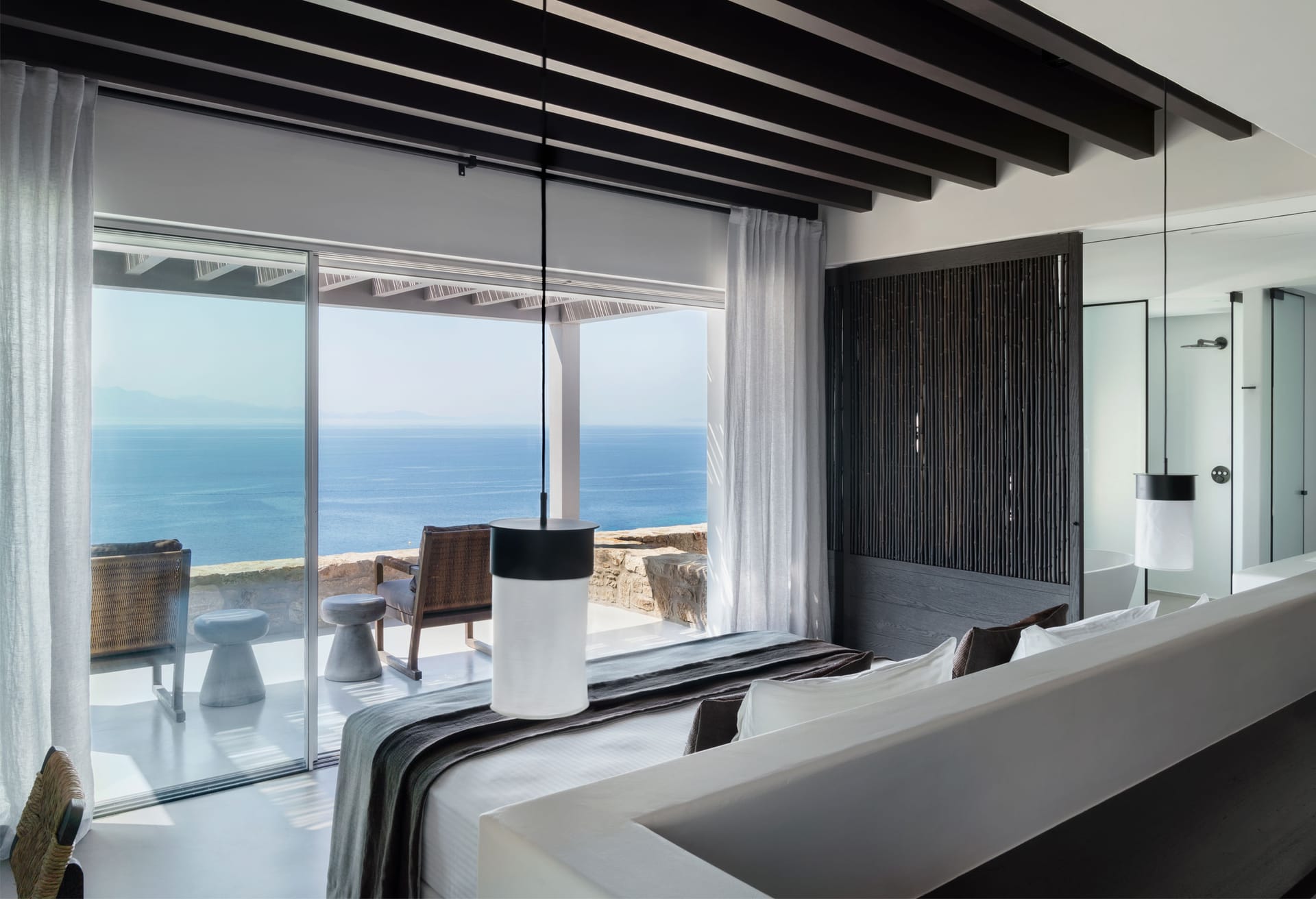 Suite 3: master bedroom with queen-size bed, TV, open plan en-suite bathroom with a bathtub -with direct sea view via a window-, direct access to a private balcony, [panoramic sea view from the bed]