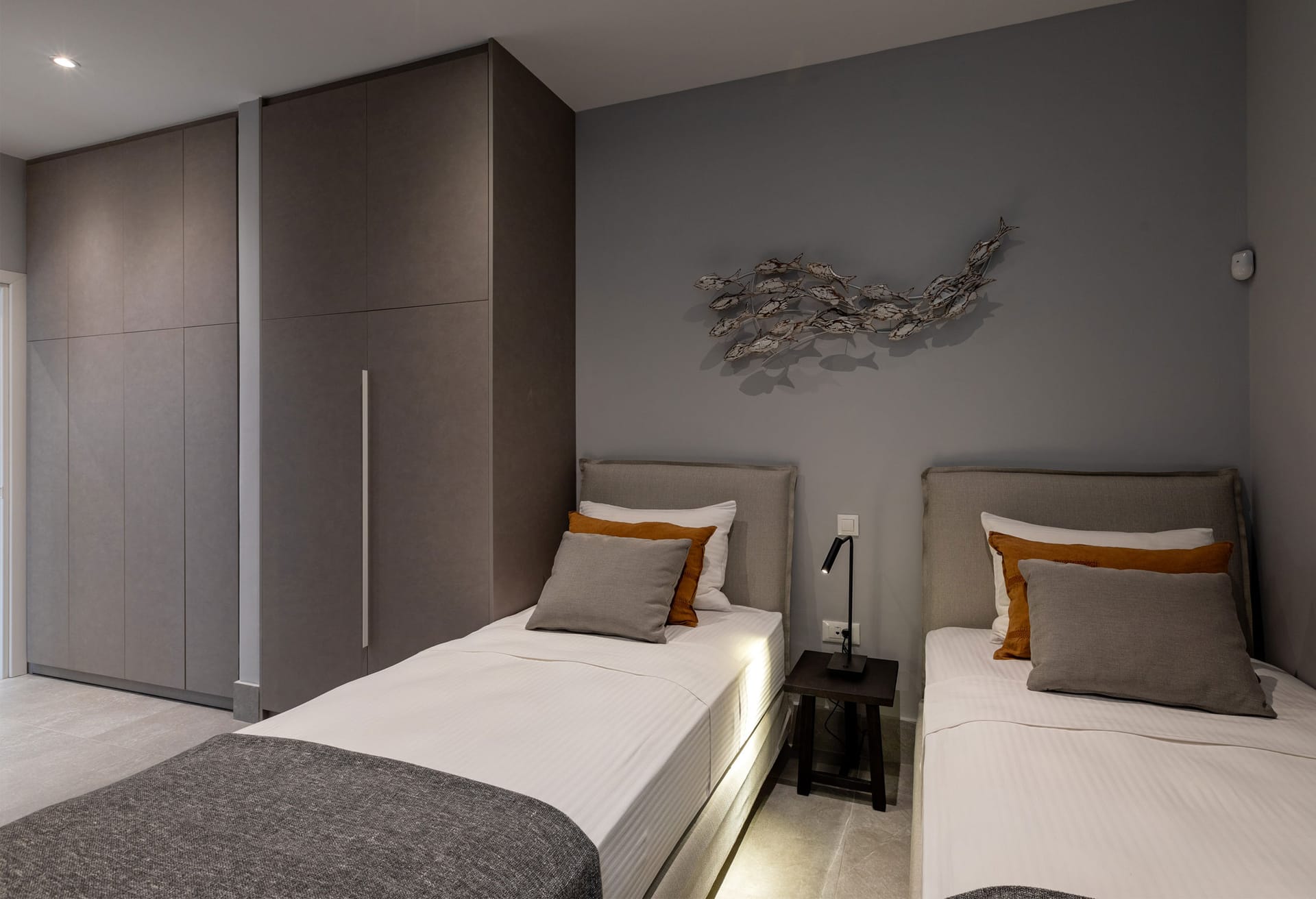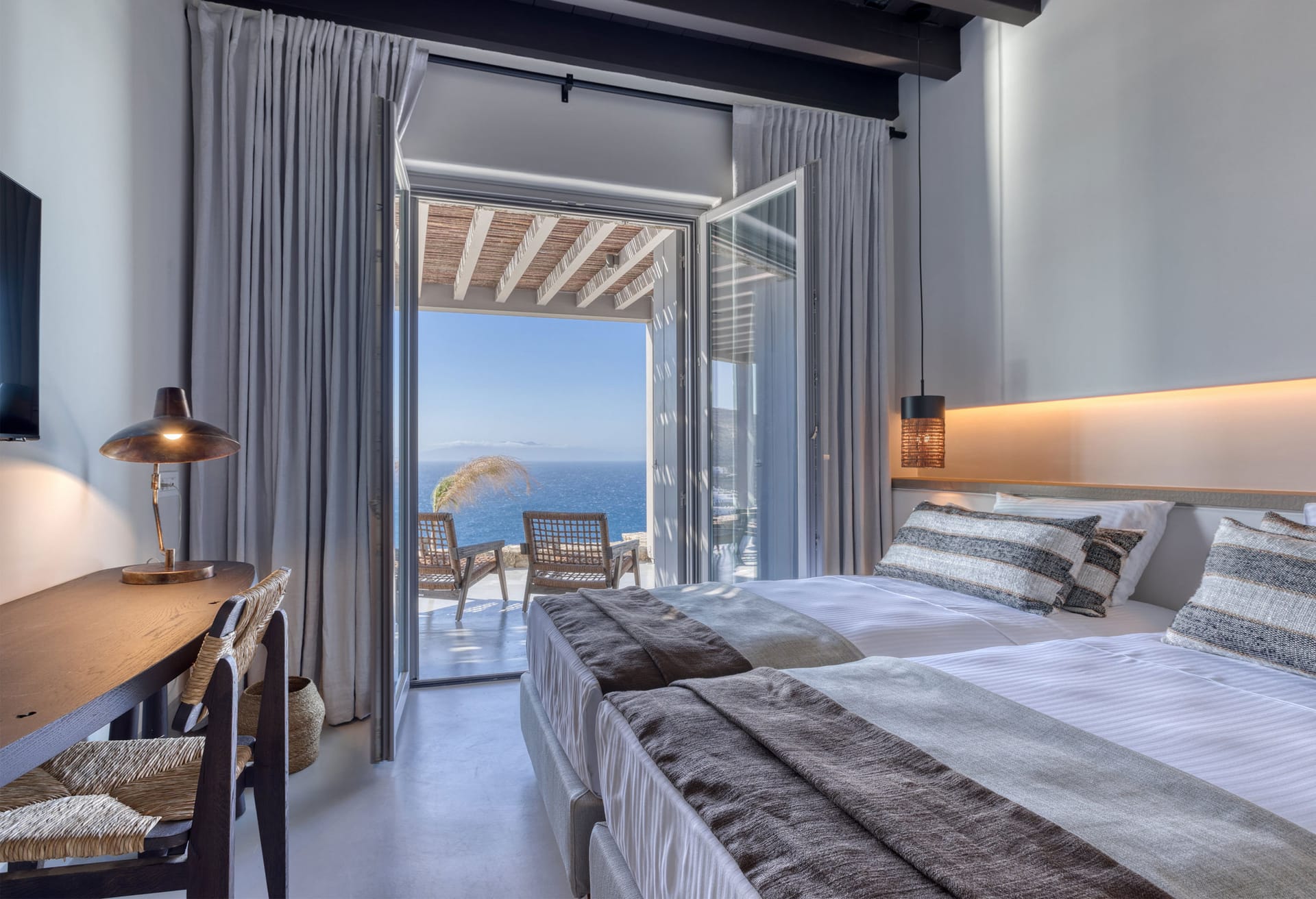 Suite 5: 2 twin beds [convertible to a queen-size bed], TV, en-suite bathroom with shower, direct access to a terrace via balcony doors | panoramic sea view room | the room has access through the indoor living room area + an individual door