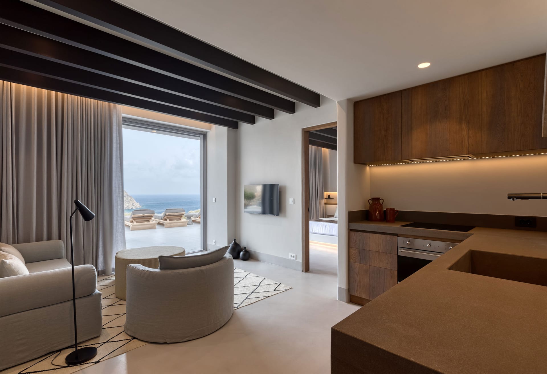 Independent Unit 2: open plan fully equipped kitchen, living room with panoramic sea-view and access to an outdoor built-in lounge area