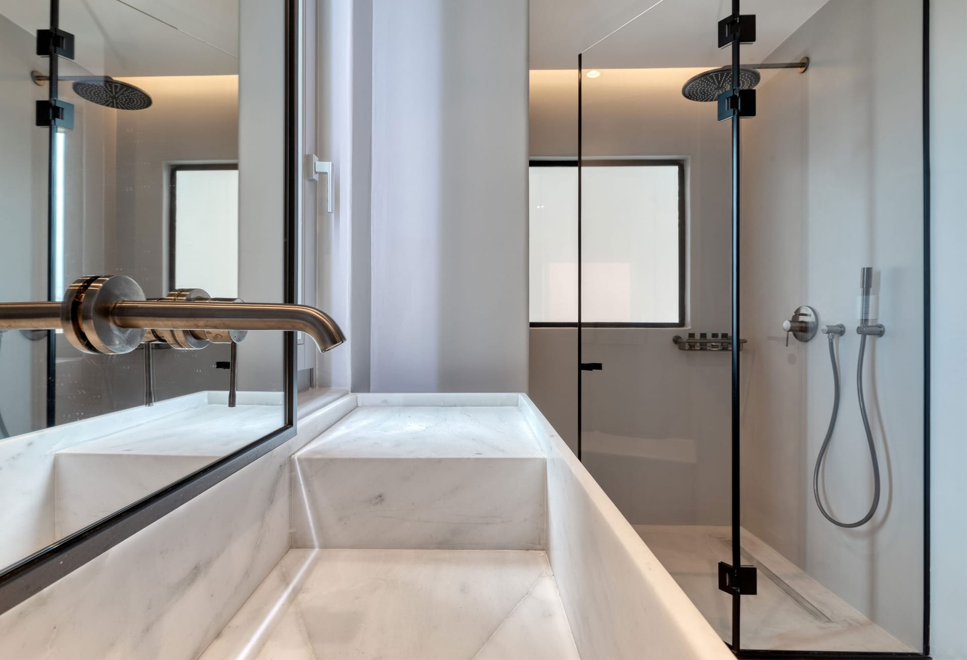 Suite 4: built-in queen-size bed, TV, en-suite bathroom with shower, access to an outdoor very well designed hot shower, direct access to a terrace via balcony doors | panoramic sea view room | the room has access through the indoor living room area + an individual door