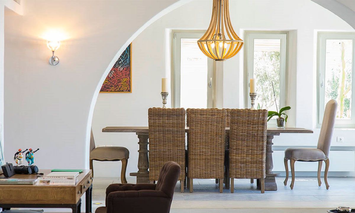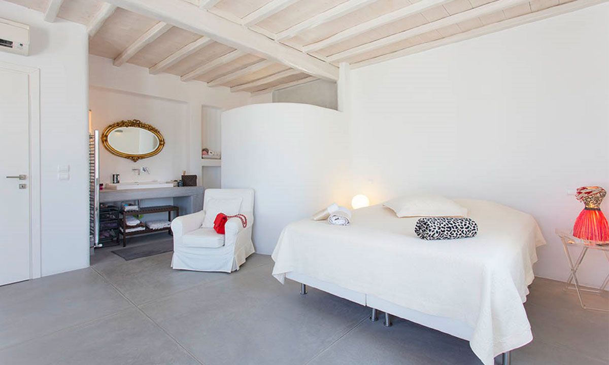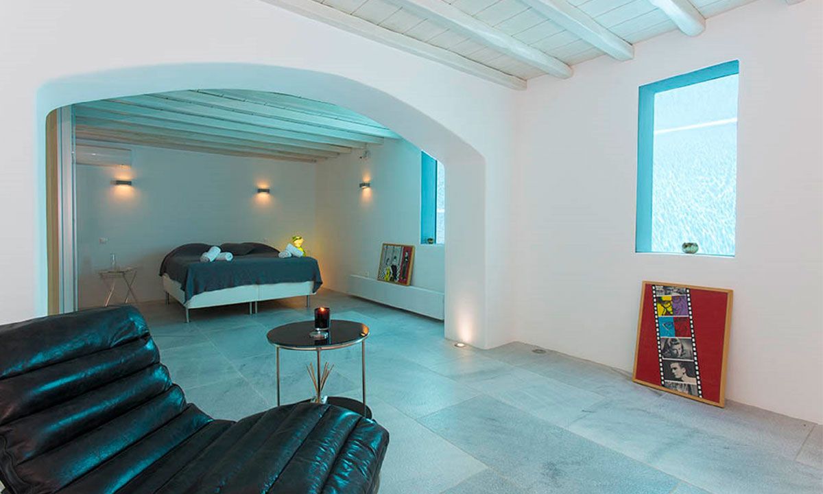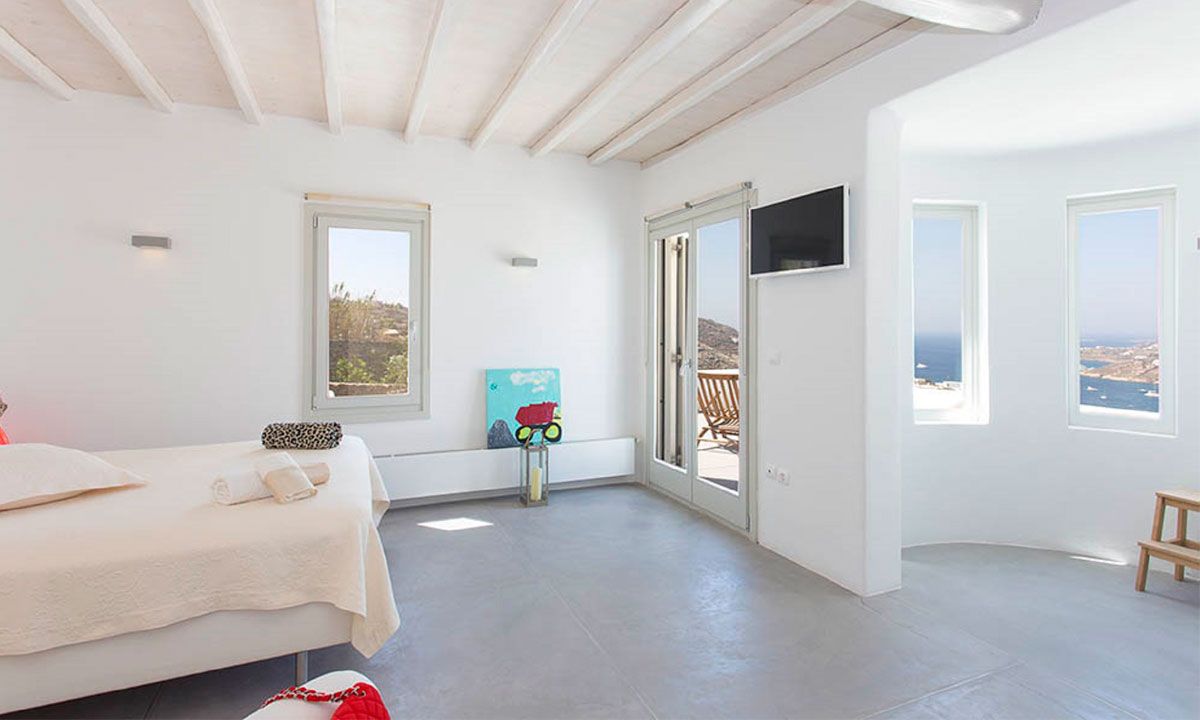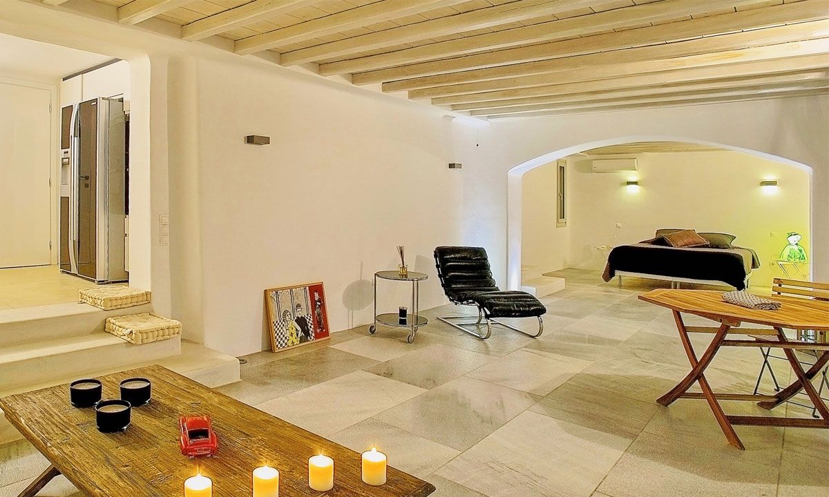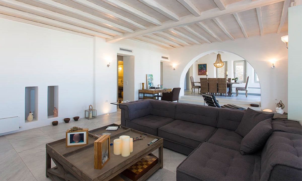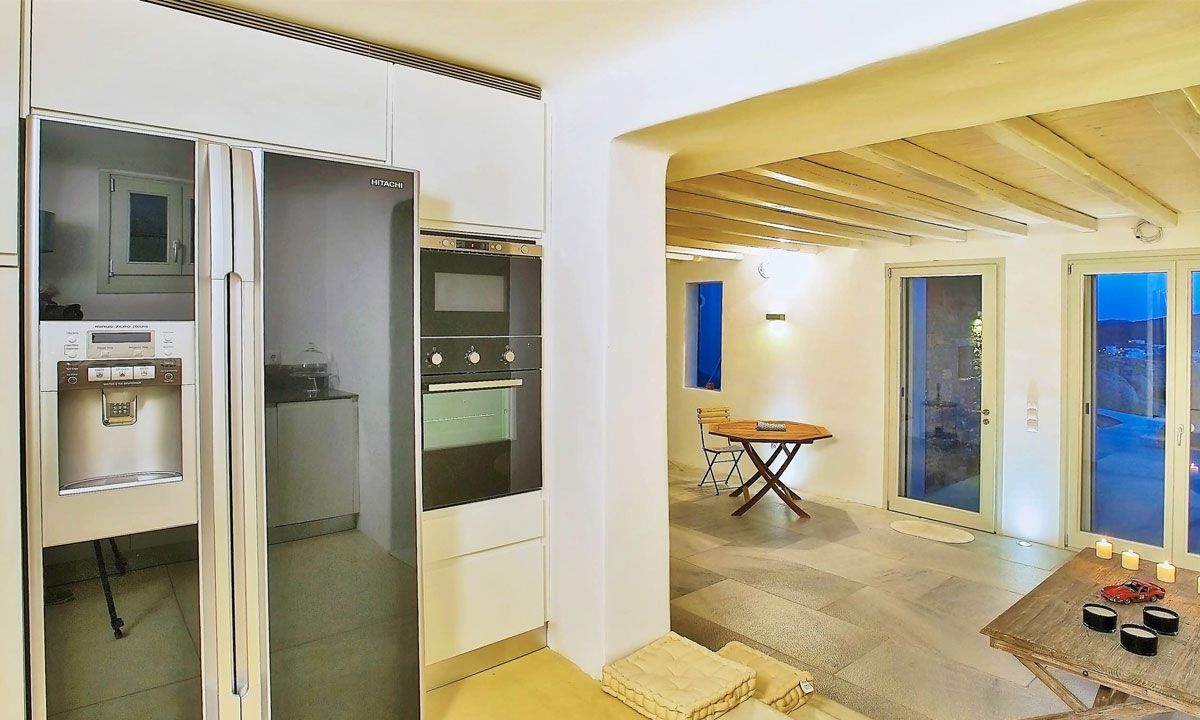 Indoor and outdoor luxury is foremost in this villa to delight in Mykonos style. The grand covered outdoor terrace commands a spectacular view which you can enjoy seated in the comfortable outdoor living area. Inside, enjoy casual snacks or morning coffee at the breakfast table next to the modern kitchen. Fully equipped, the kitchen has everything you need to prepare a feast for your guests. The indoor dining area and living room are open and spacious with windows and doors which open to the view.