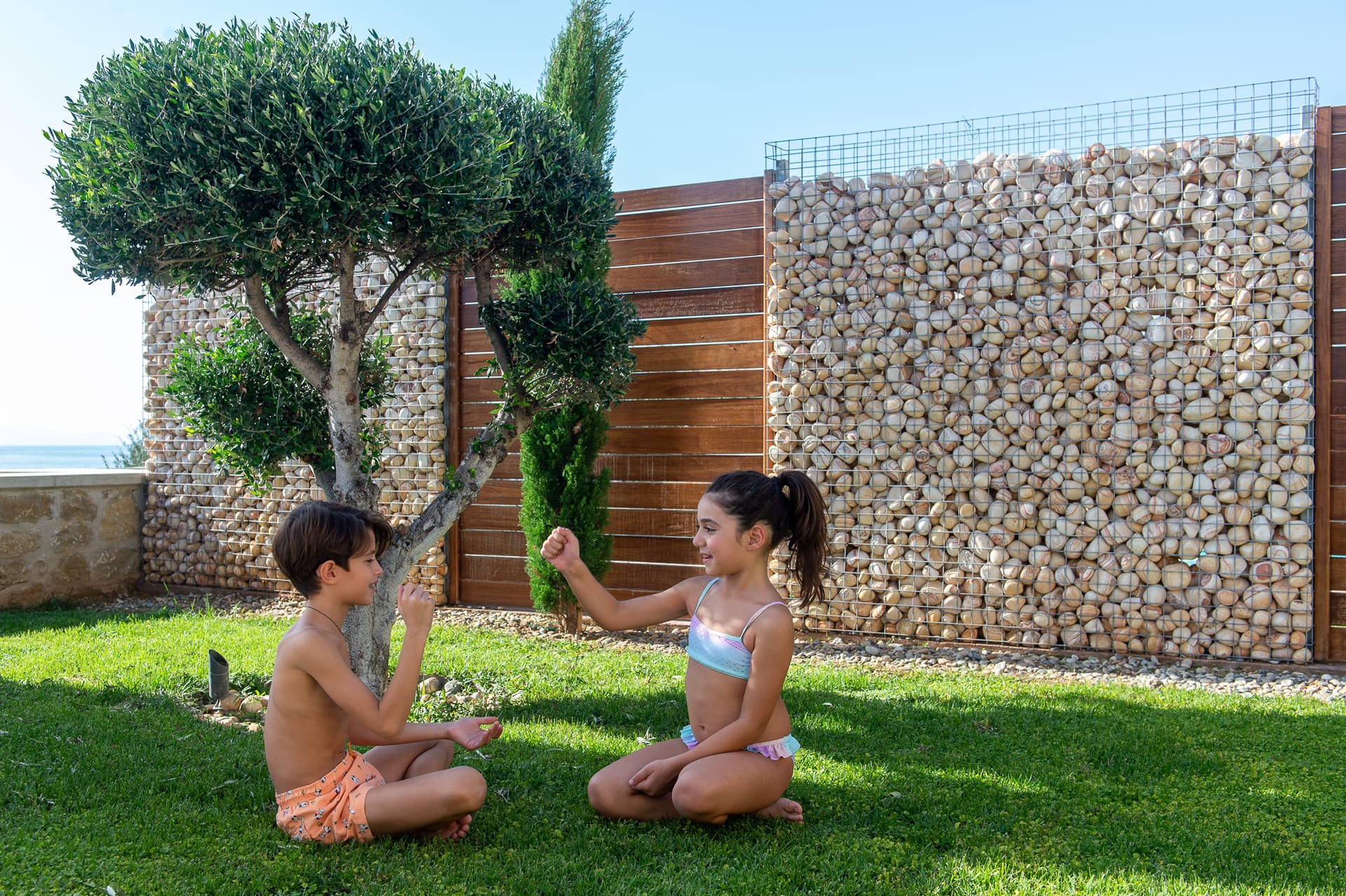 Latters are surrounded by spacious sun decks setting which includes large outdoor and pergola shaded lounge areas equipped with comfortable sofas with cushions sun beds deck chairs paired with a large dining table which predisposes guests to enjoy a delicious meal or cocktail while watching the majestic sunrise, listening to the sounds of the sea and overlooking The Aegean sea . The excellent landscaped garden is filled with a selection of flowers calming the senses and creating a romantic atmosphere of relaxation and wellness.