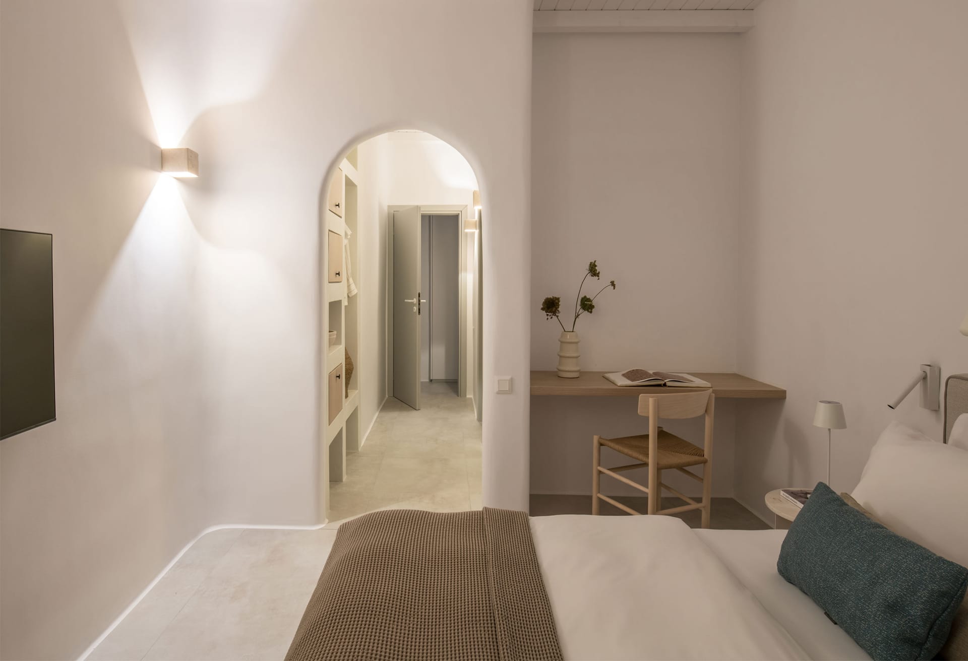 Mykonos Villa Moonlight 1 entrance level accommodates a fully equipped indoor kitchen, including a professional wine cooler; right beside the entrance door is a bright dining area, discreetly separated from the lounge and its long, furnished outdoor veranda, which faces the spectacle of Mykonos town in the far distance. This level further includes one ensuite bedroom, with three more quietly placed one level down. The master suite occupies the entire upper floor, with a private terrace overlooking the sparkling Aegean Sea and Mykonos town, under the open skies. The minimalist interior design features gentle curves and a delicate, off-white pressed cement facing on the floors, complemented with natural oak cabinetry, bright white wooden ceilings, and fine linen curtains. Original furniture from exclusive international brands graces all the rooms, including a fabric-upholstered Raffles sofa by De Padova, and the iconic Chandigarh easy chair of Cassina, designed by Pierre Jeanneret in solid teak and hand-woven straw.